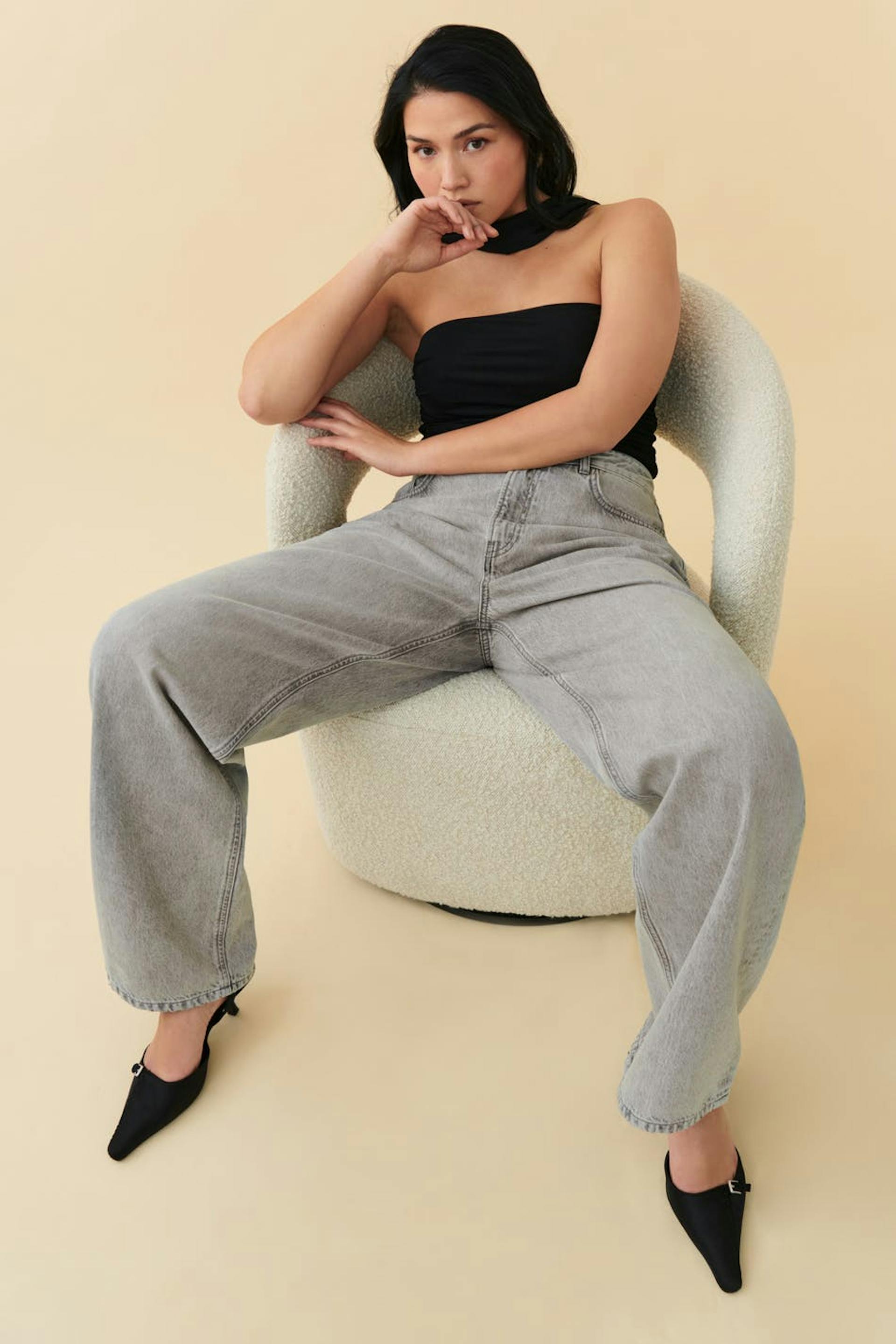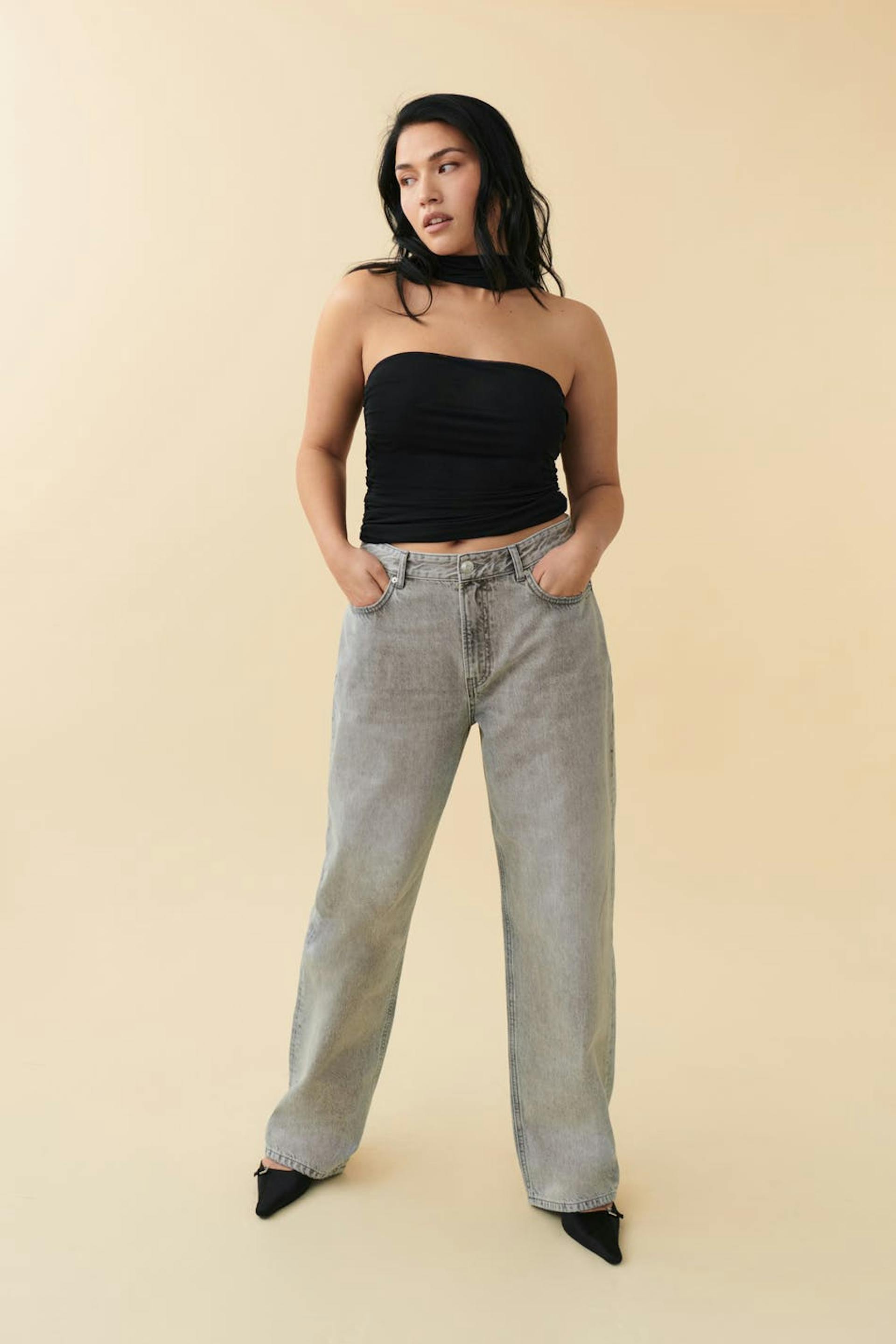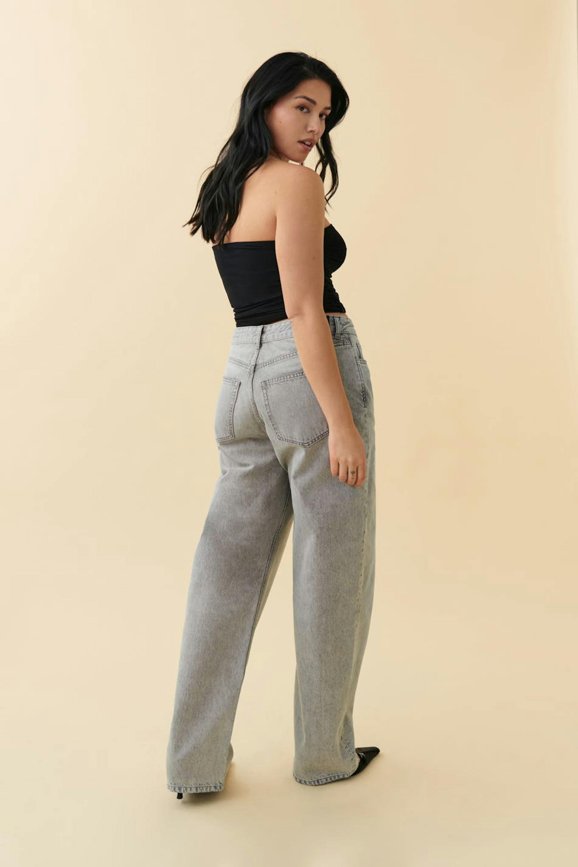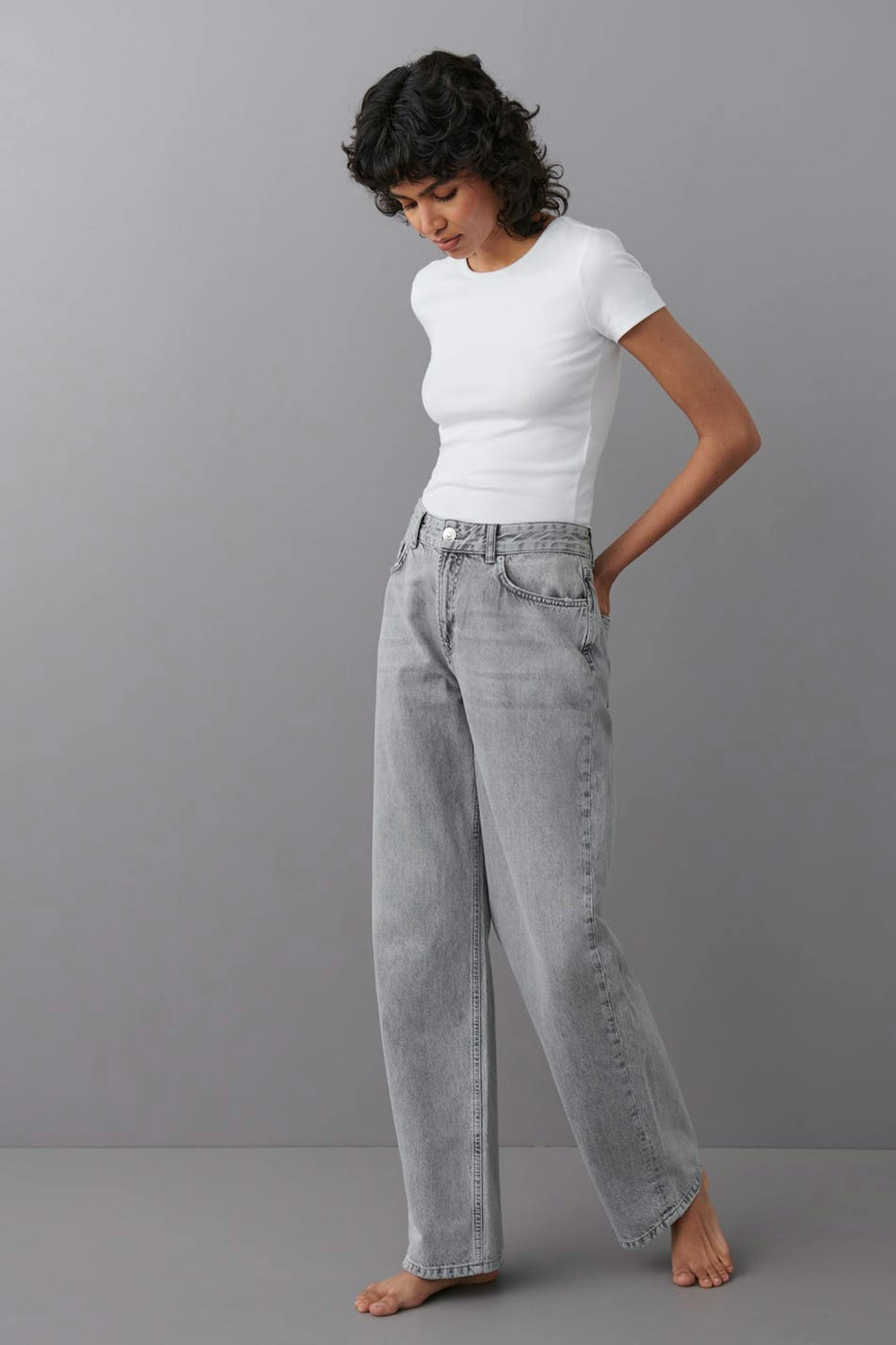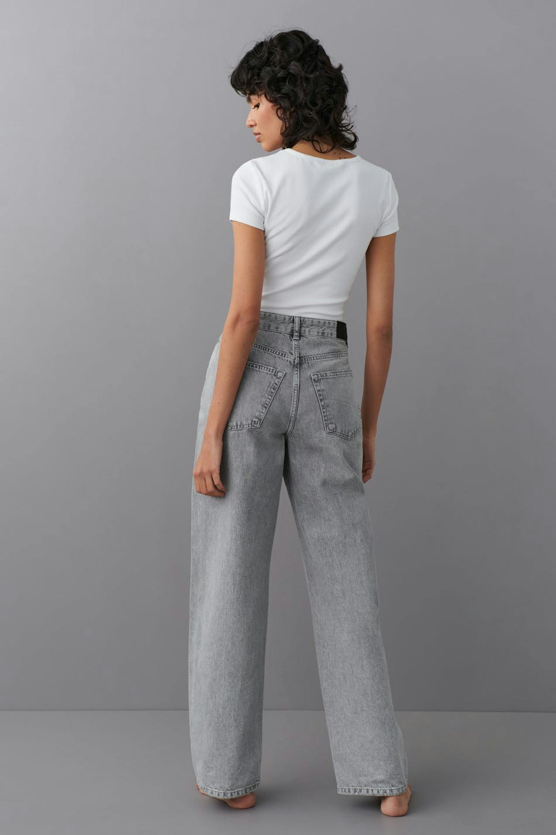 Jeans with loose-fitting style. The jeans are grey and have mid waist in non-stretch denim. They have wide legs with full length, zip fly and pockets at the front and back.
