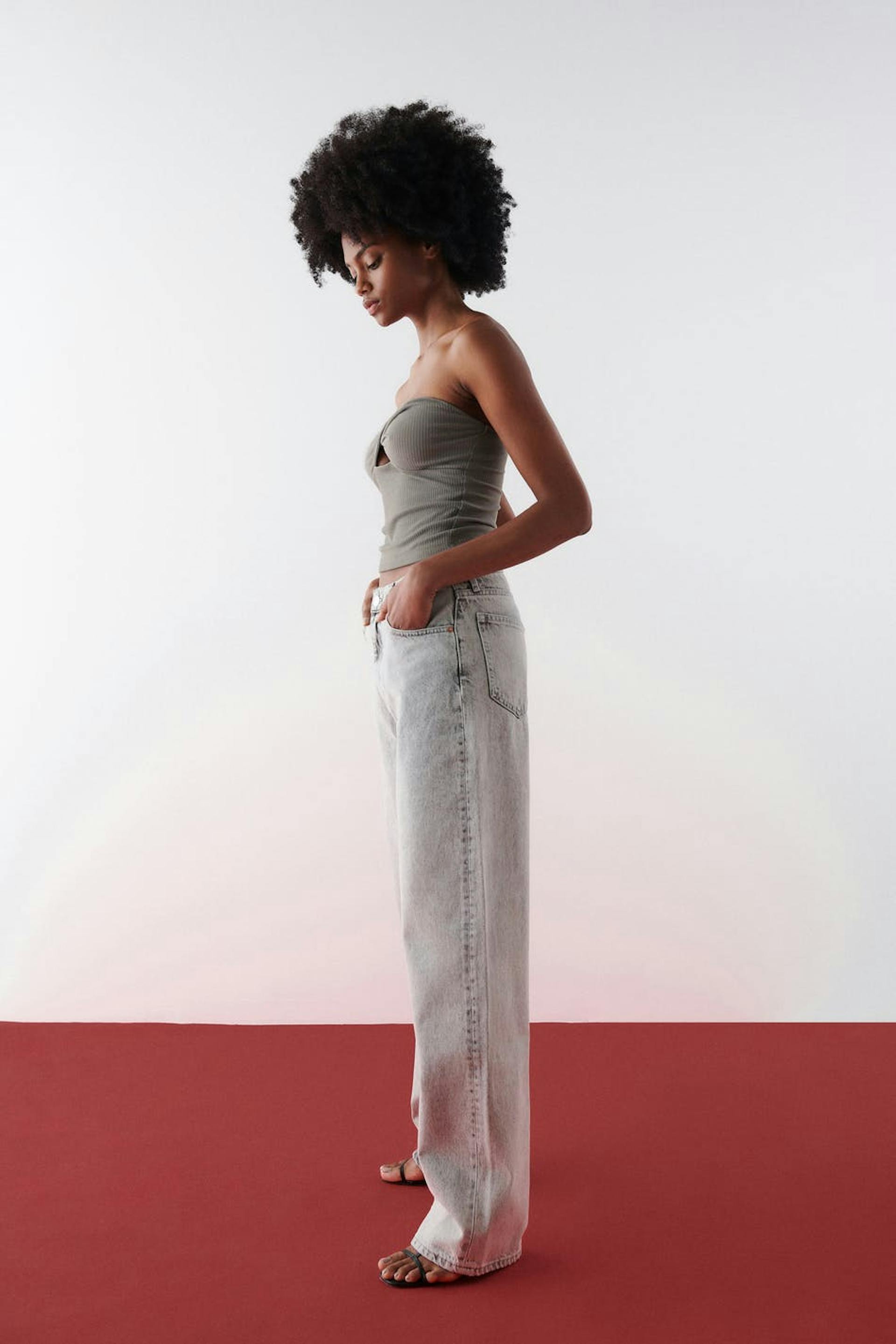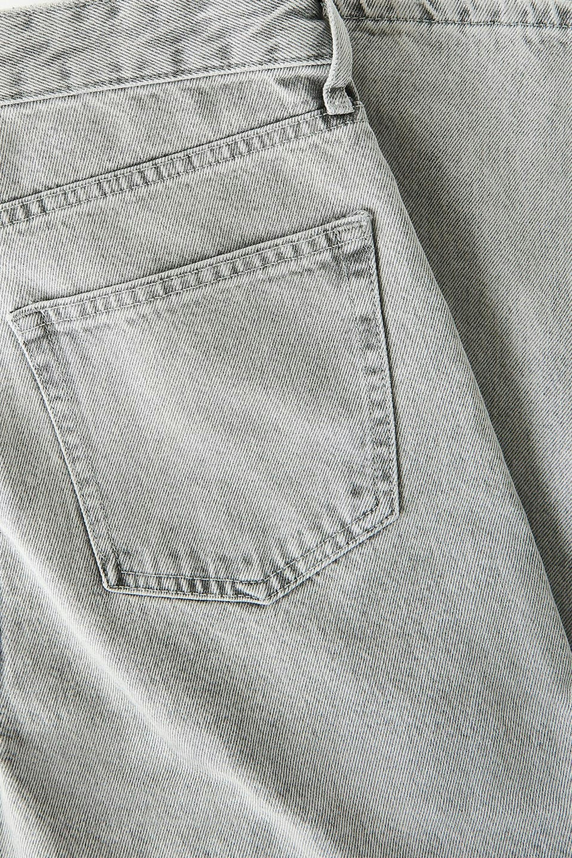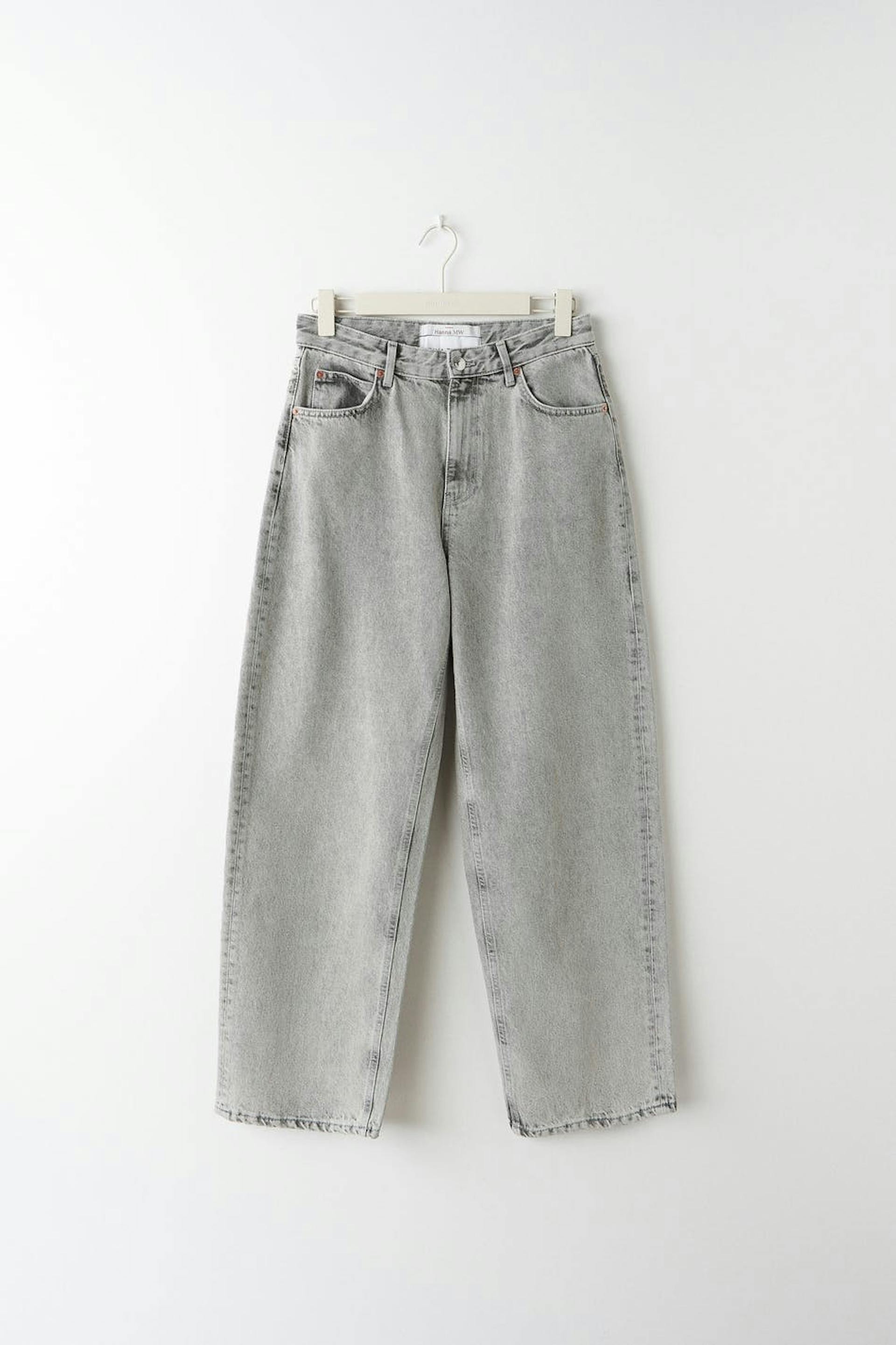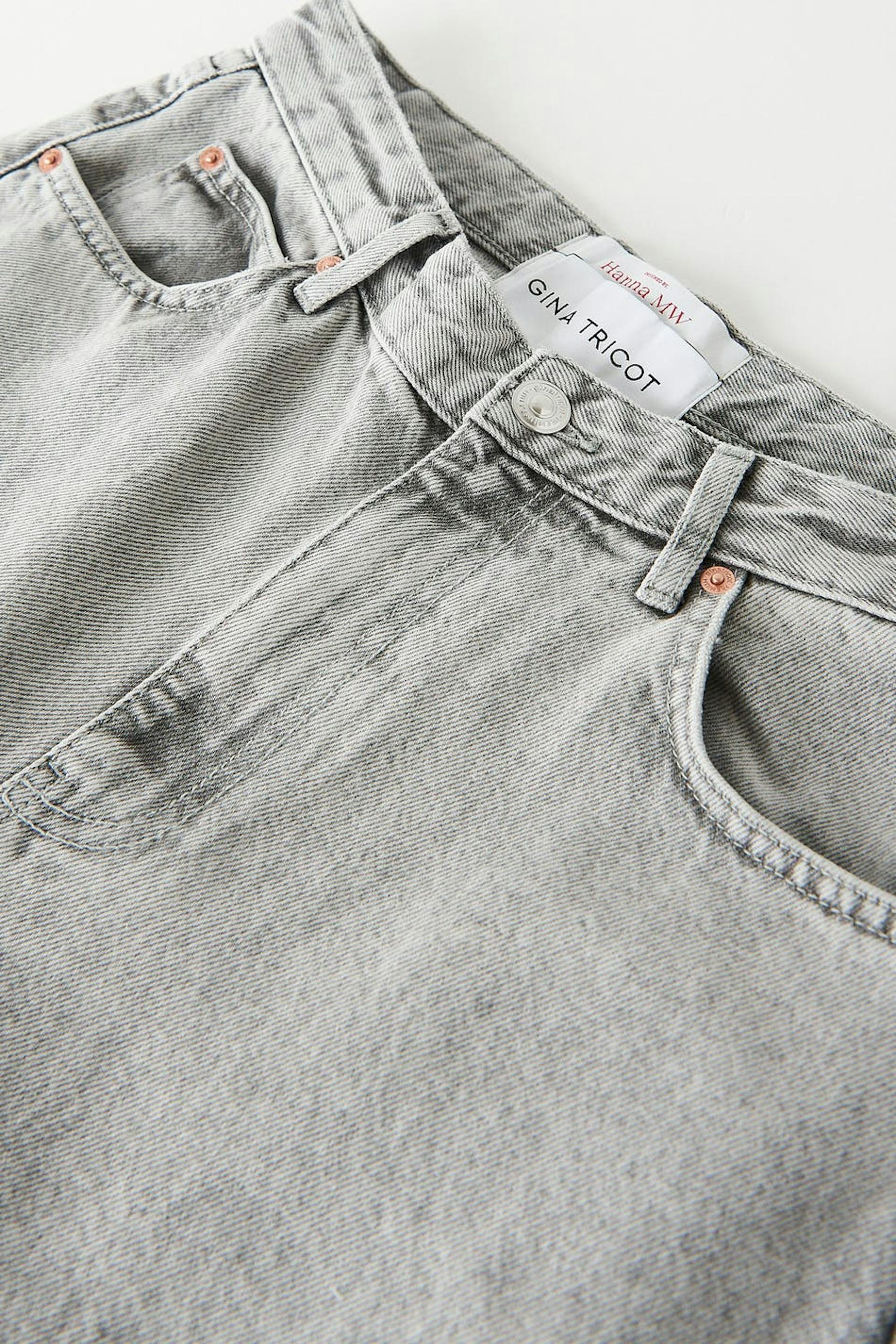 Hanna MW X Gina Tricot. Loose jeans with an oversize fit in non-stretch denim. The jeans is grey and has mid waist. It has a button fly closure, straight legs with full length and pockets at the front and back. The jeans are produced from fabric remnants and refashioned jeans.