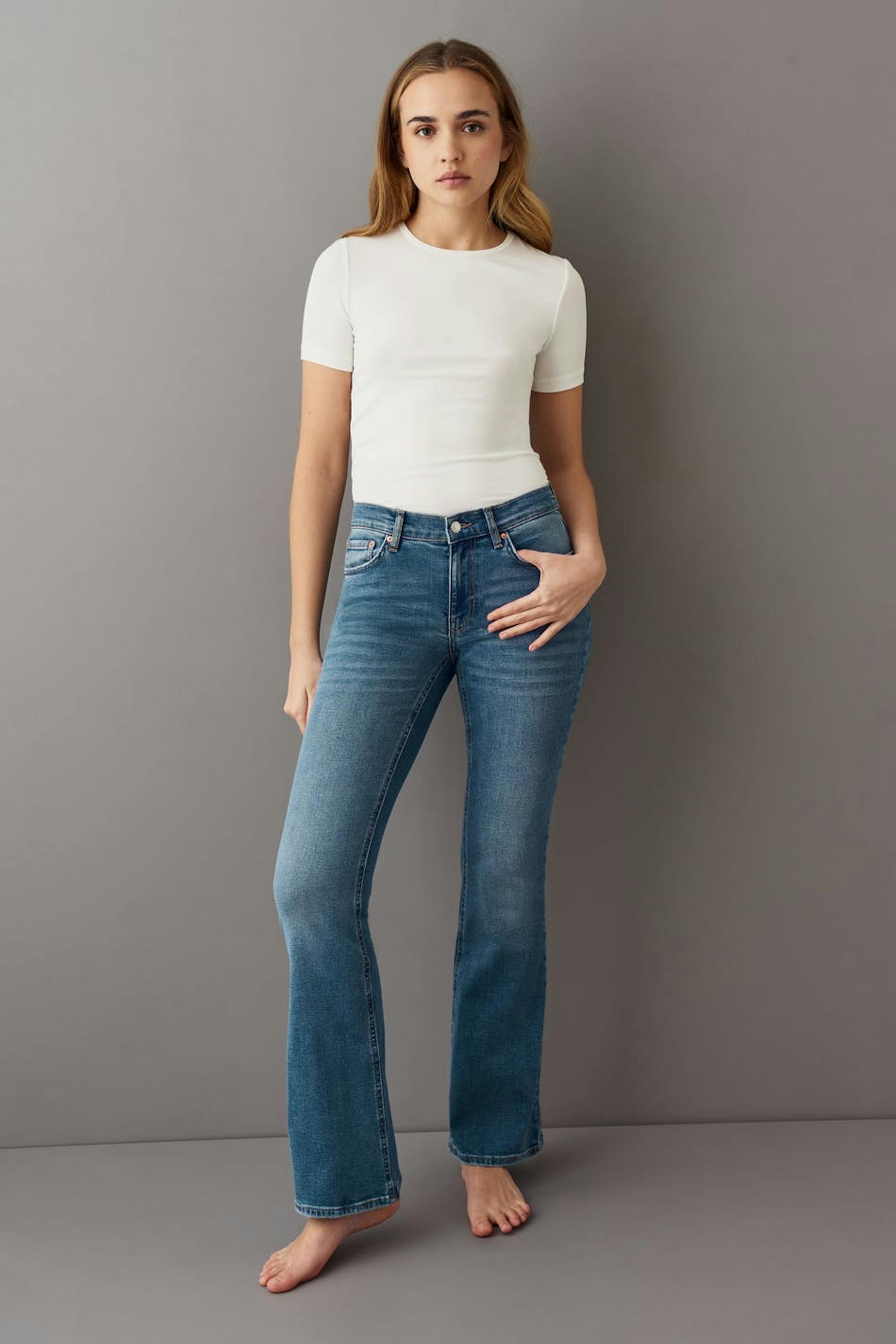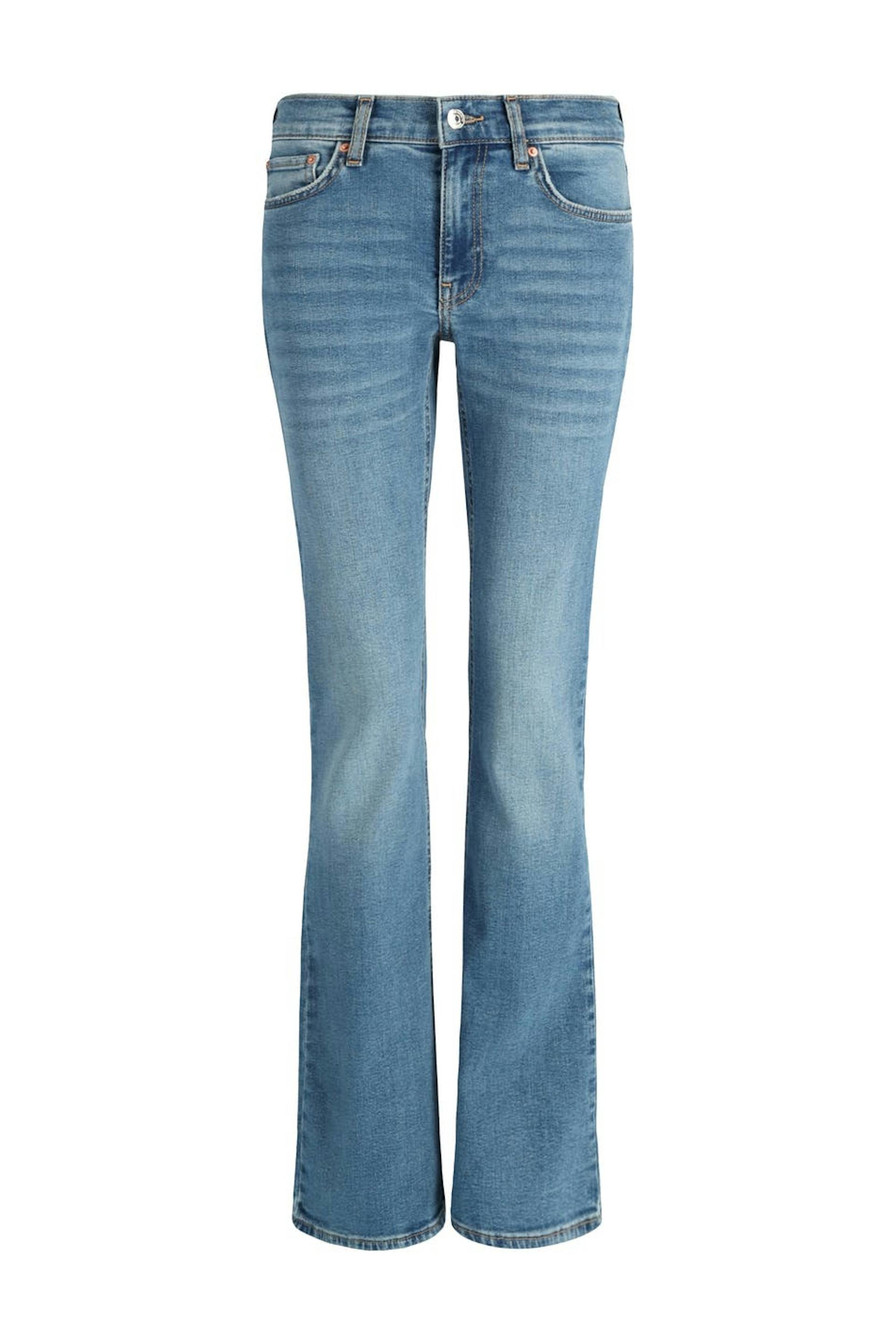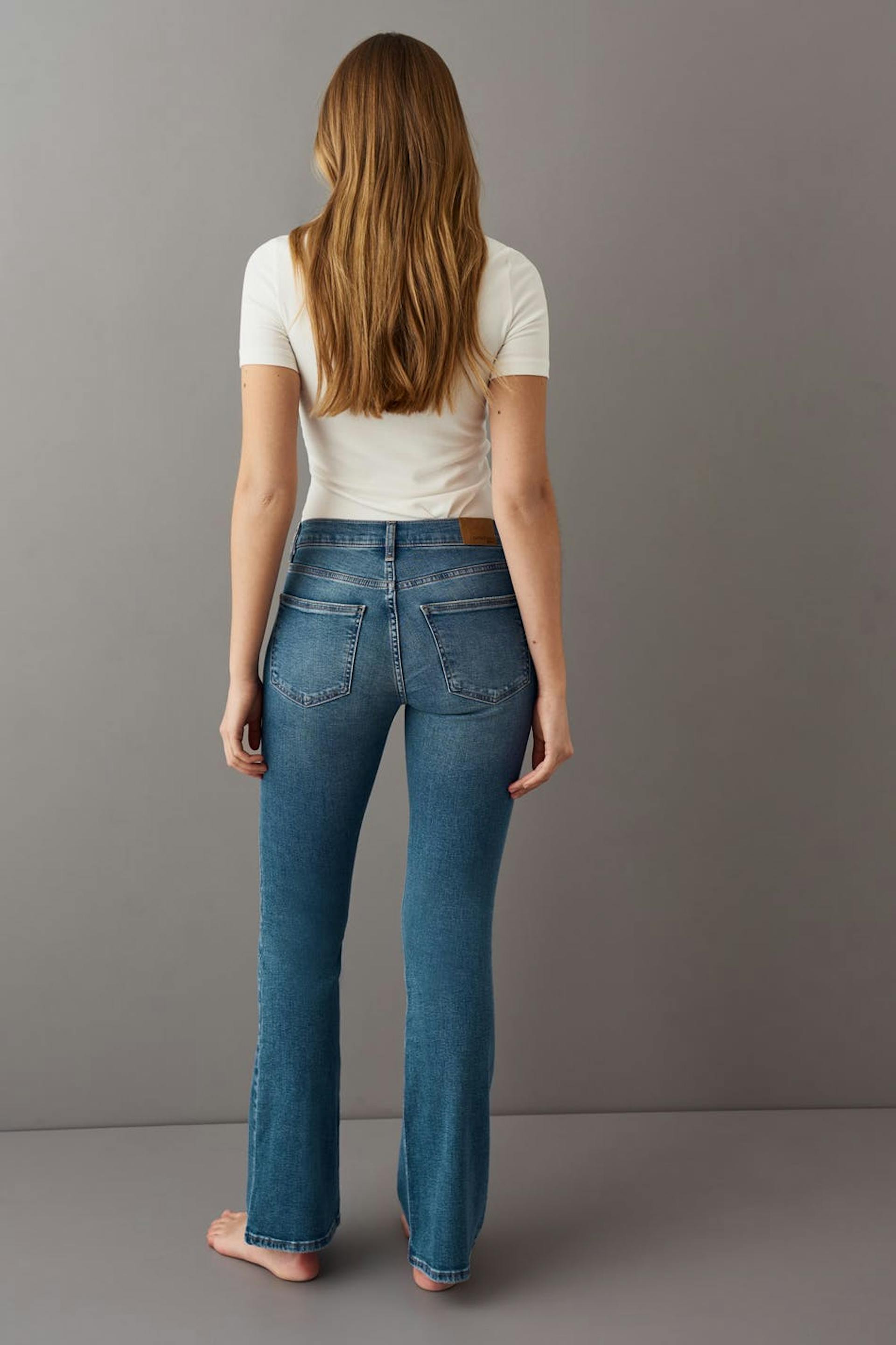 Boot cut jeans with low waist. The jeans are blue and have flared legs with regular length. They have zip fly, low stretch and pockets at the front and back. Perfect for those who are 175 cm (5 ft 9 in.) or taller. Use our size guide to find your size.