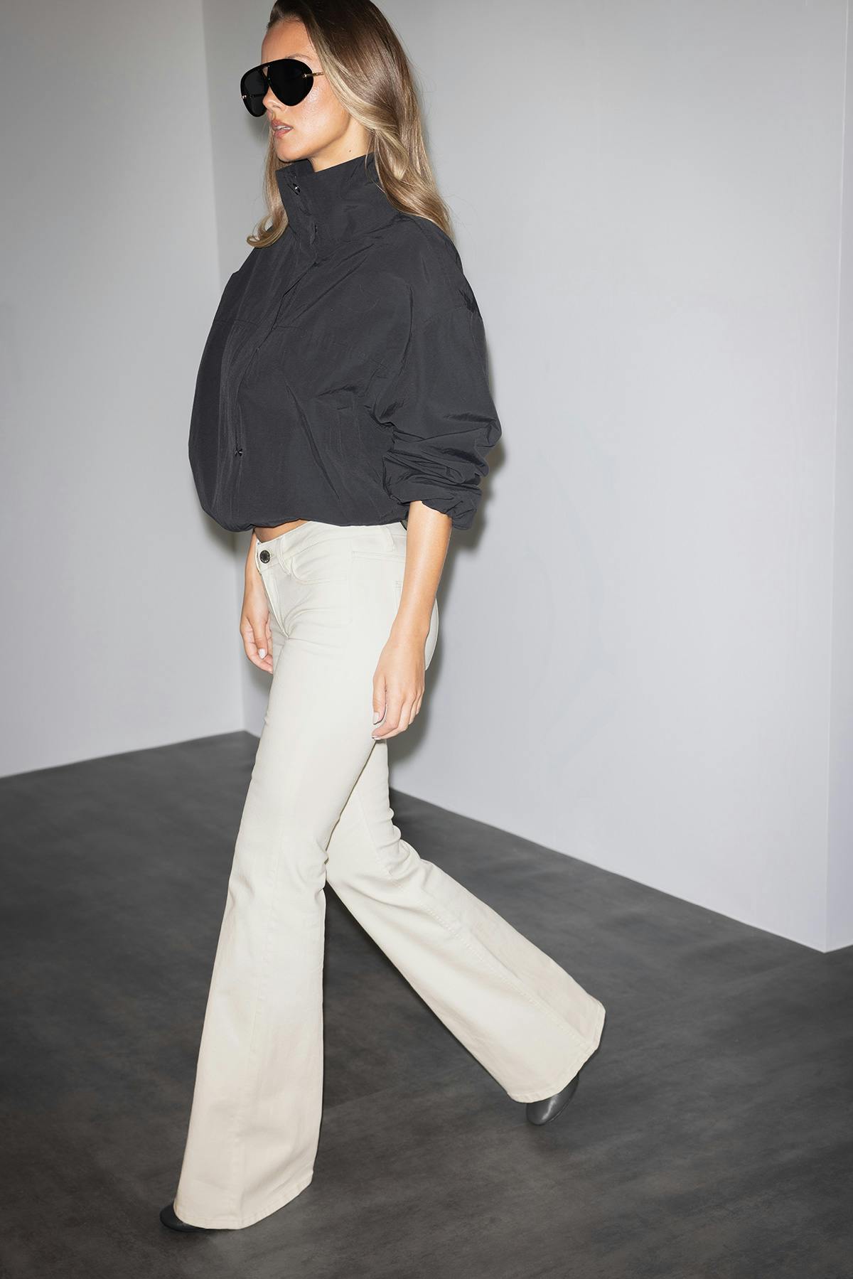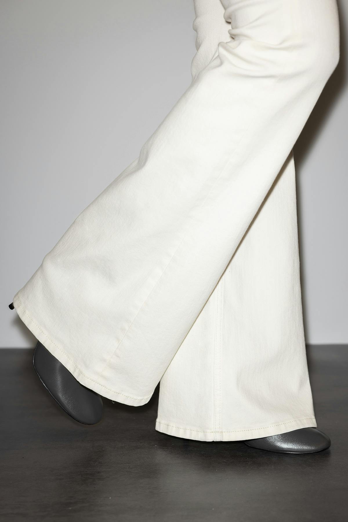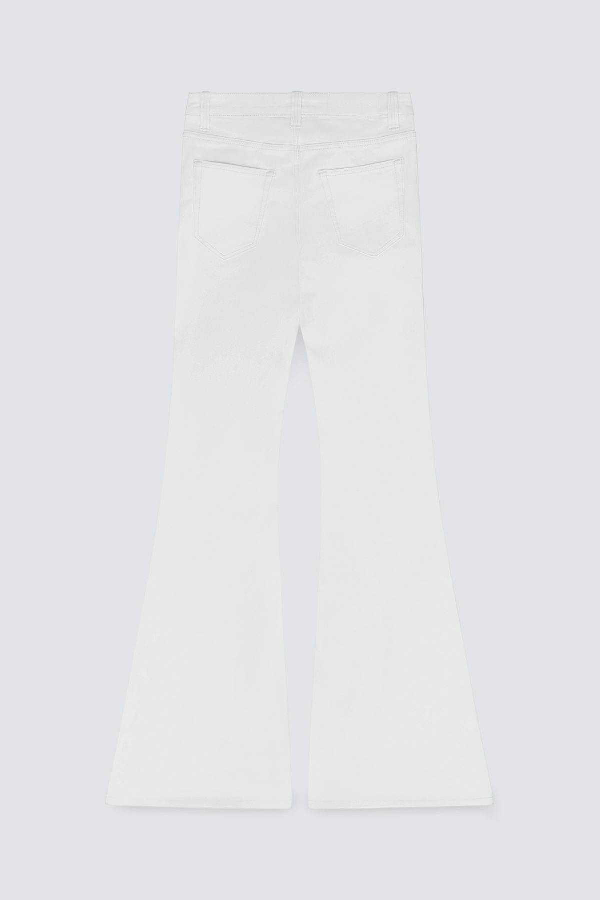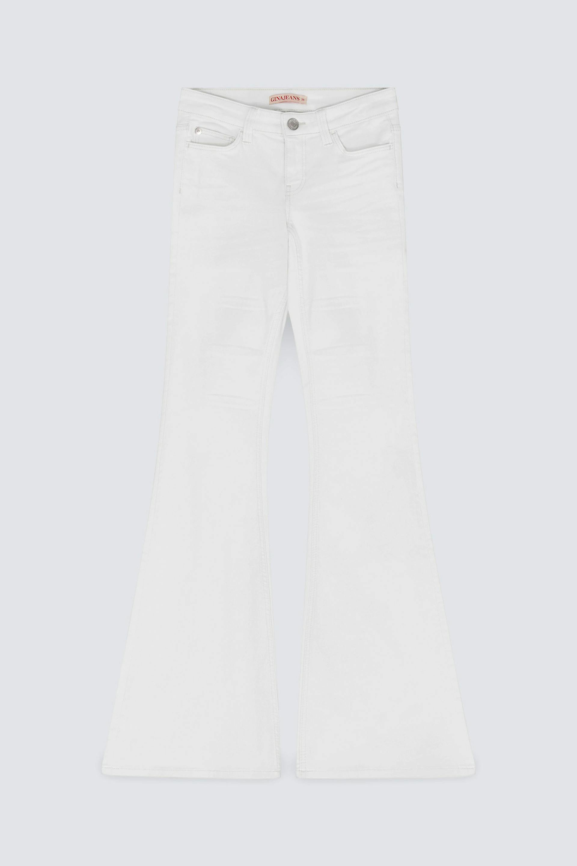 Low waist jeans with a stretch and long, flared legs. The jeans are off-white and have figure-hugging fit. They have zip fly, pockets at the front and back and belt loops. Use our size guide to find your size.