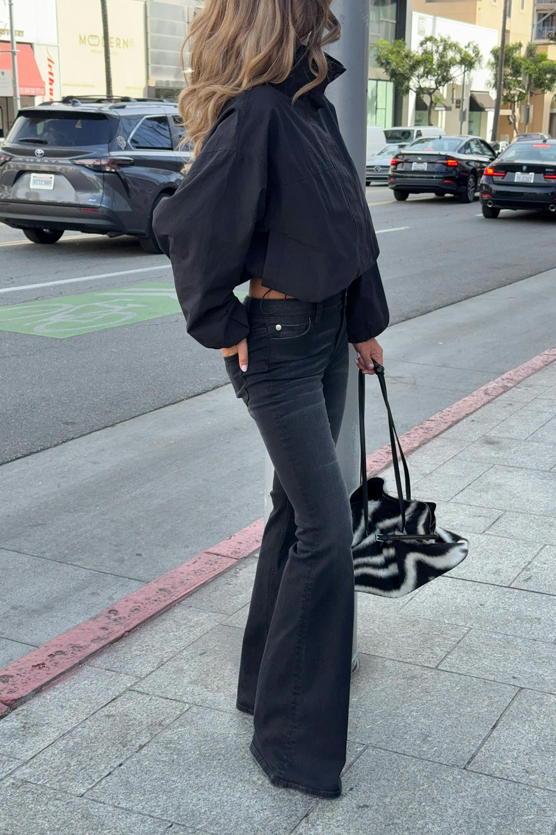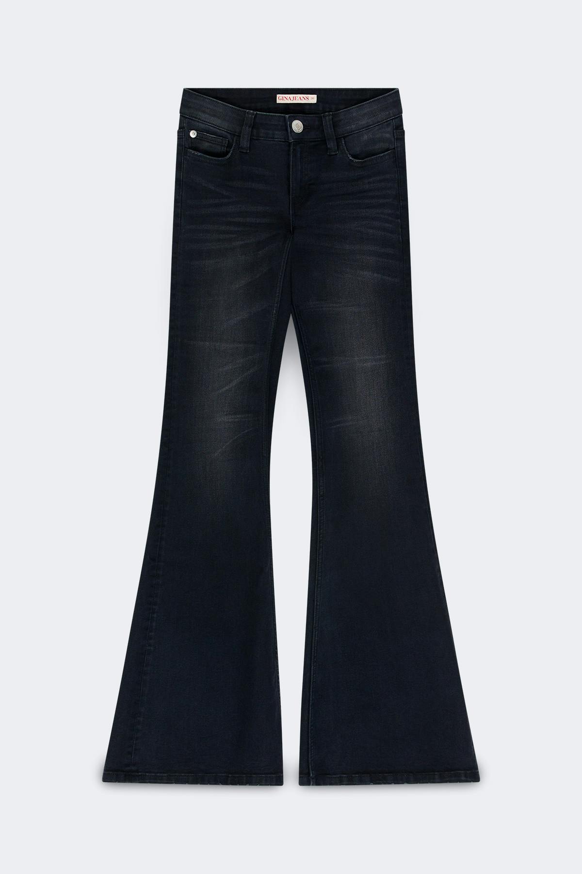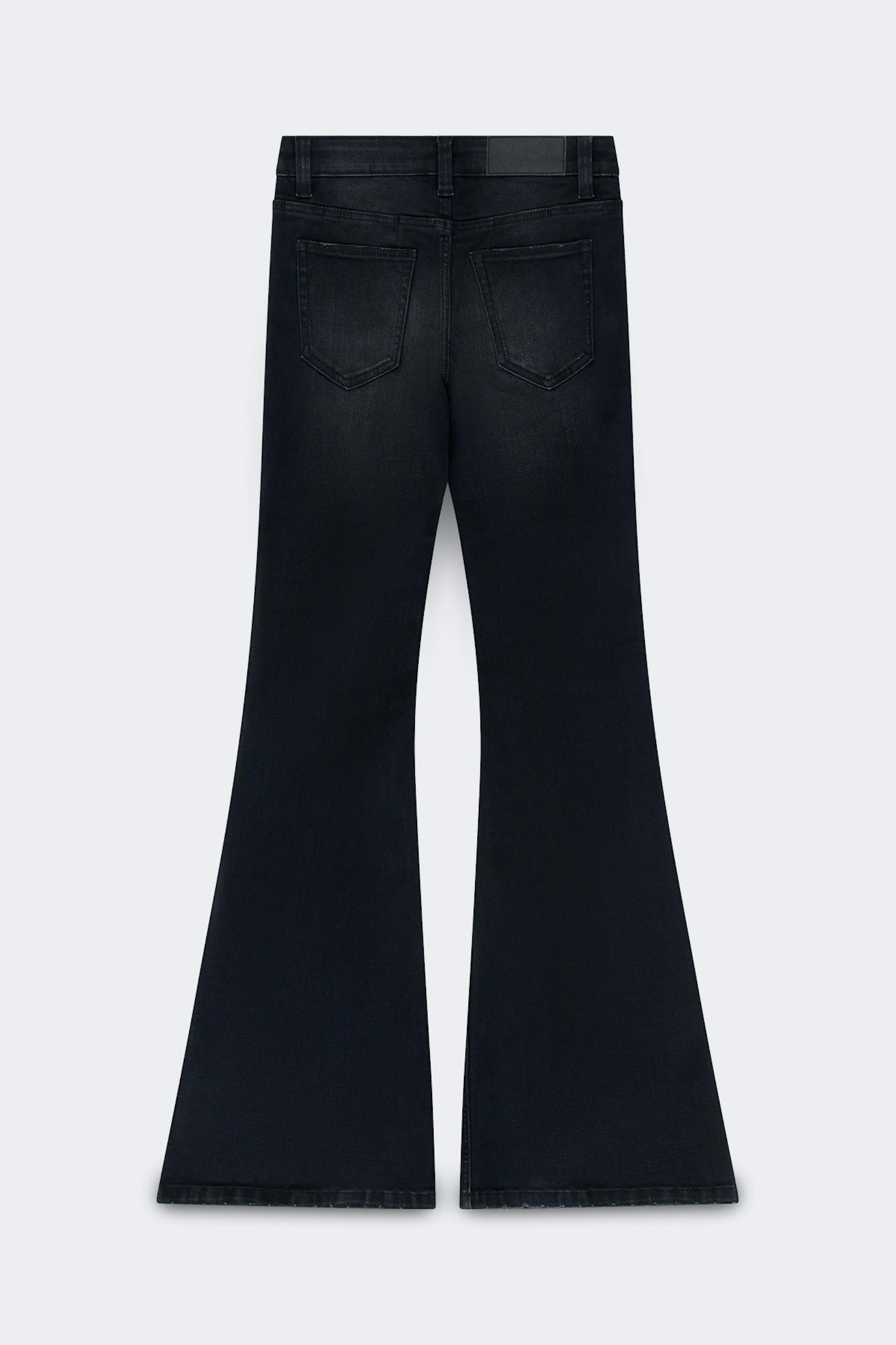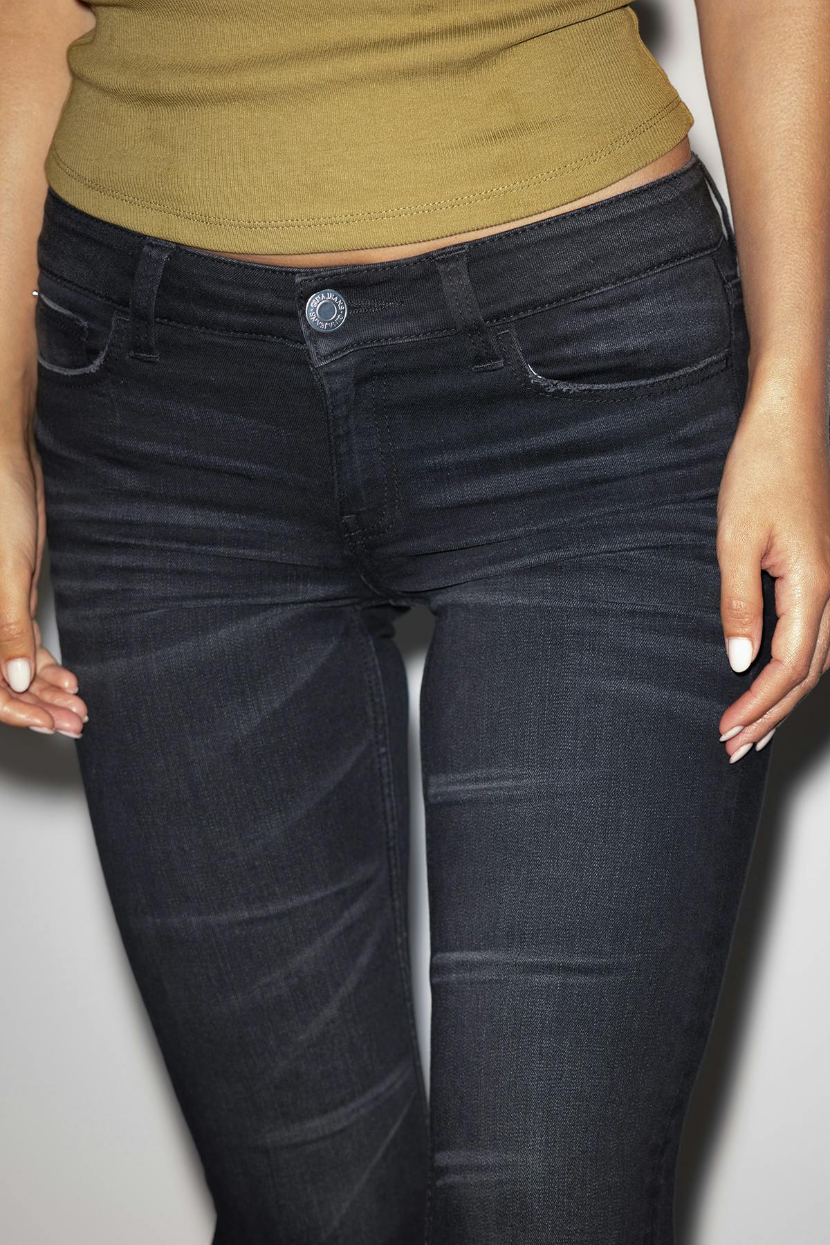 Low waist jeans with a stretch and long, flared legs. The jeans are black and have figure-hugging fit. They have zip fly, pockets at the front and back and belt loops. Use our size guide to find your size.