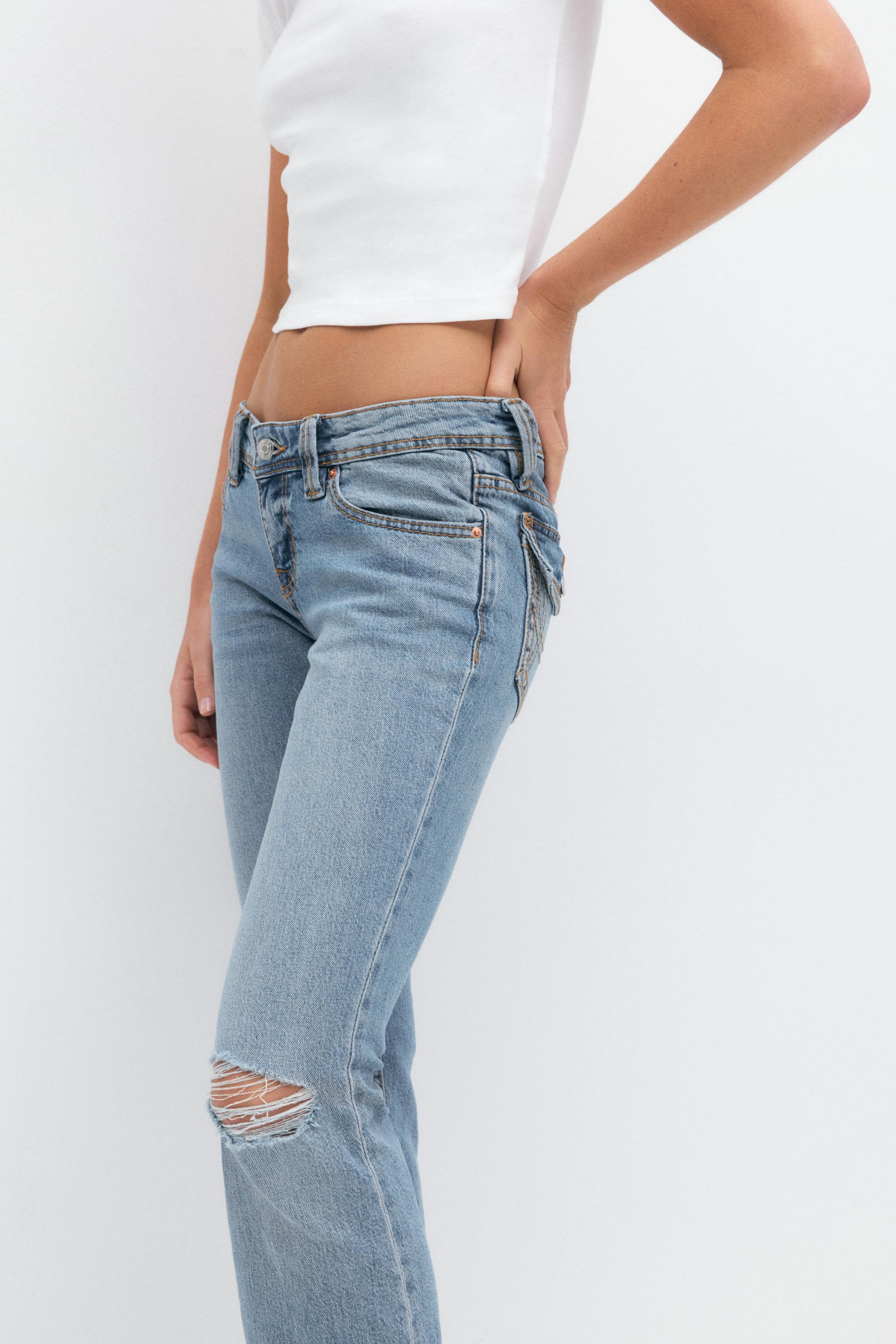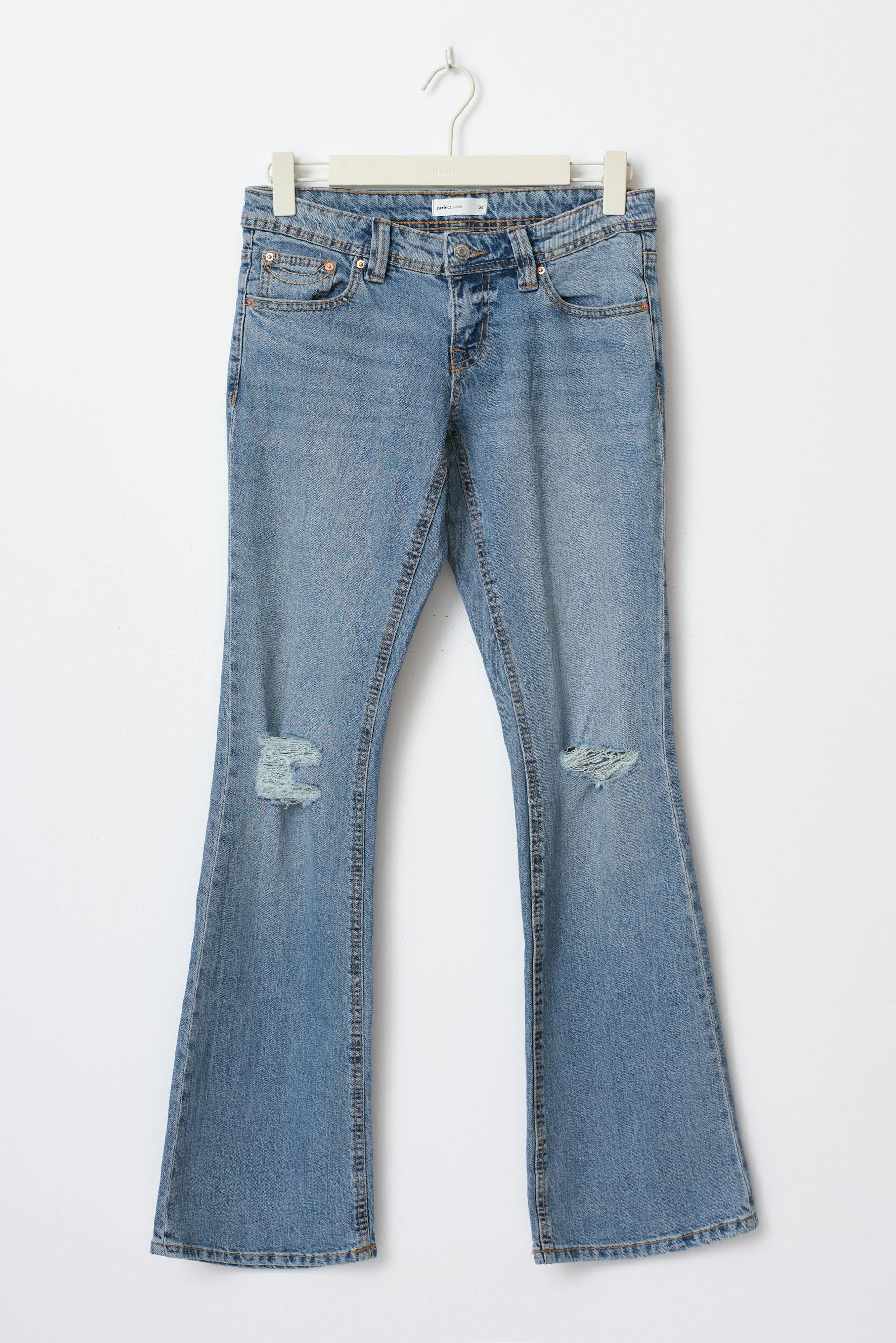 Boot cut jeans with ripped knees. The jeans are blue and have low waist. They have figure-hugging fit, stretchy quality, flared legs with regular length, zip fly, belt loops, front pockets and embroidered back pockets with flaps and button.