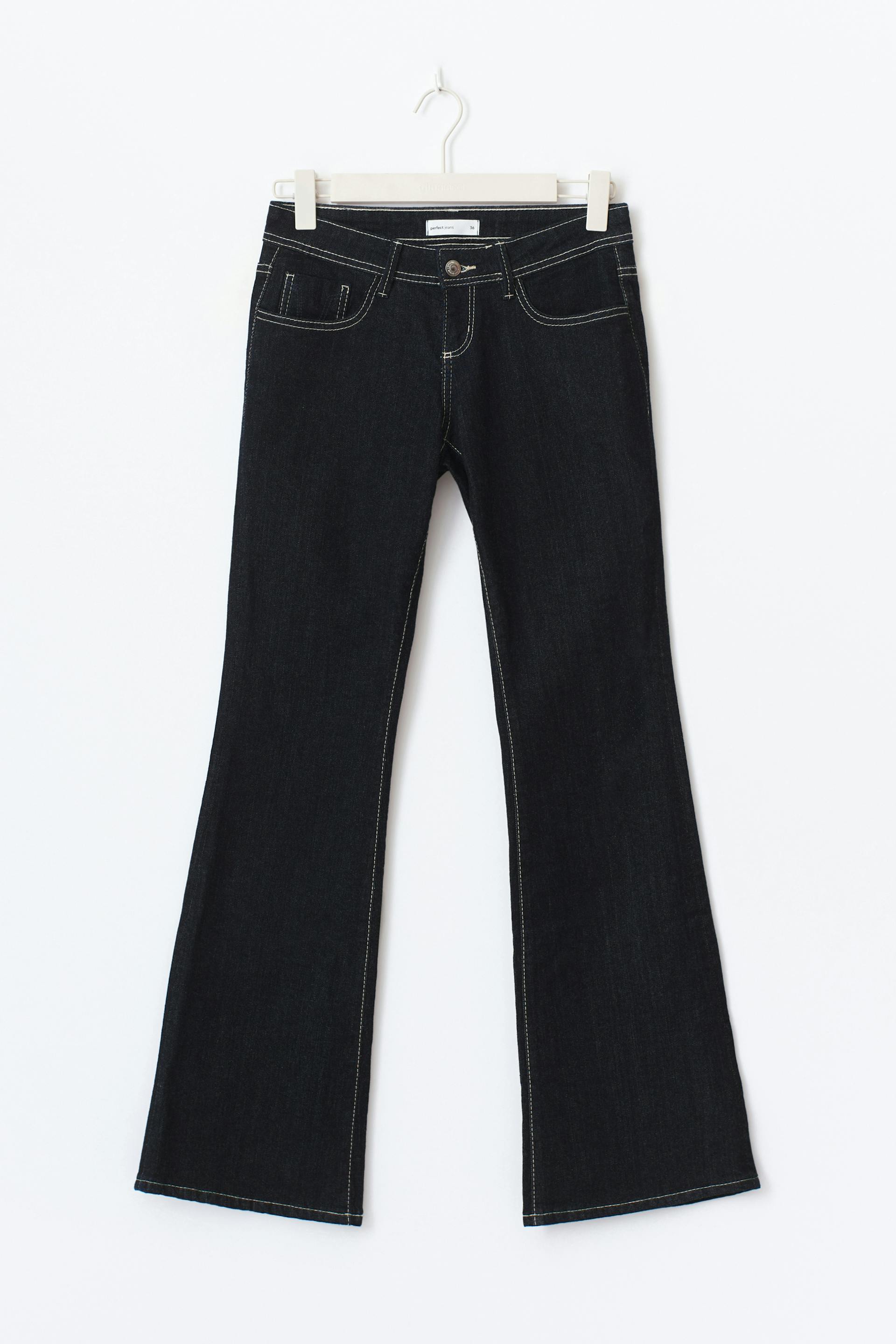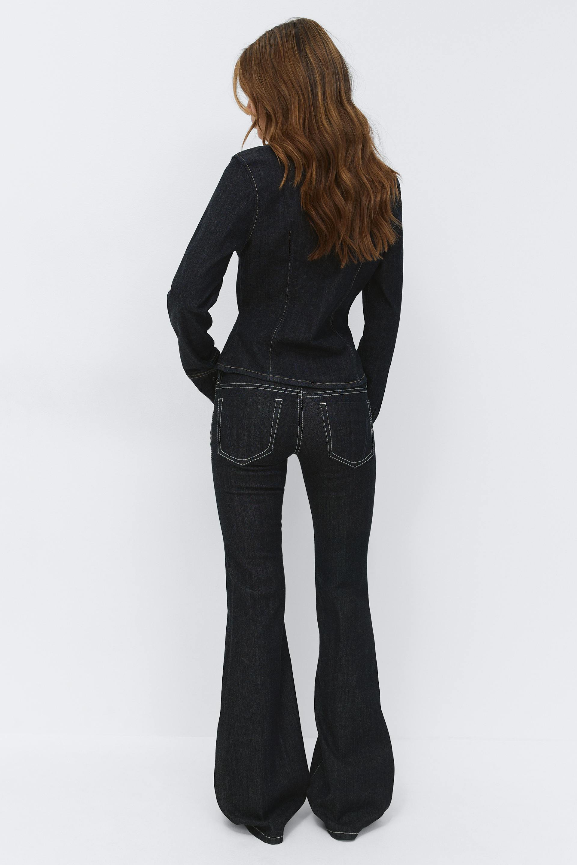 Flare jeans with low waist. The jeans are dark blue and have flared legs with regular length. They have figure-hugging fit, decorative seams, zip fly, belt loops, stretchy quality and pockets at the front and back. Use our size guide to find your size.