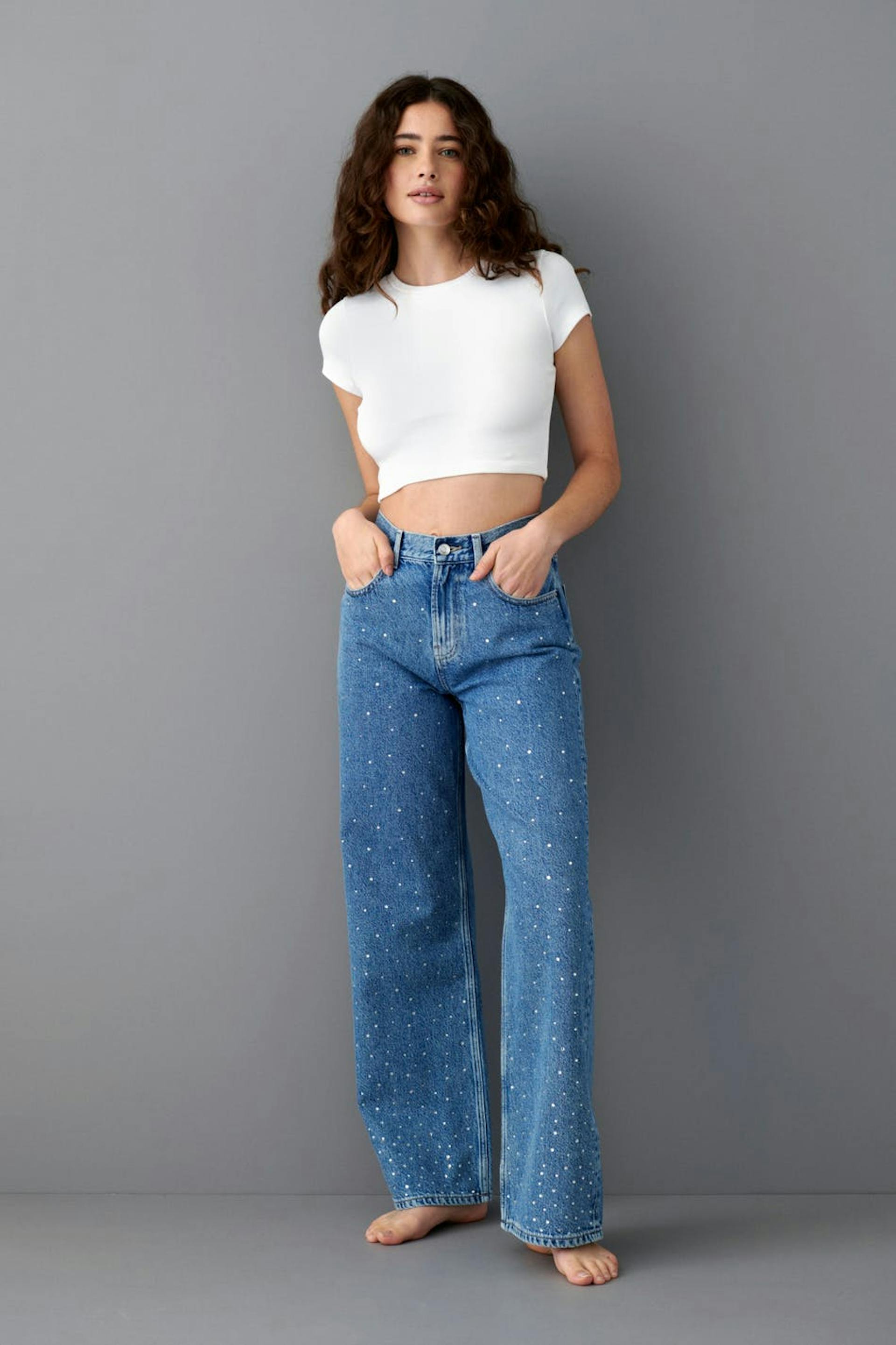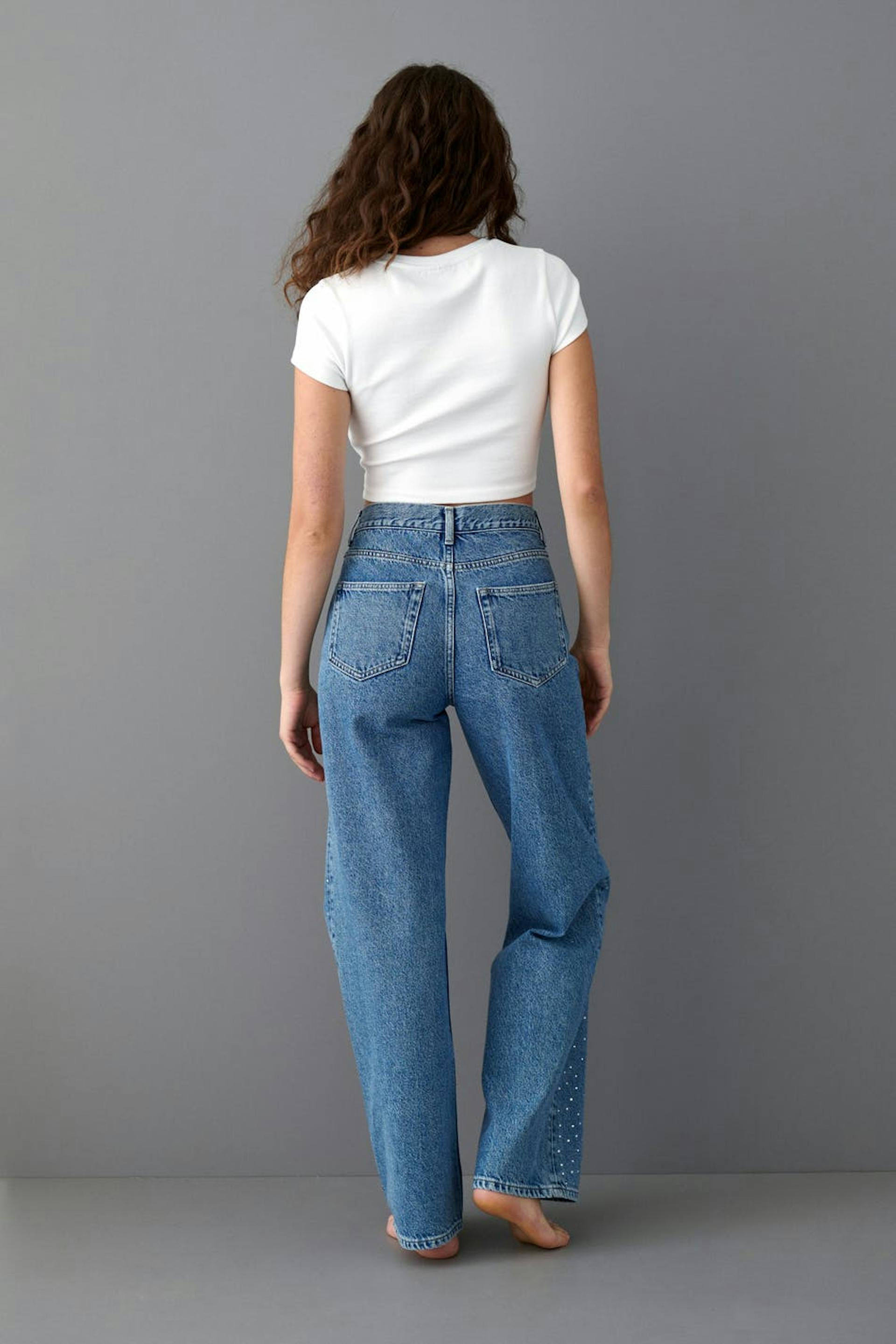 Straight jeans with mid waist. The jeans are blue and have loose, relaxed fit in non-stretch denim. They have leg with full length, decorative stones at the front, zip fly and pockets at the front and back. Use our size guide to find your size.