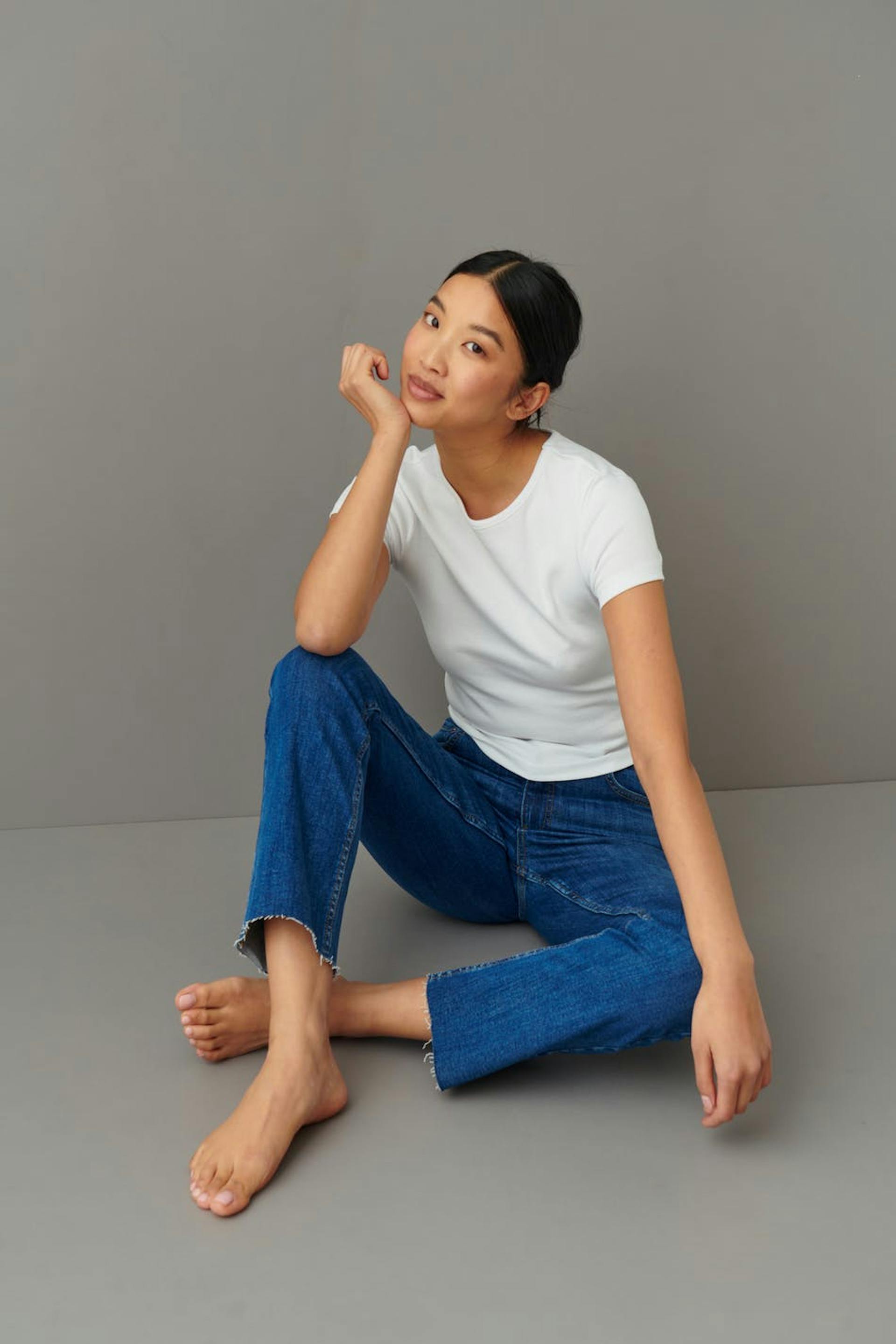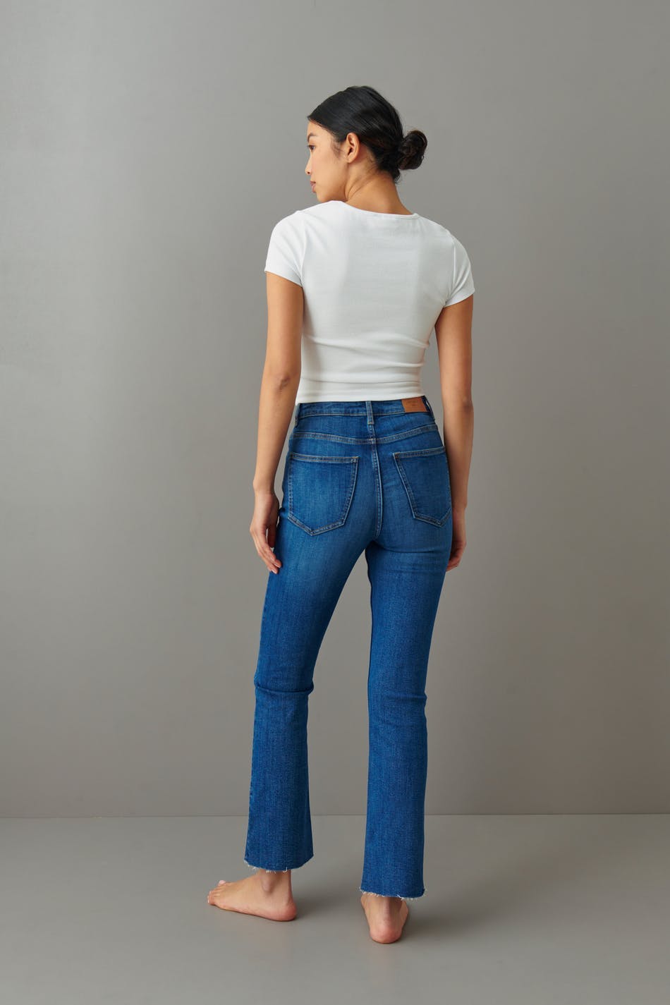 Flare jeans with mid waist. The jeans are blue and have a fitted fit in stretch denim. They have zip fly and cropped, slightly flared legs with raw edges at the end of the legs. Use our size guide to find your size.