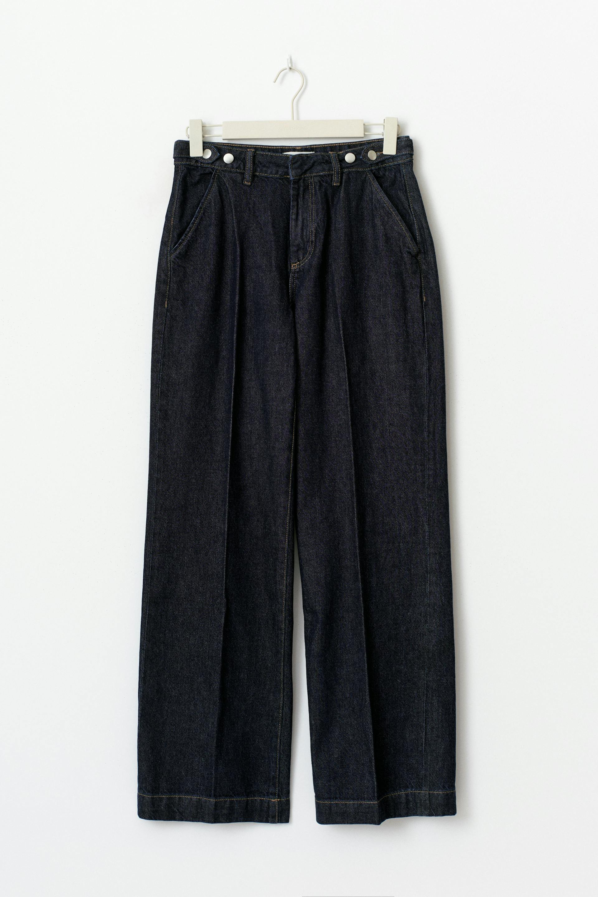 Wide jeans with creases. The jeans are dark blue and have mid waist. They have side pockets, back pockets with flap and button, wide legs with full length, zip fly and regular fit. Non-stretch. Use our size guide to find your size.