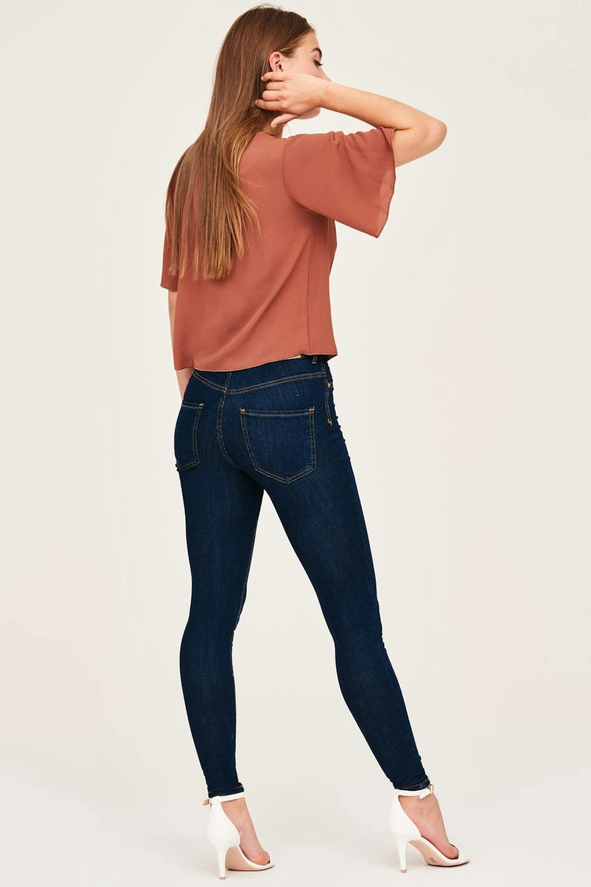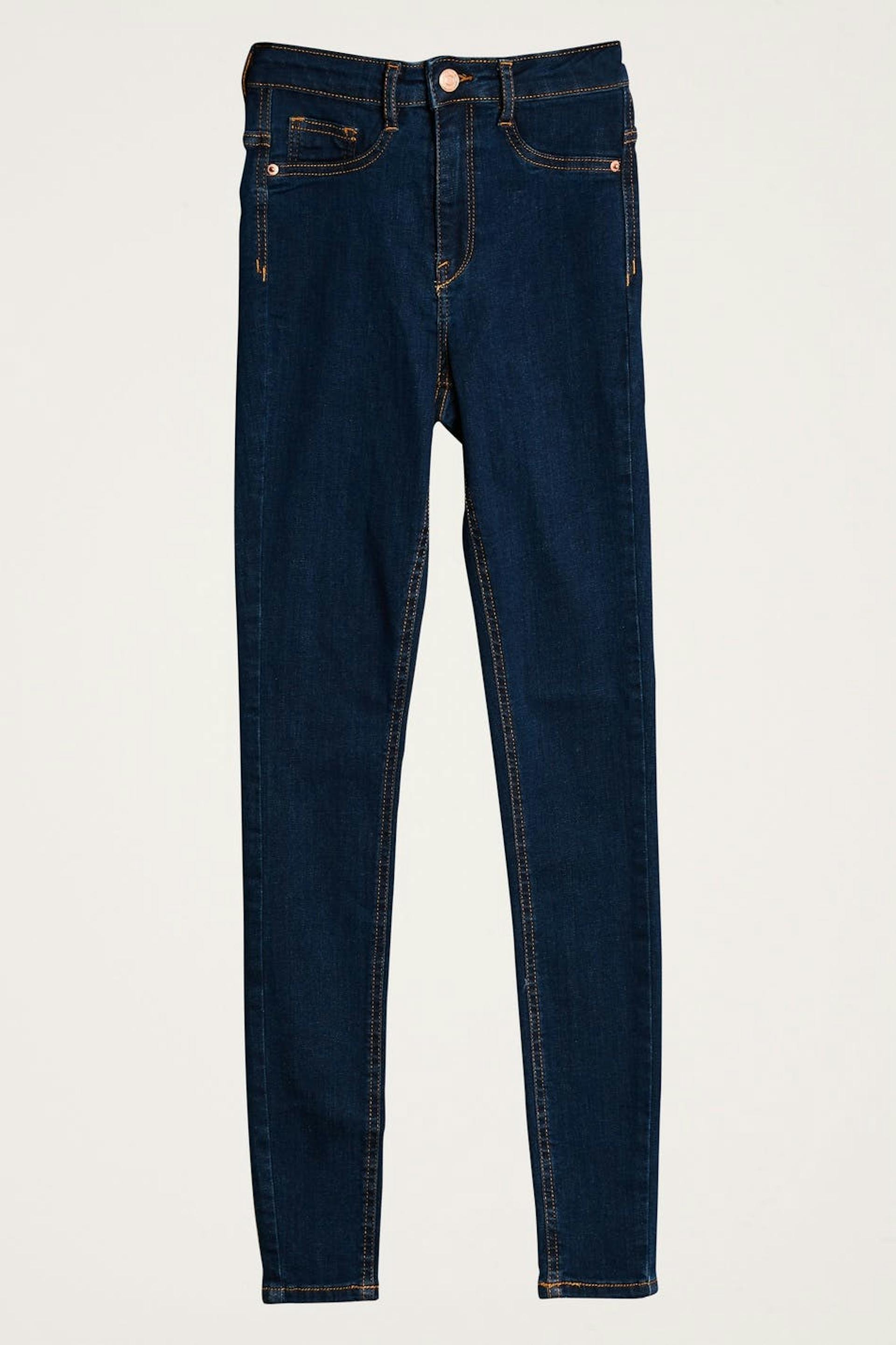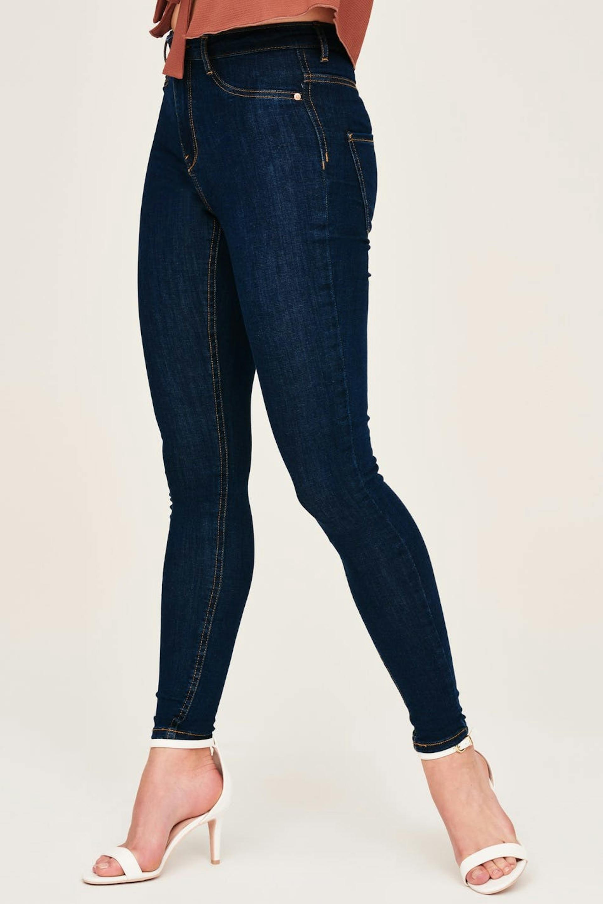 Soft highwaist jeans with a fitted fit. The jeans is dark blue and comfortable and has a skinny fit. It has a superstretch, a high waist and fake pockets at the front.