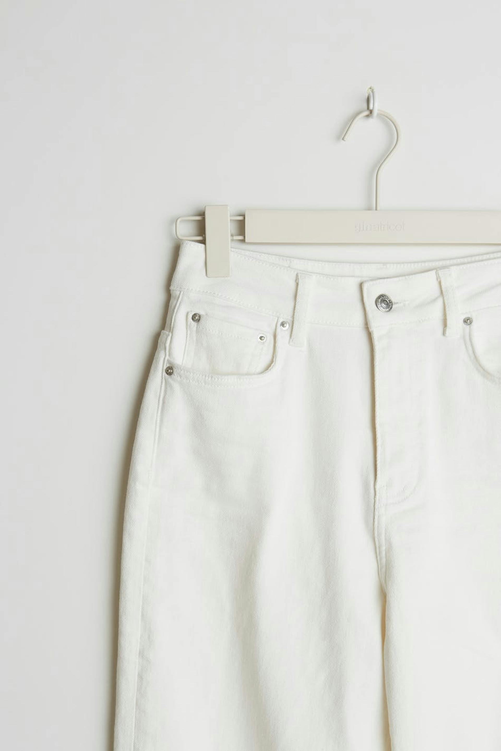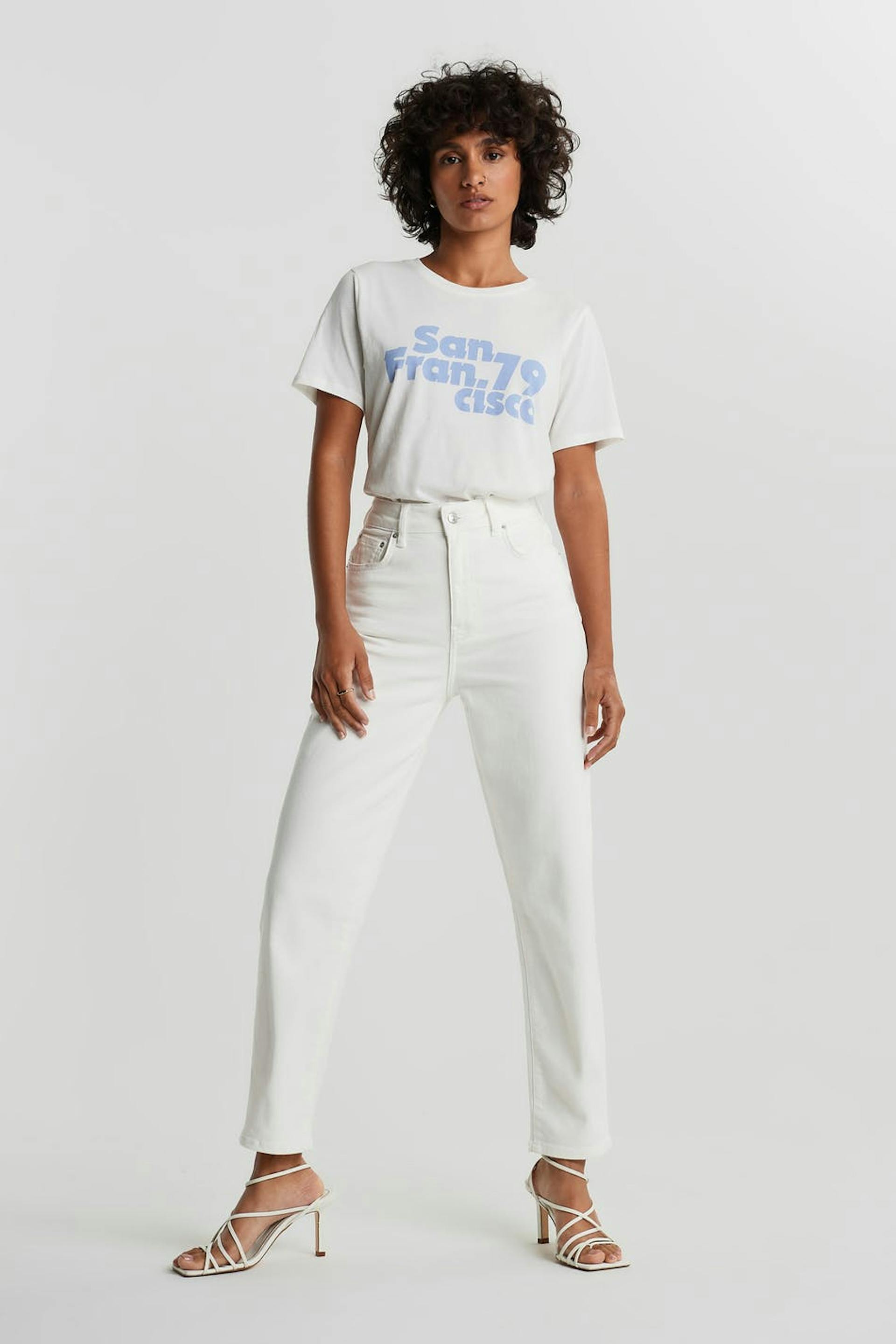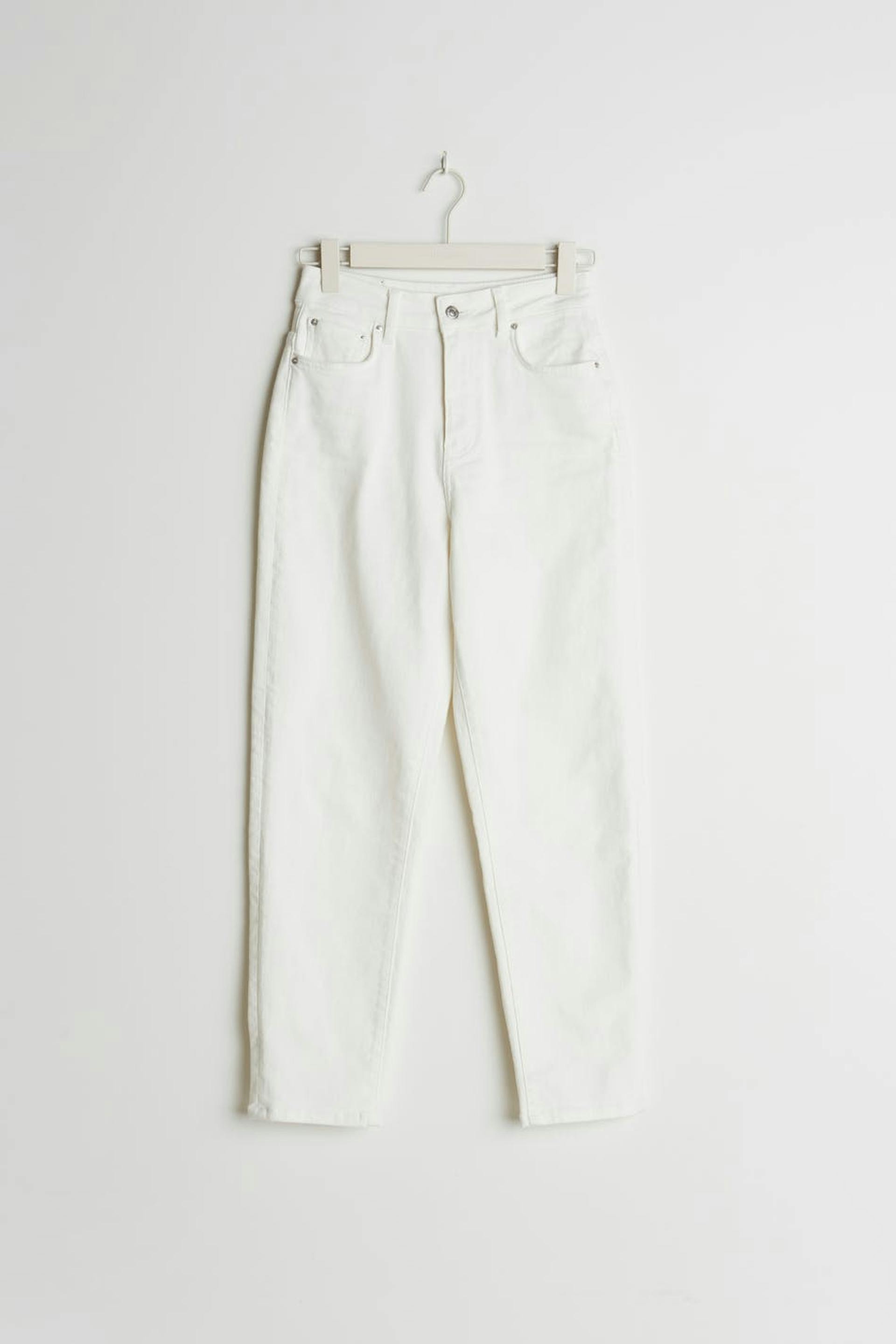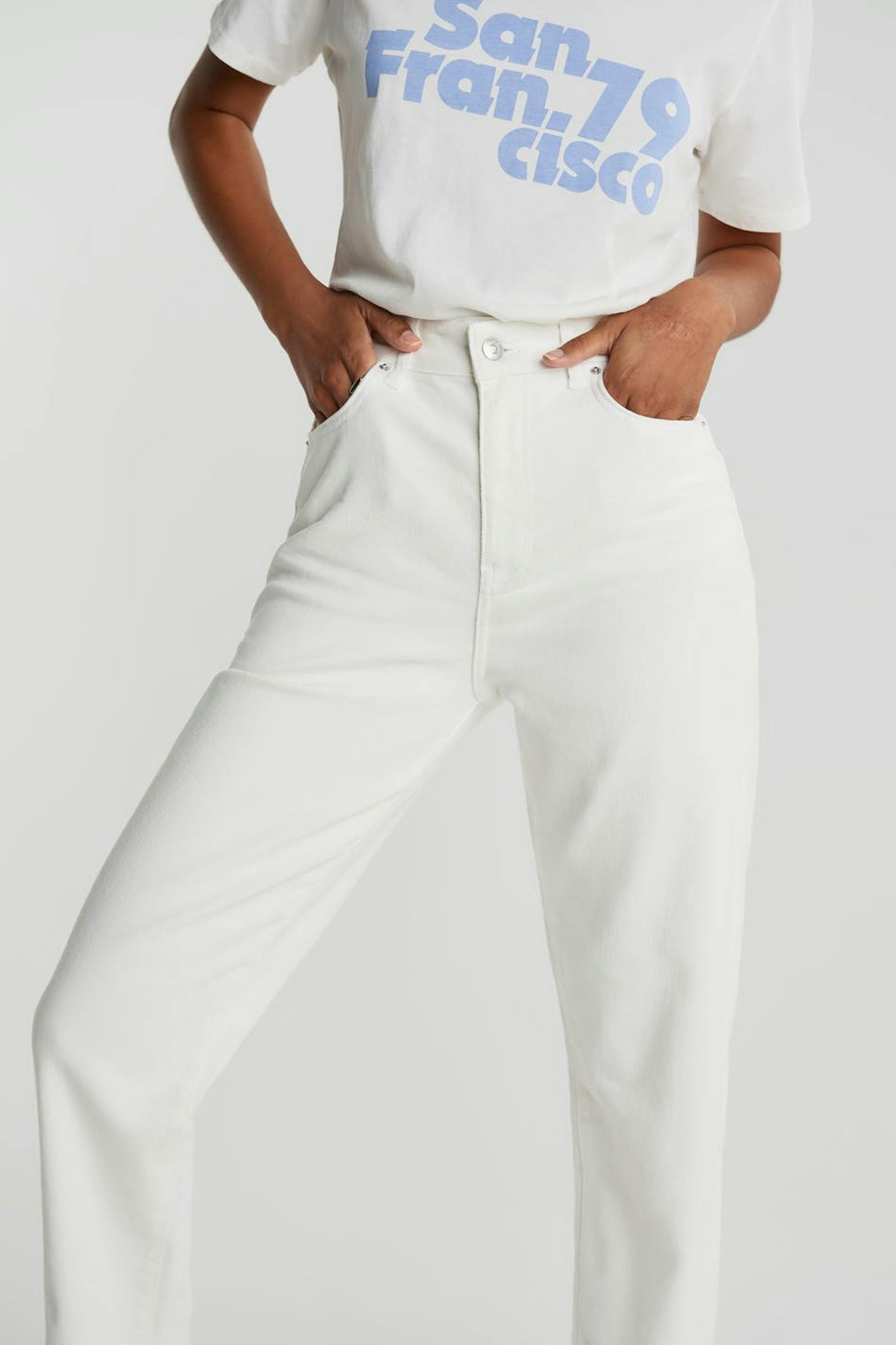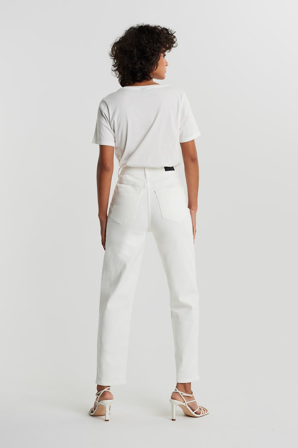 Soft mom jeans with a regular fit. The jeans is white and has a high waist. It is made of denim and has tapered legs and comfort stretch.