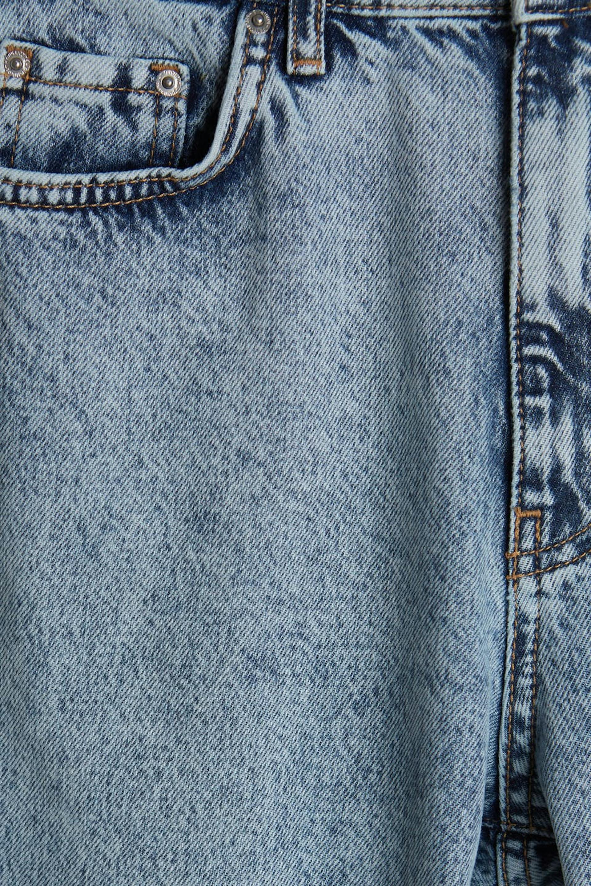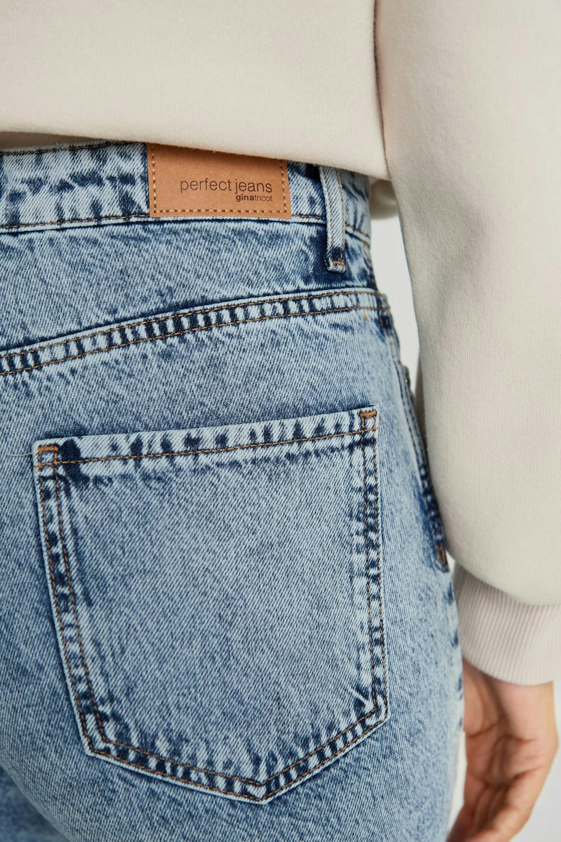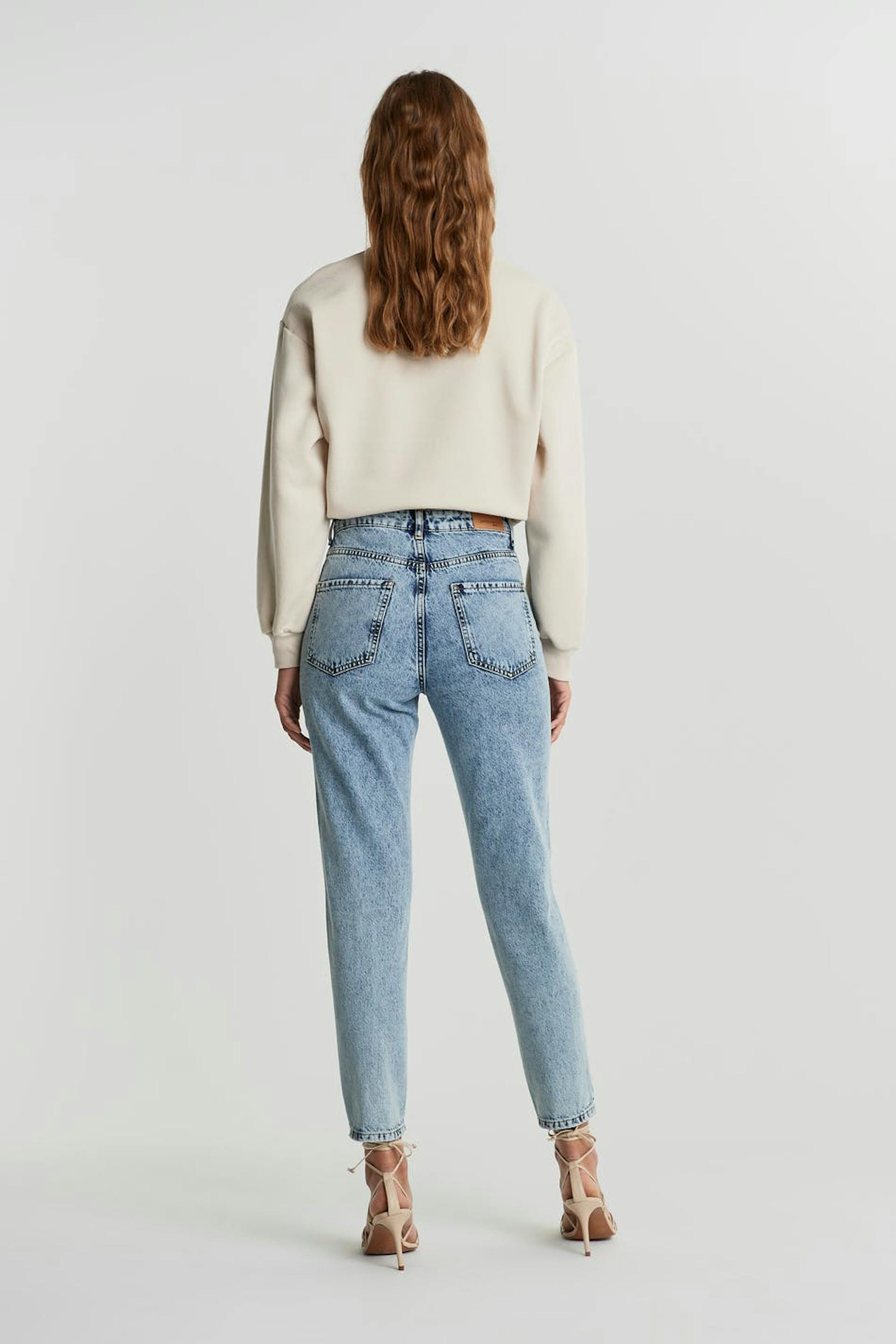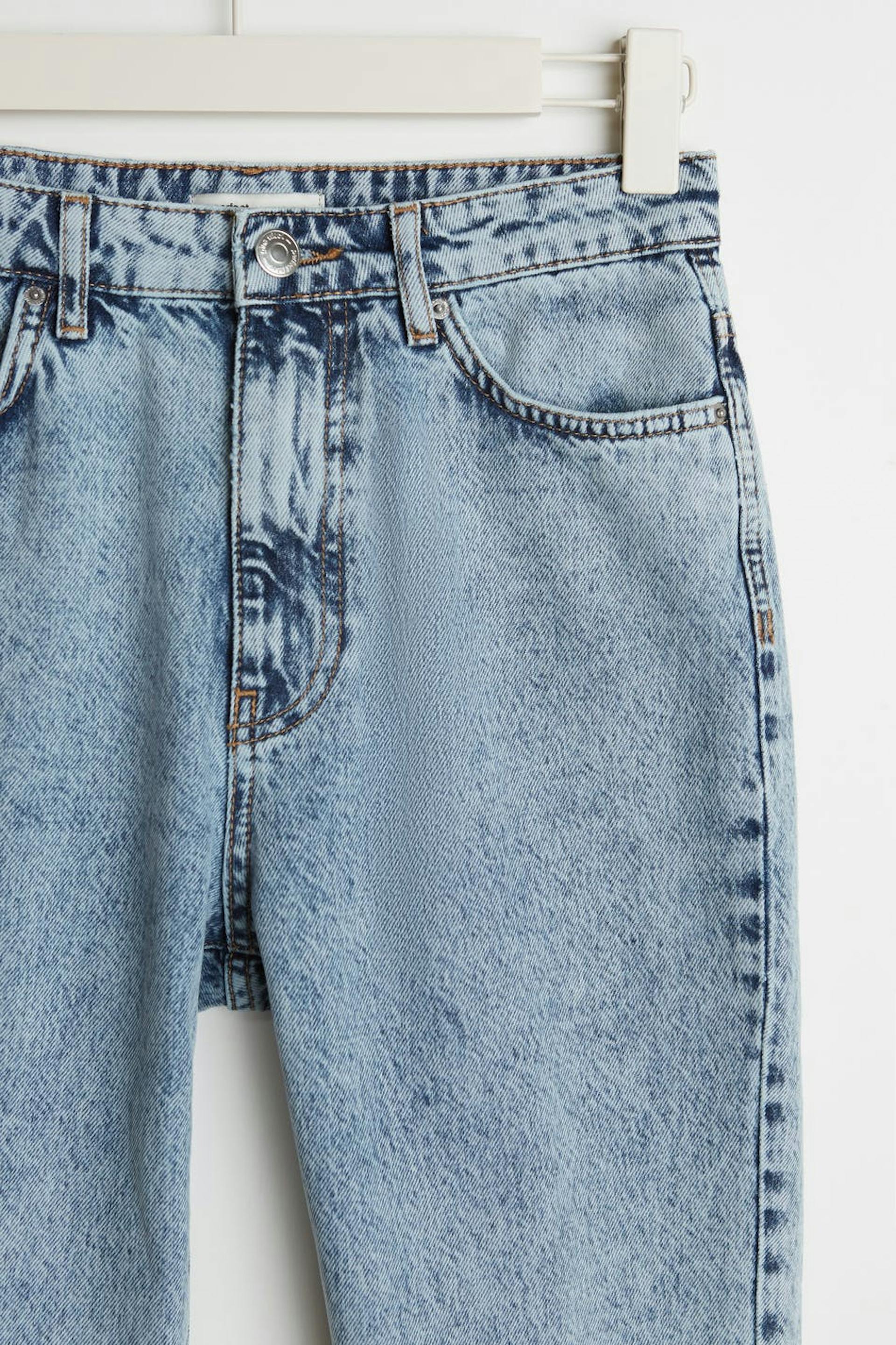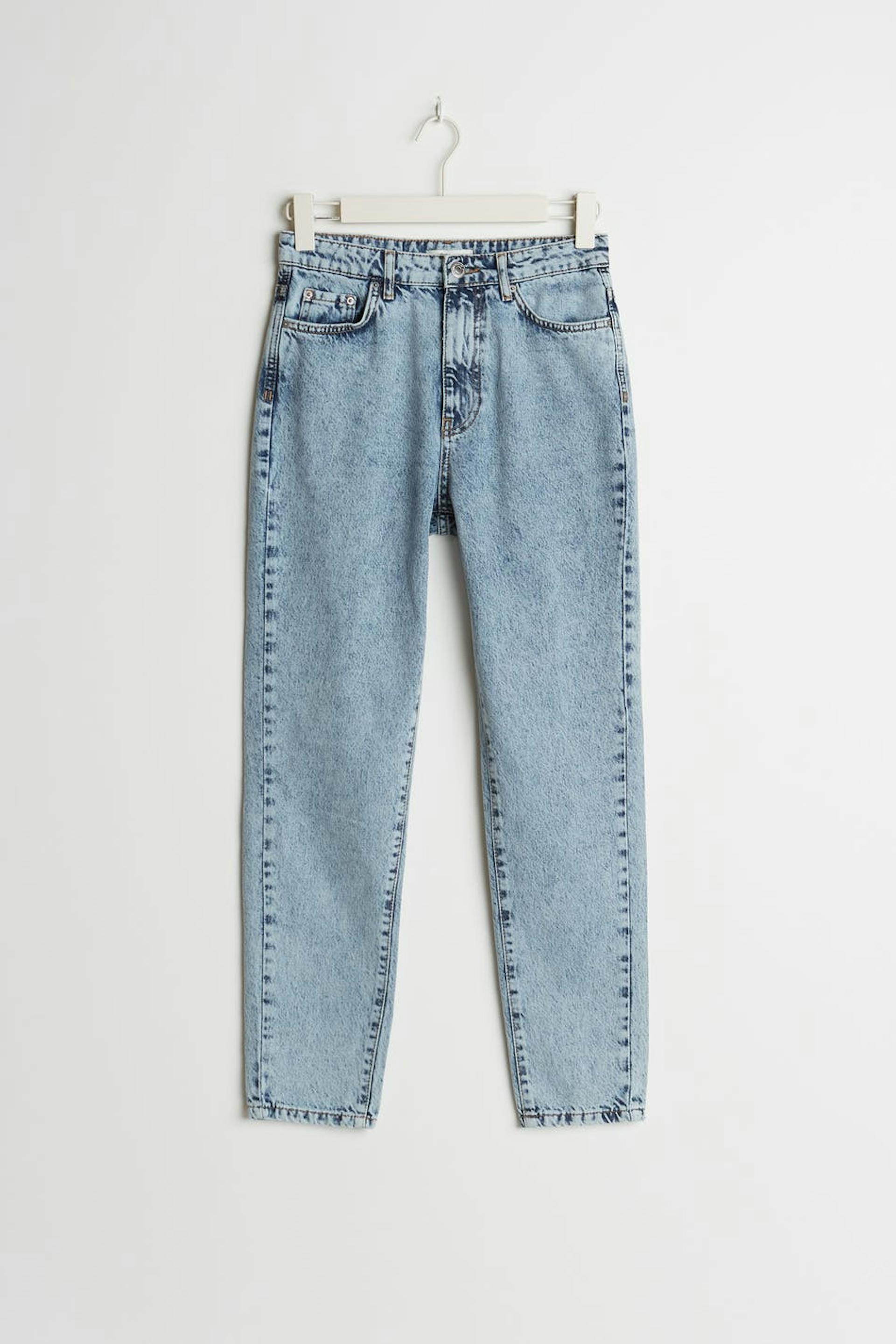Mom jeans with a regular fit. The jeans is blue and has a high waist. It is made of denim and has tapered, ankle-length legs and a fly.