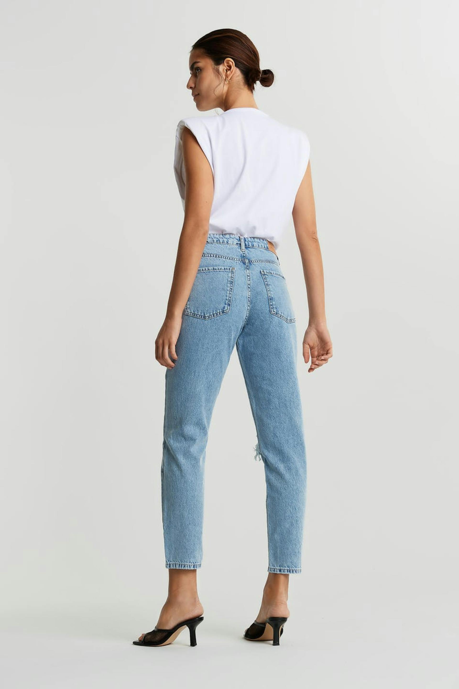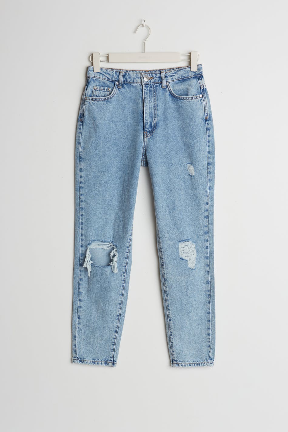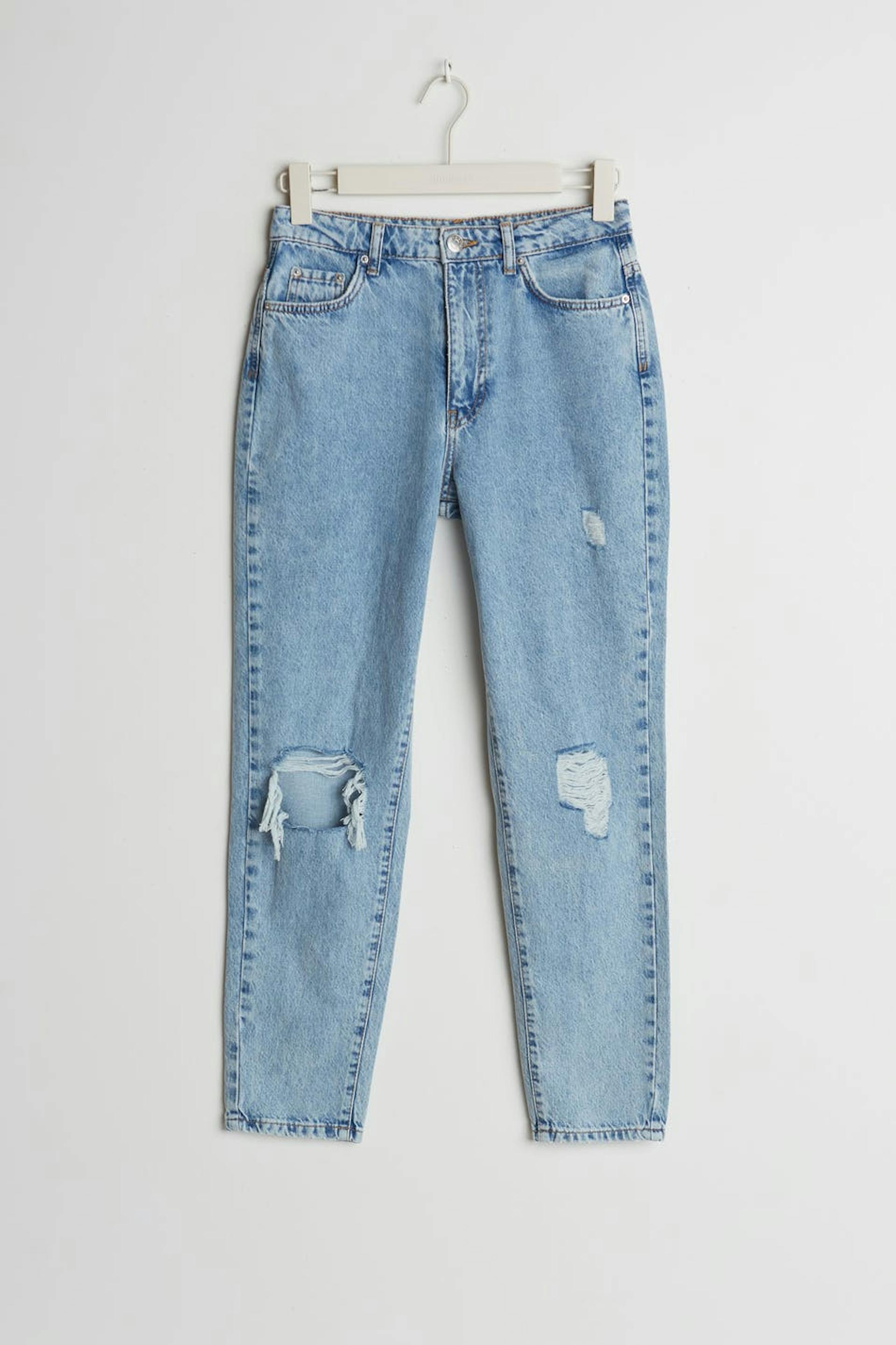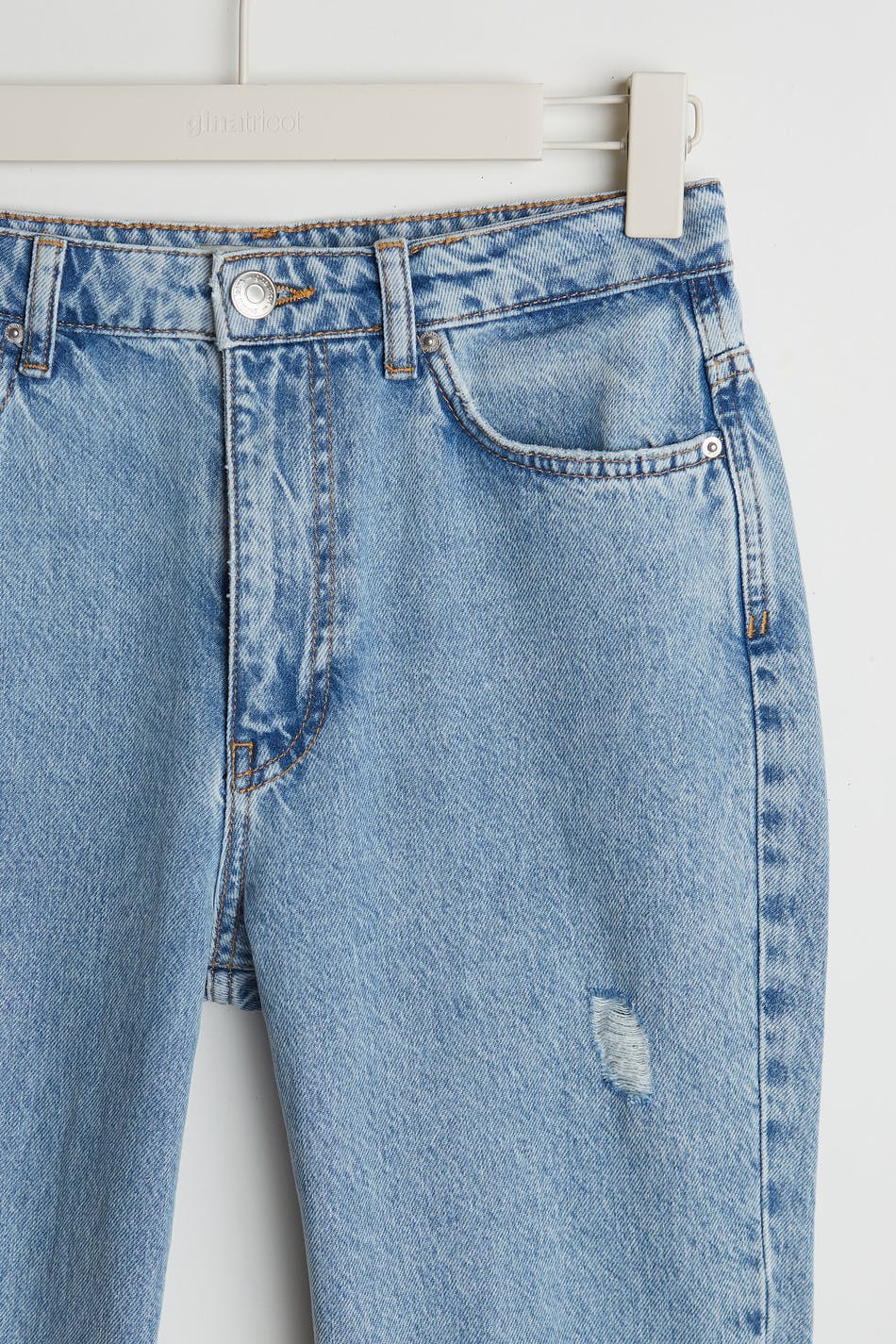 Non-stretch mom jeans with a regular fit. The jeans is blue and has a high waist. It is made of denim and has tapered trouser legs with ankle-length leg length and a zip fly.