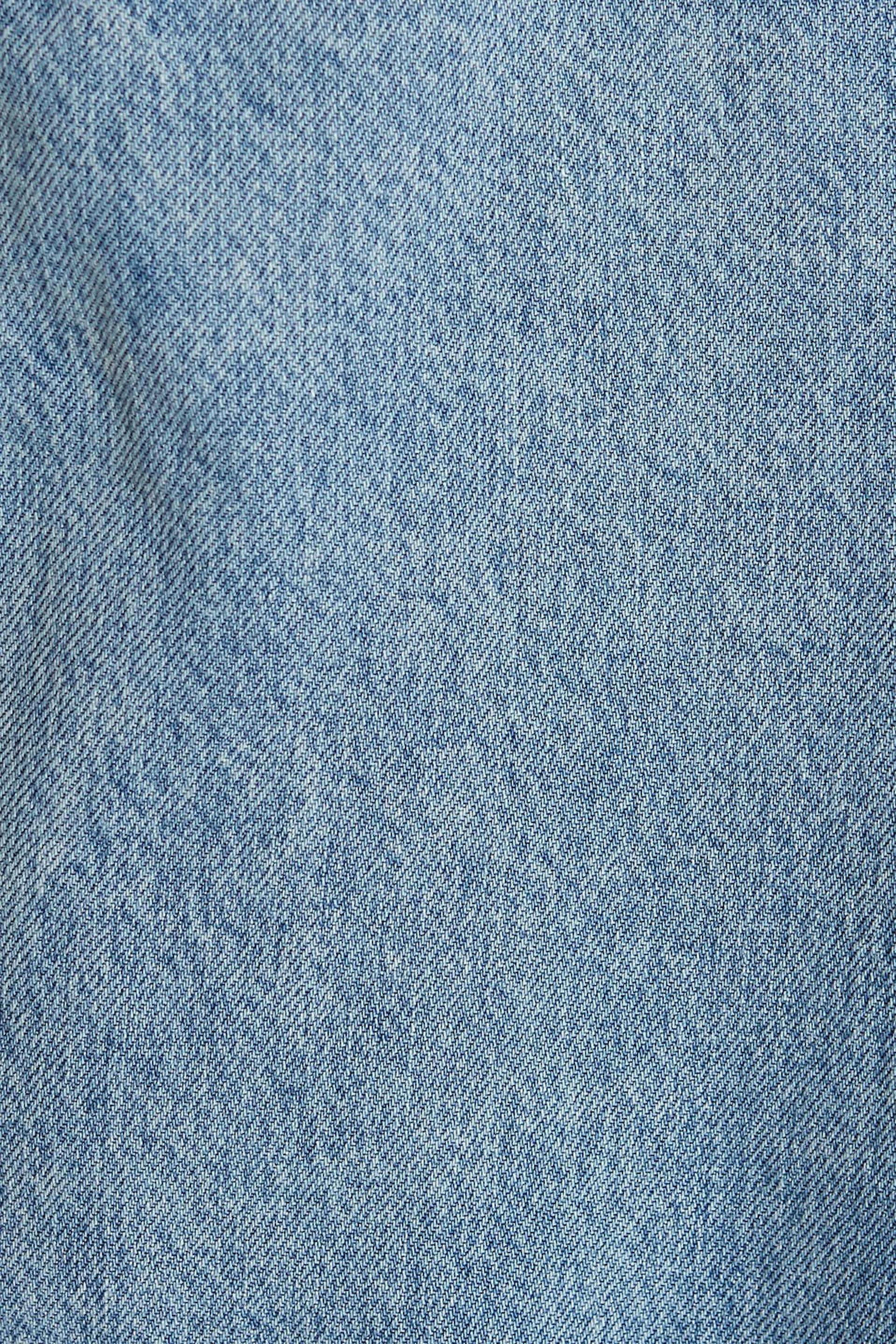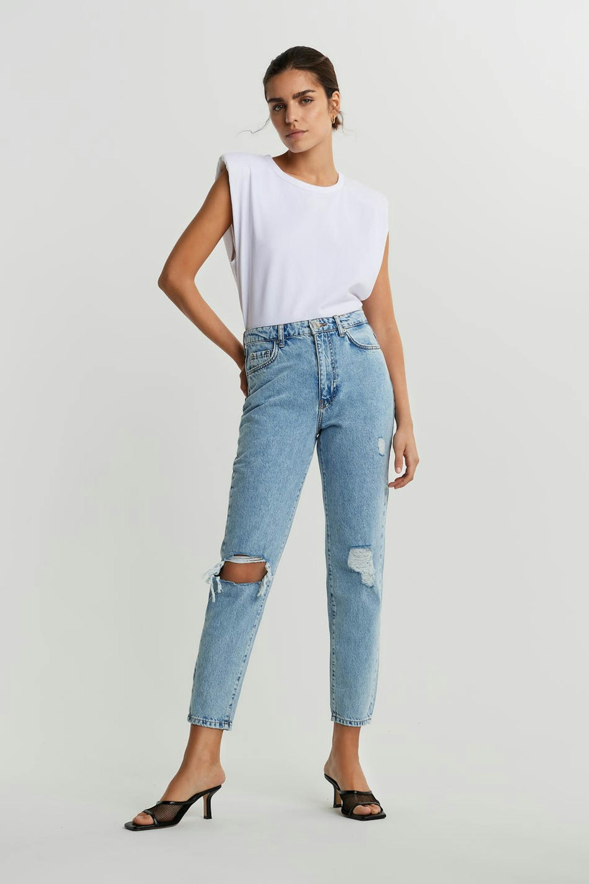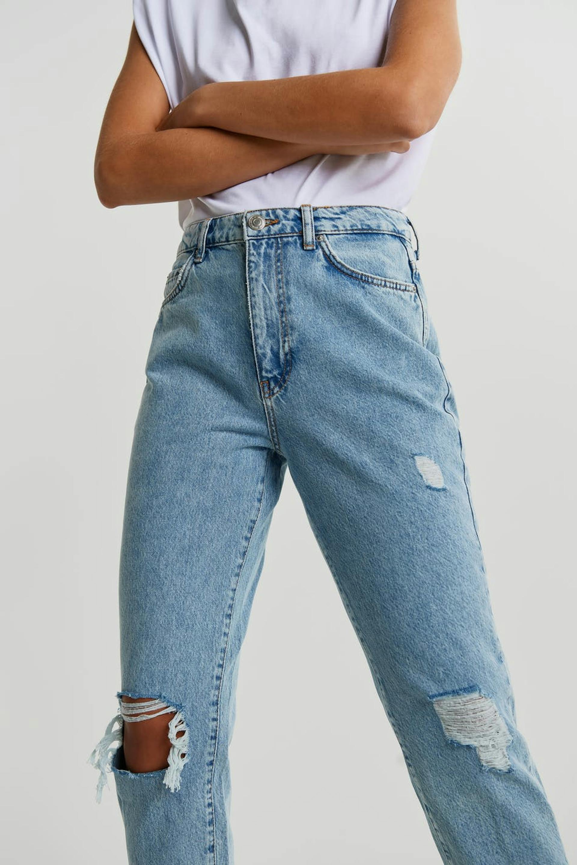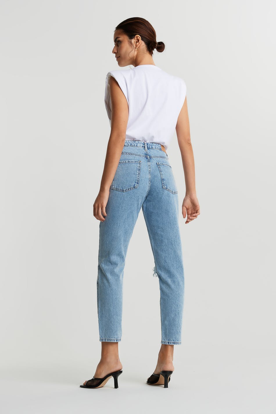 Non-stretch mom jeans with a regular fit. The jeans is blue and has a high waist. It is made of denim and has tapered trouser legs with ankle-length leg length and a zip fly.
