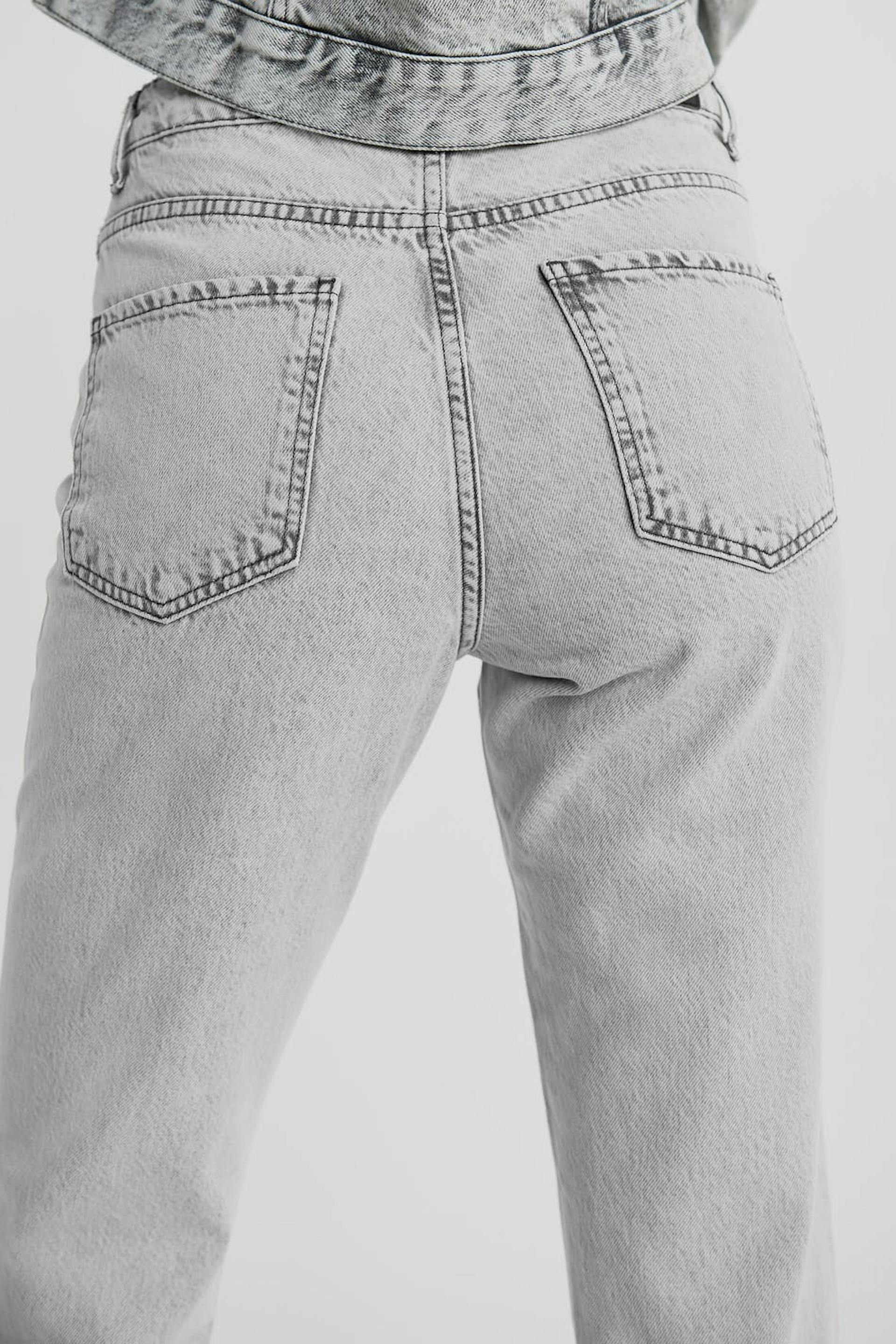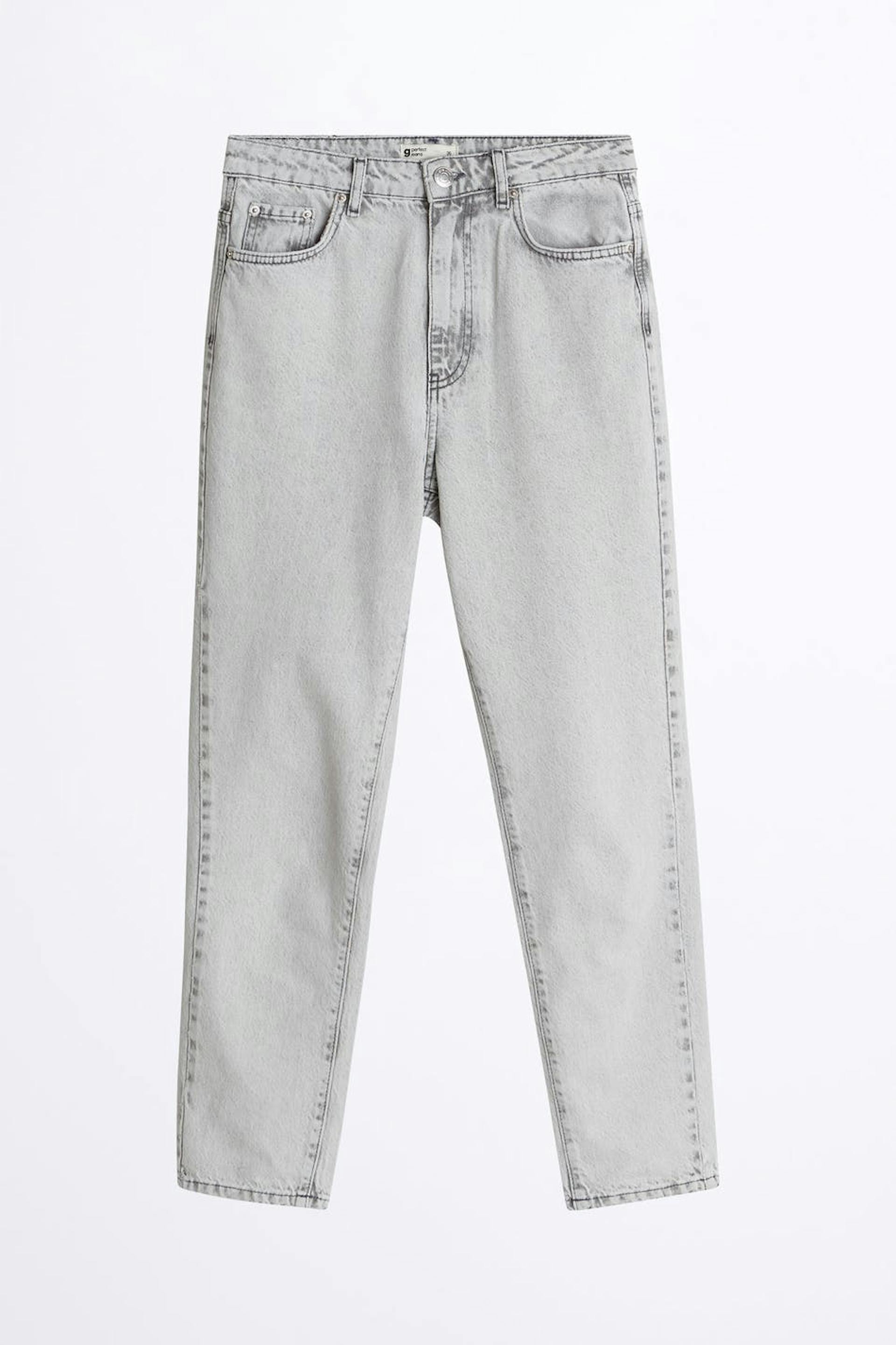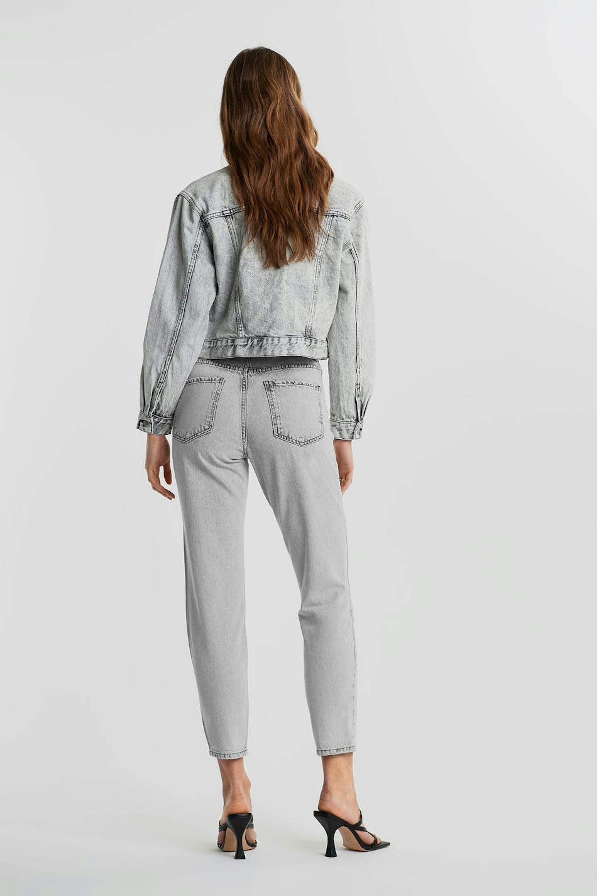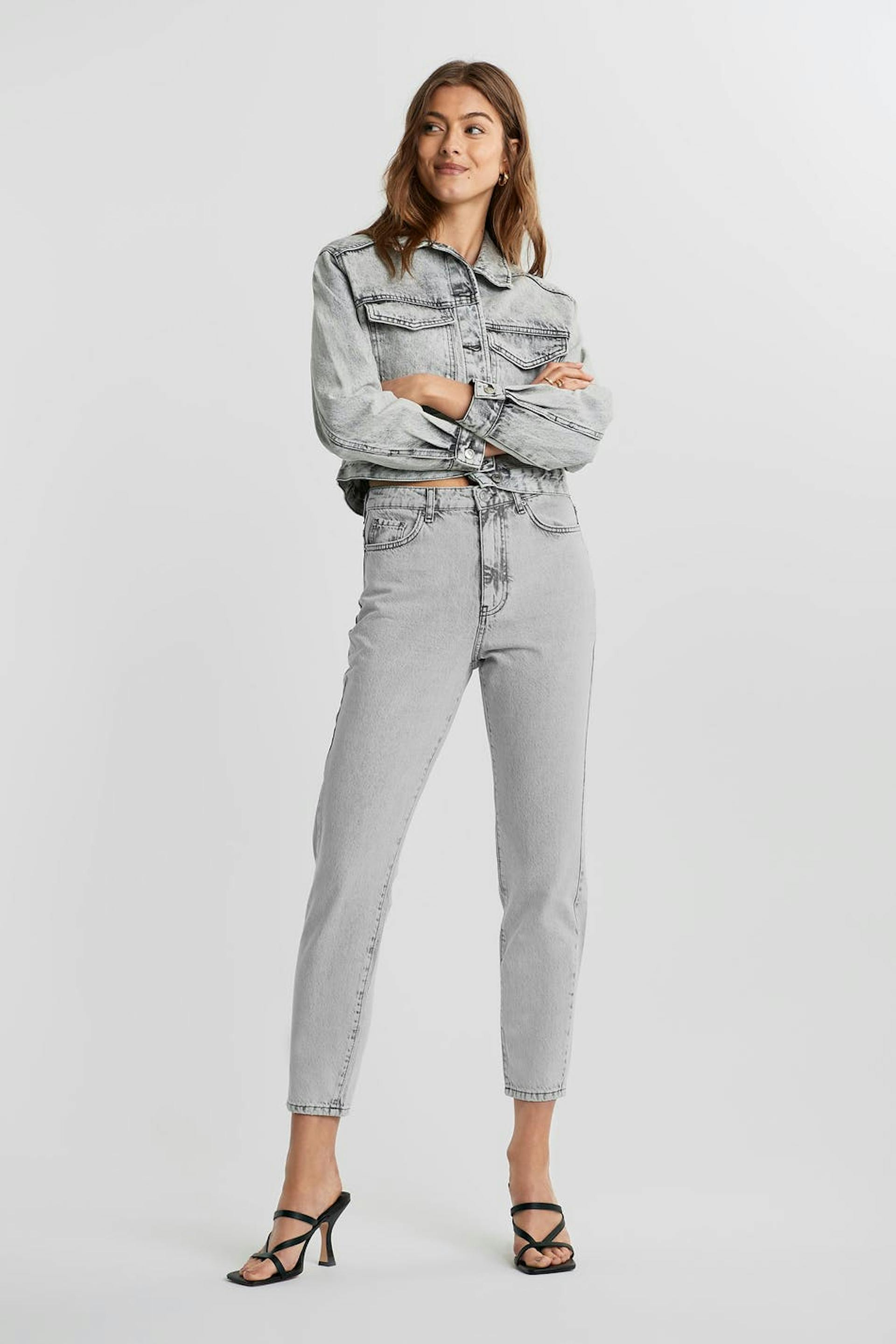 Mom jeans with a regular fit. The mom jeans is light grey and has a high waist. It is made of denim and has tapered, ankle-length legs and a fly.