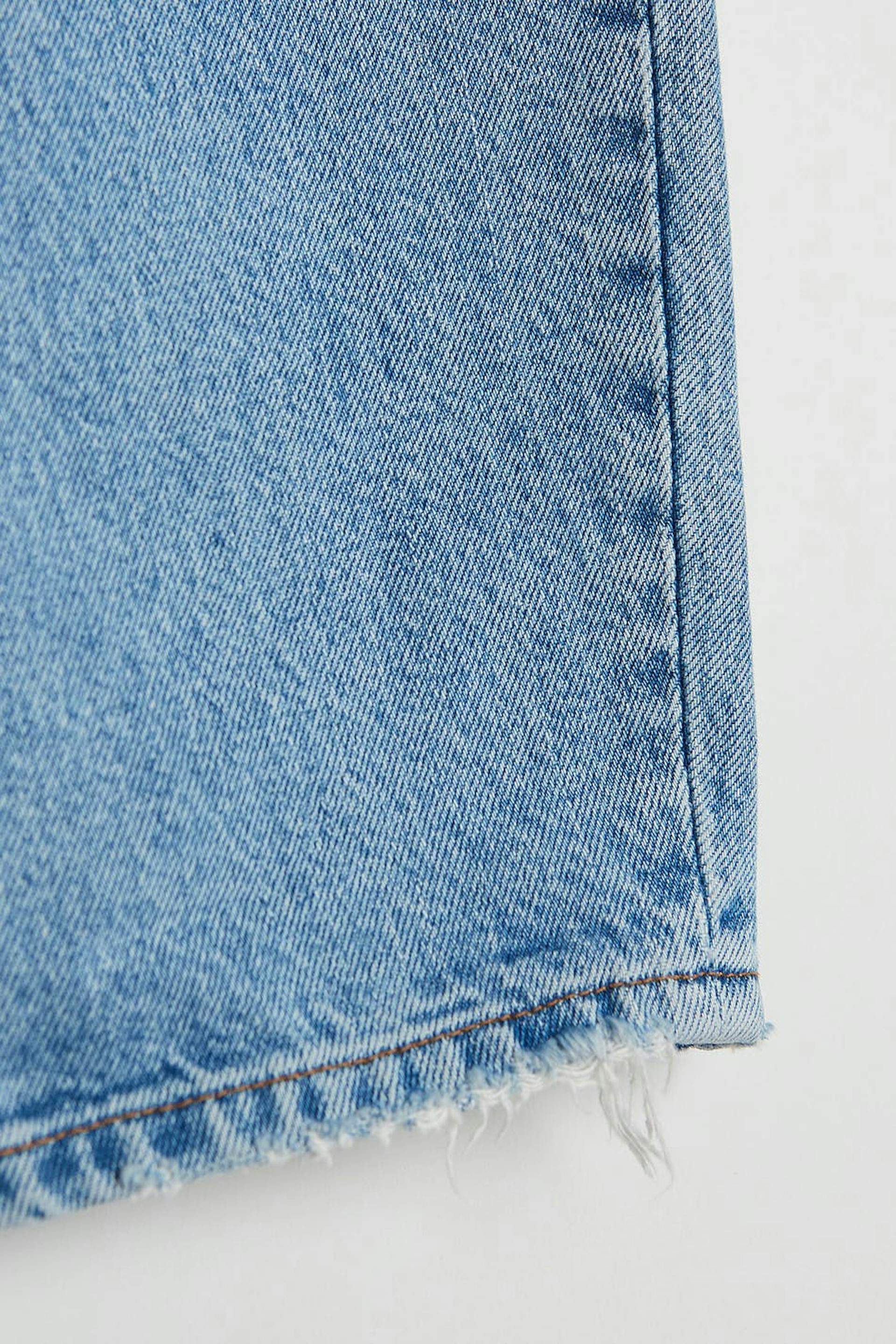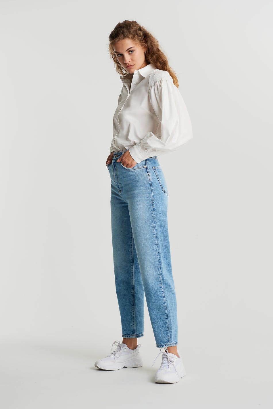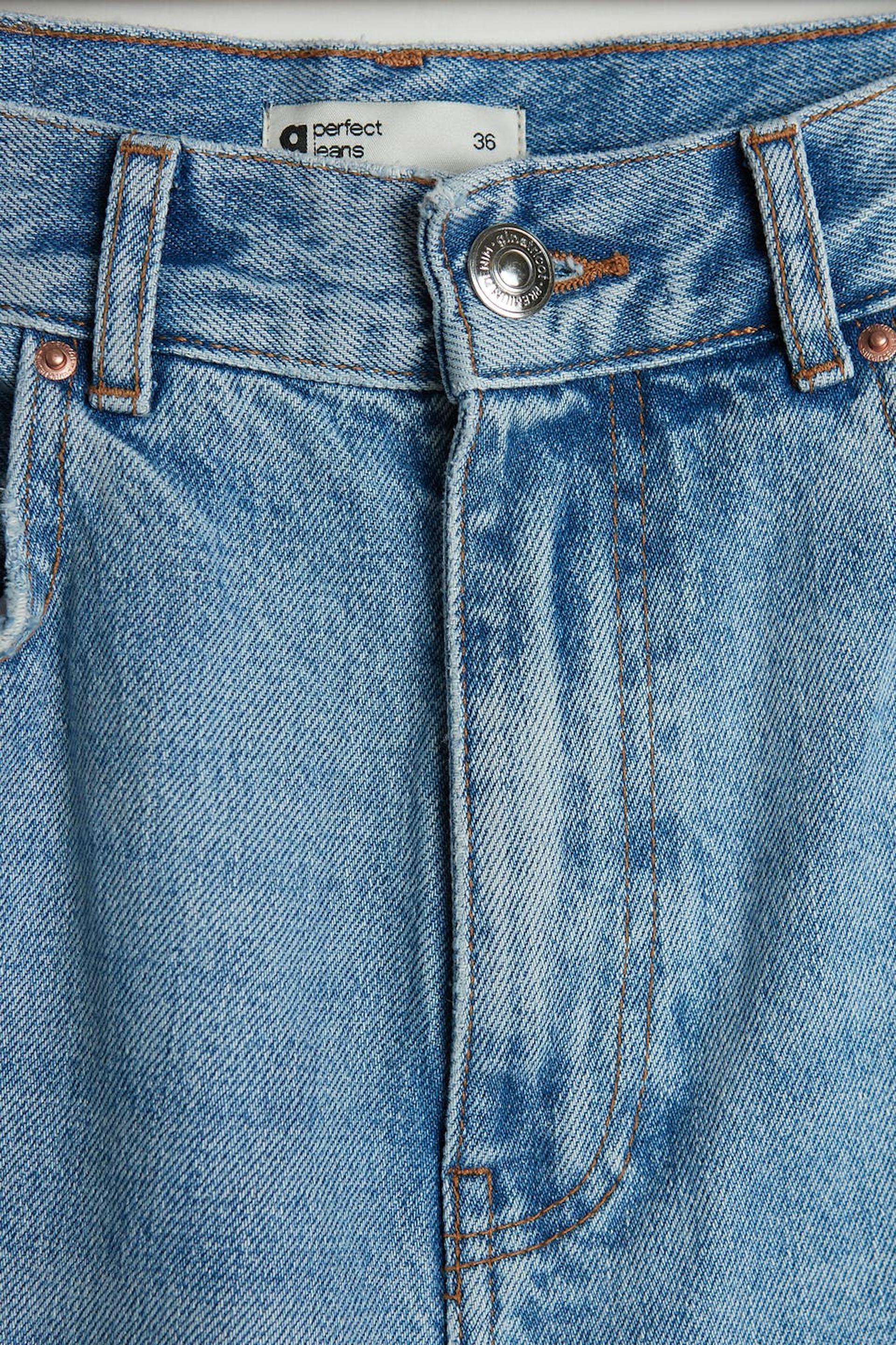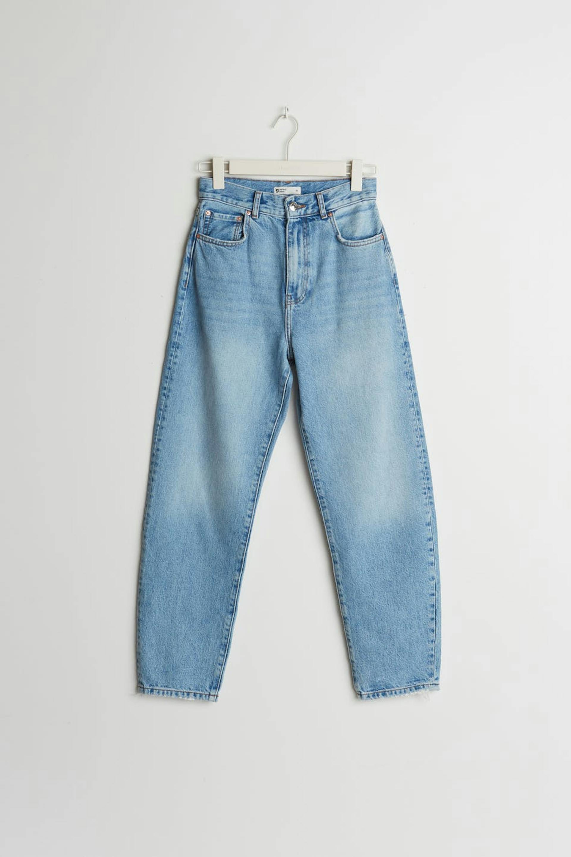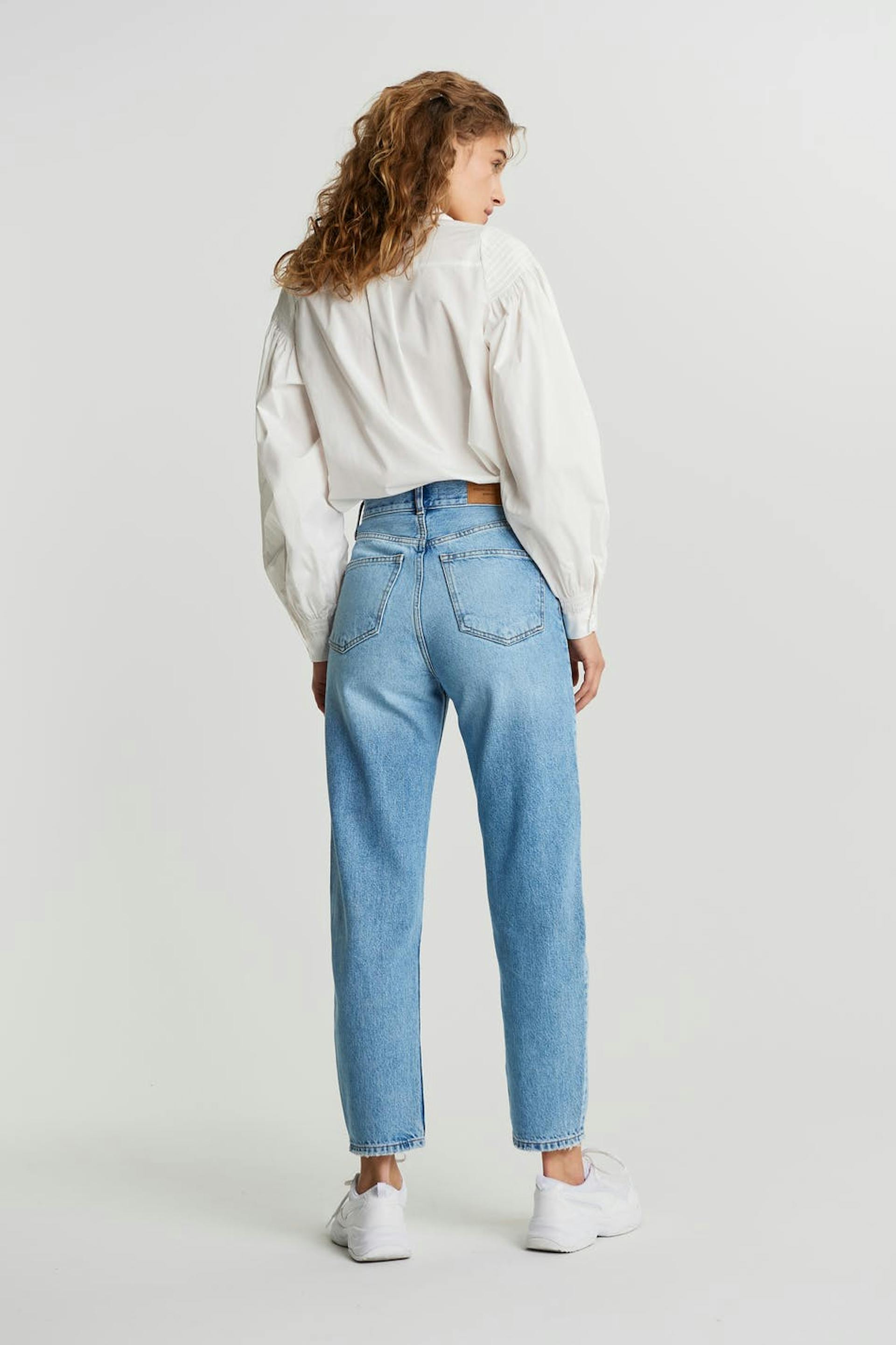 Ankle-length mom jeans with tapered legs. The mom jeans is light-blue and has a high waist. It has a loose, soft fit.