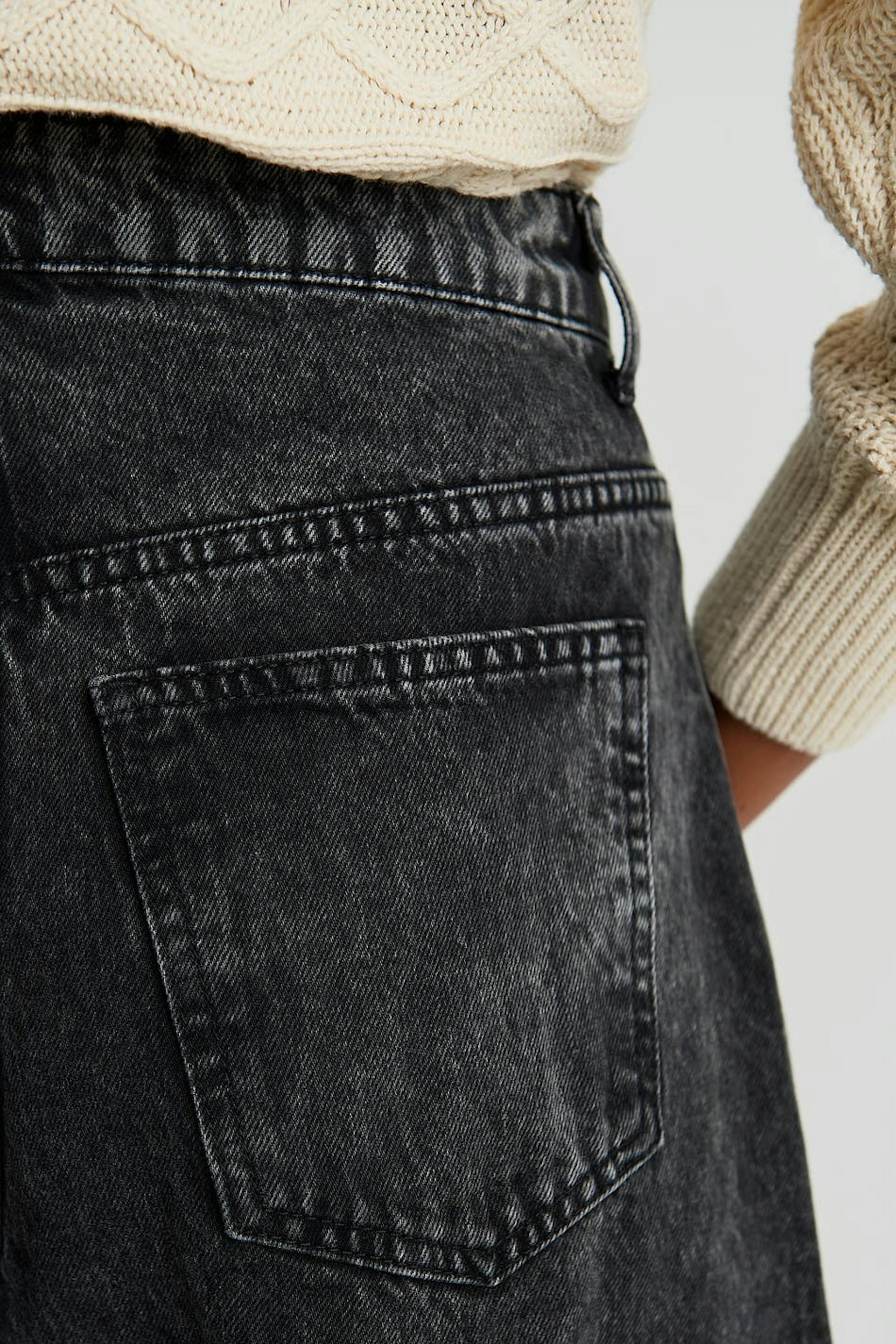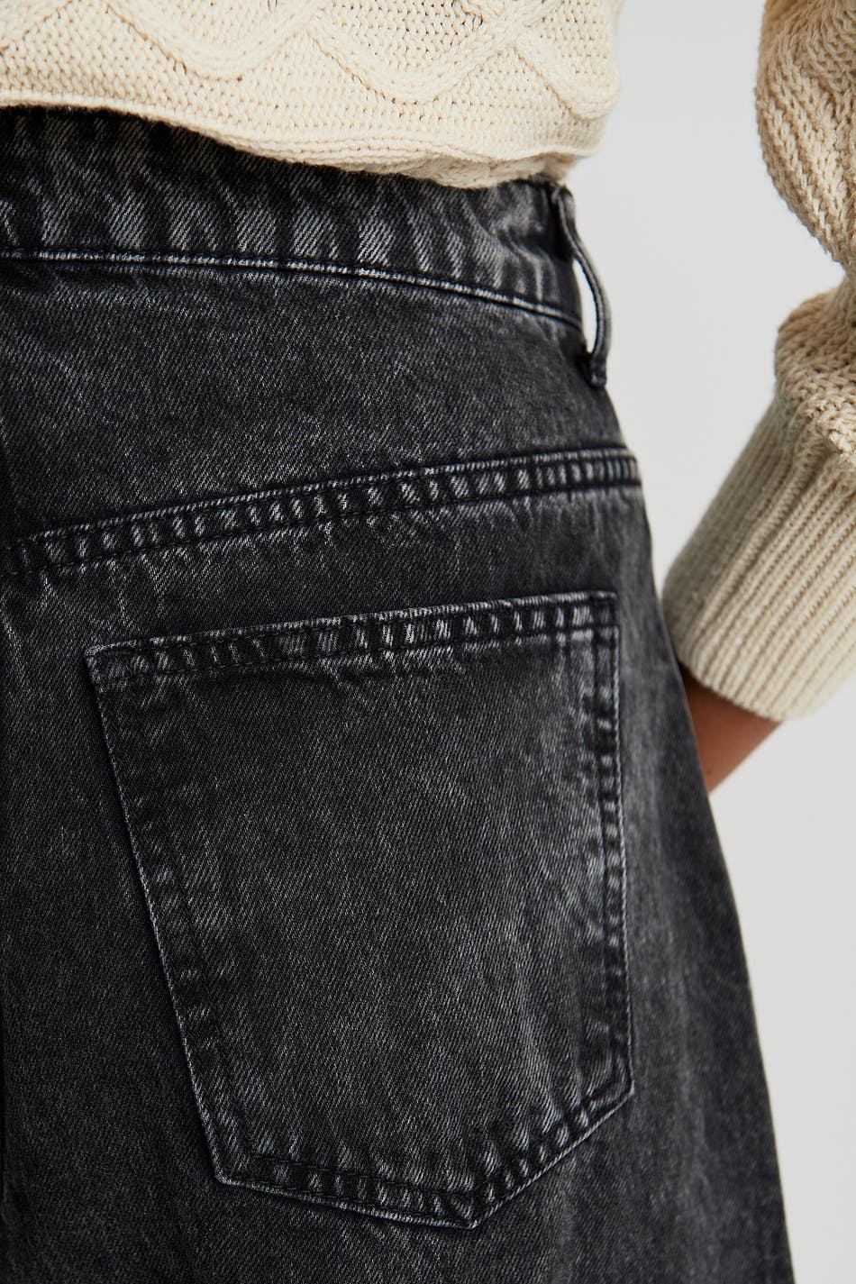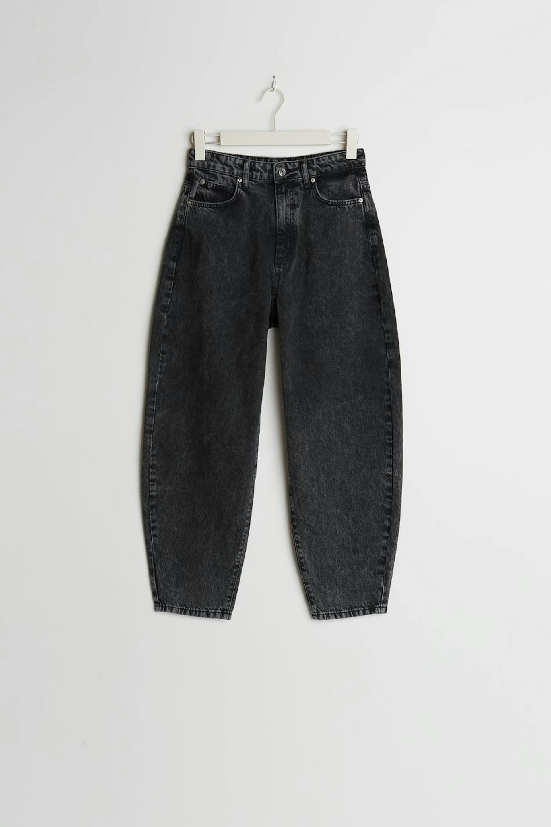 Puffy jeans with an oversize fit. The jeans is black and has a high waist. It has wide legs.