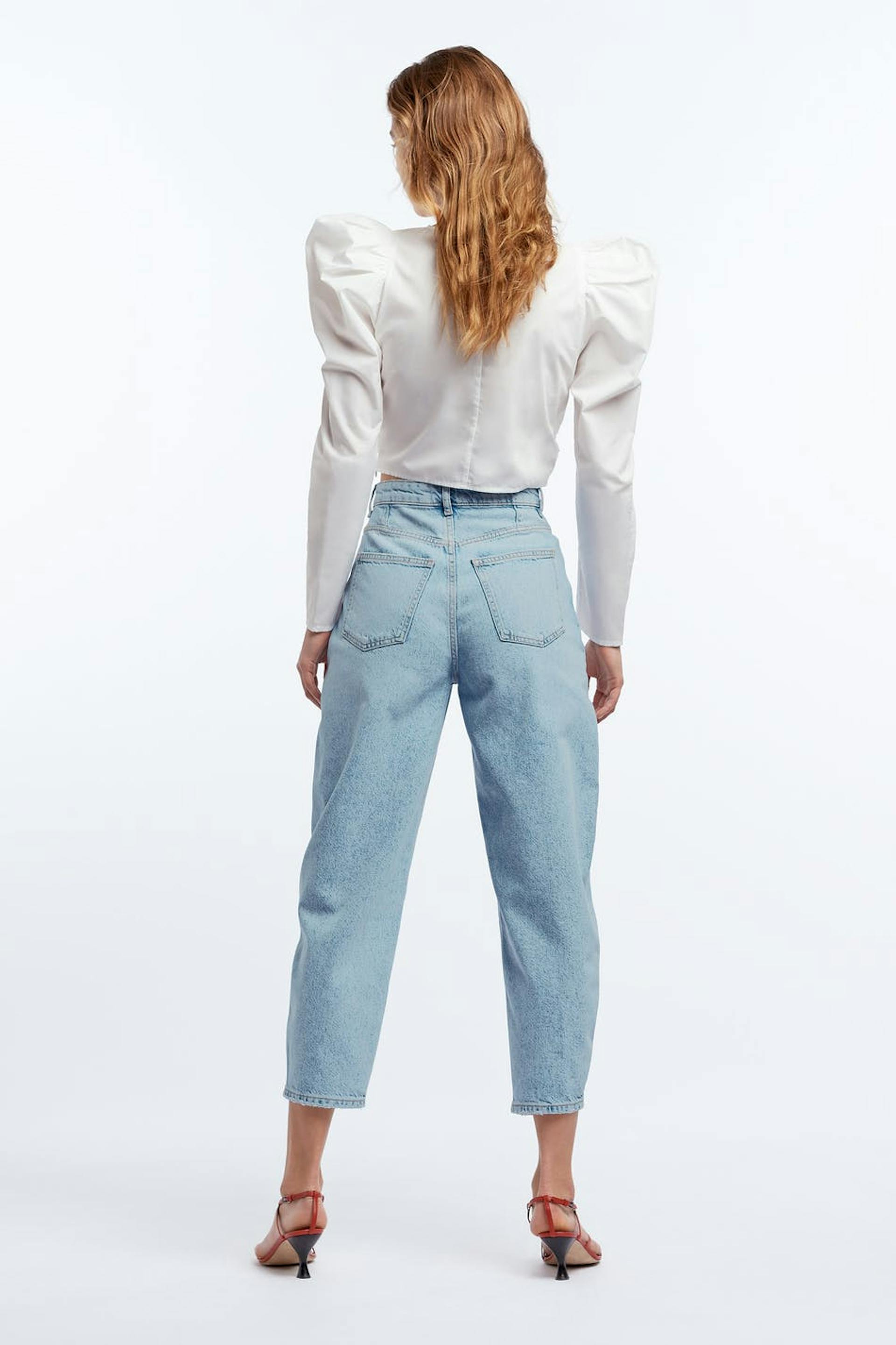 Puffy mom jeans with an oversize fit. The jeans is light-blue and nonstretch and has a high waist. It has spacious legs.