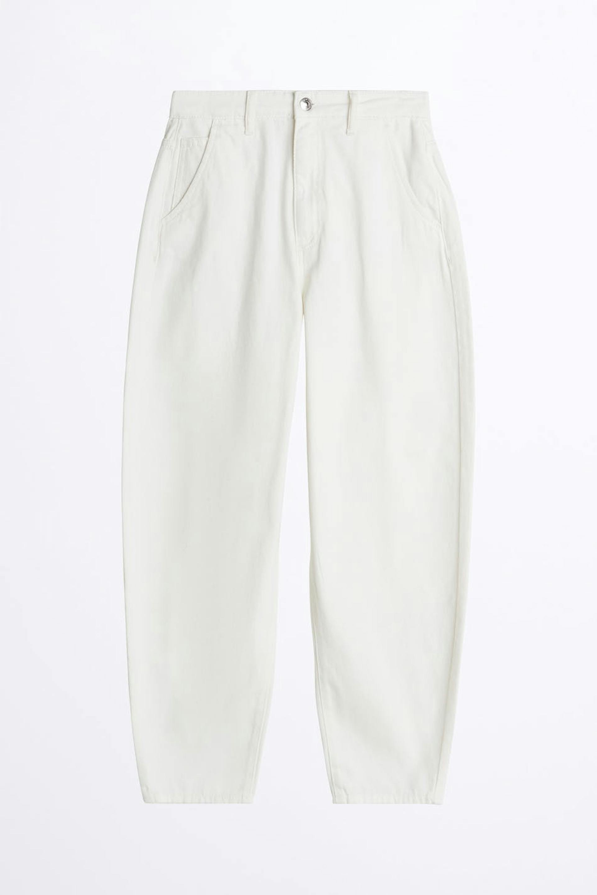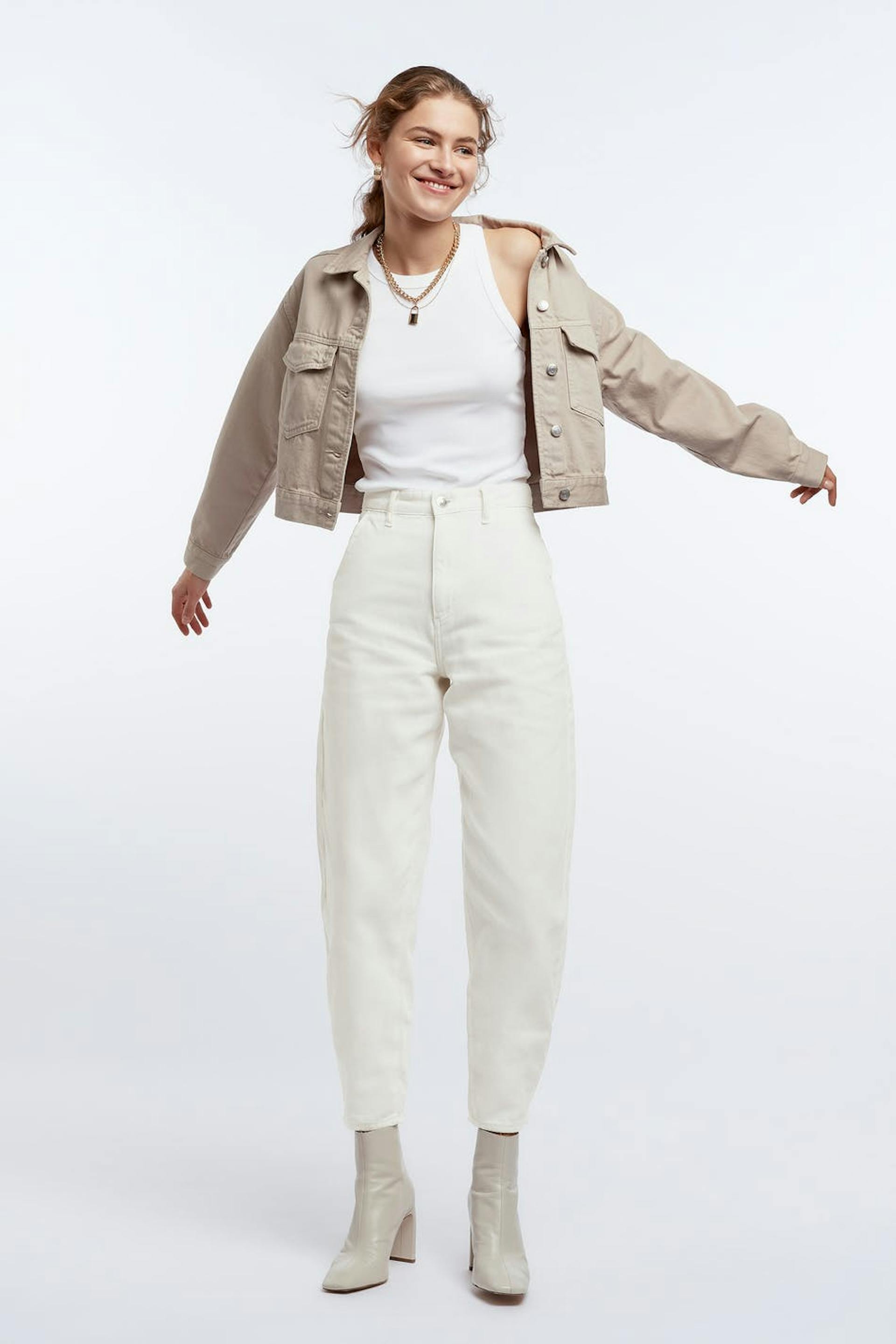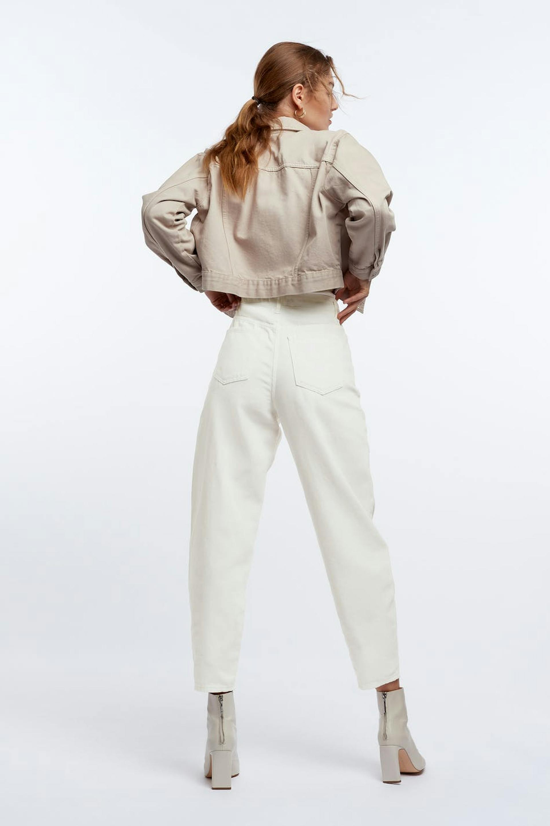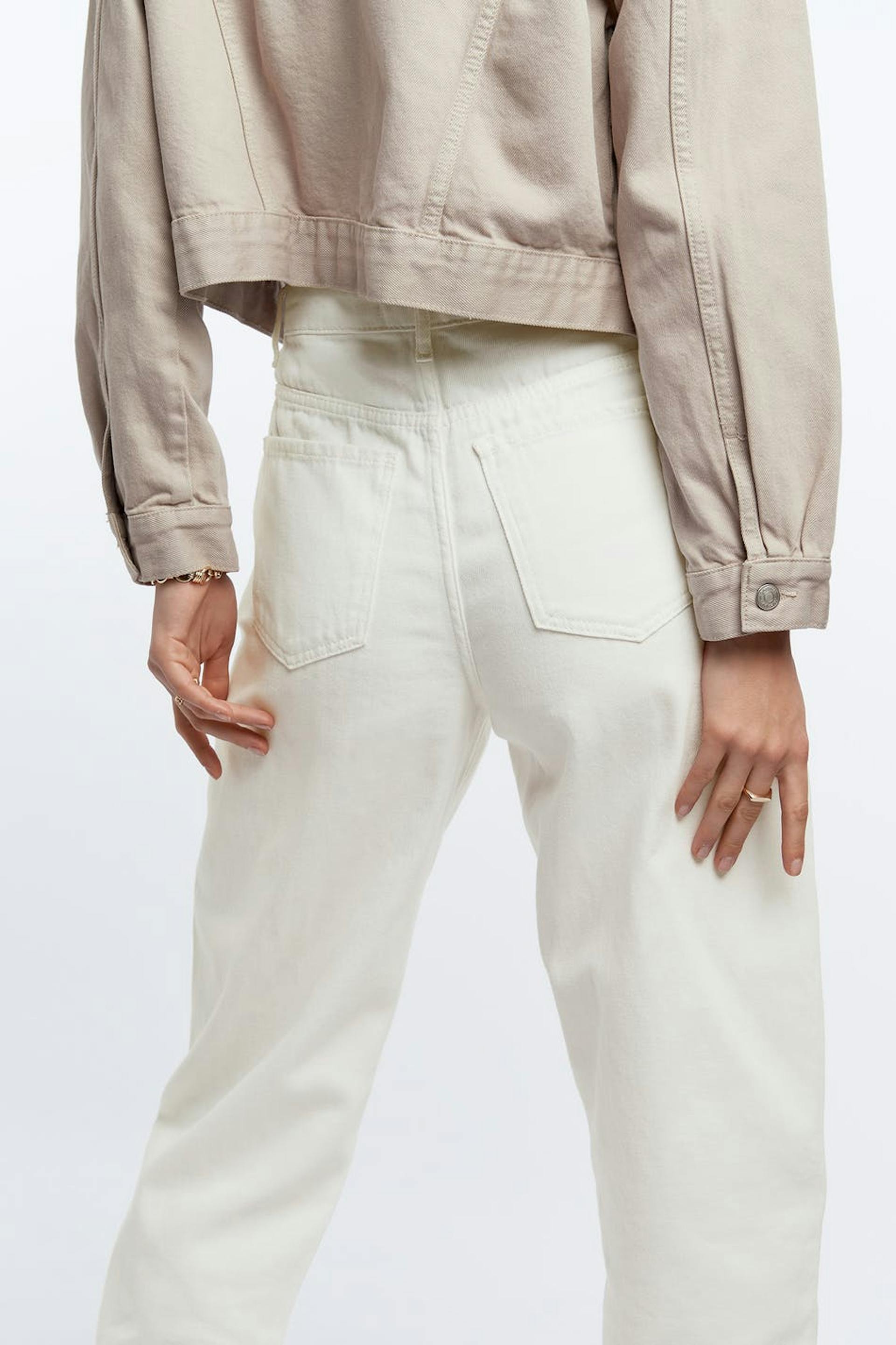 Relaxed mom jeans with an oversize fit. The jeans are white and nonstretch and have a high waist. They have spacious legs.