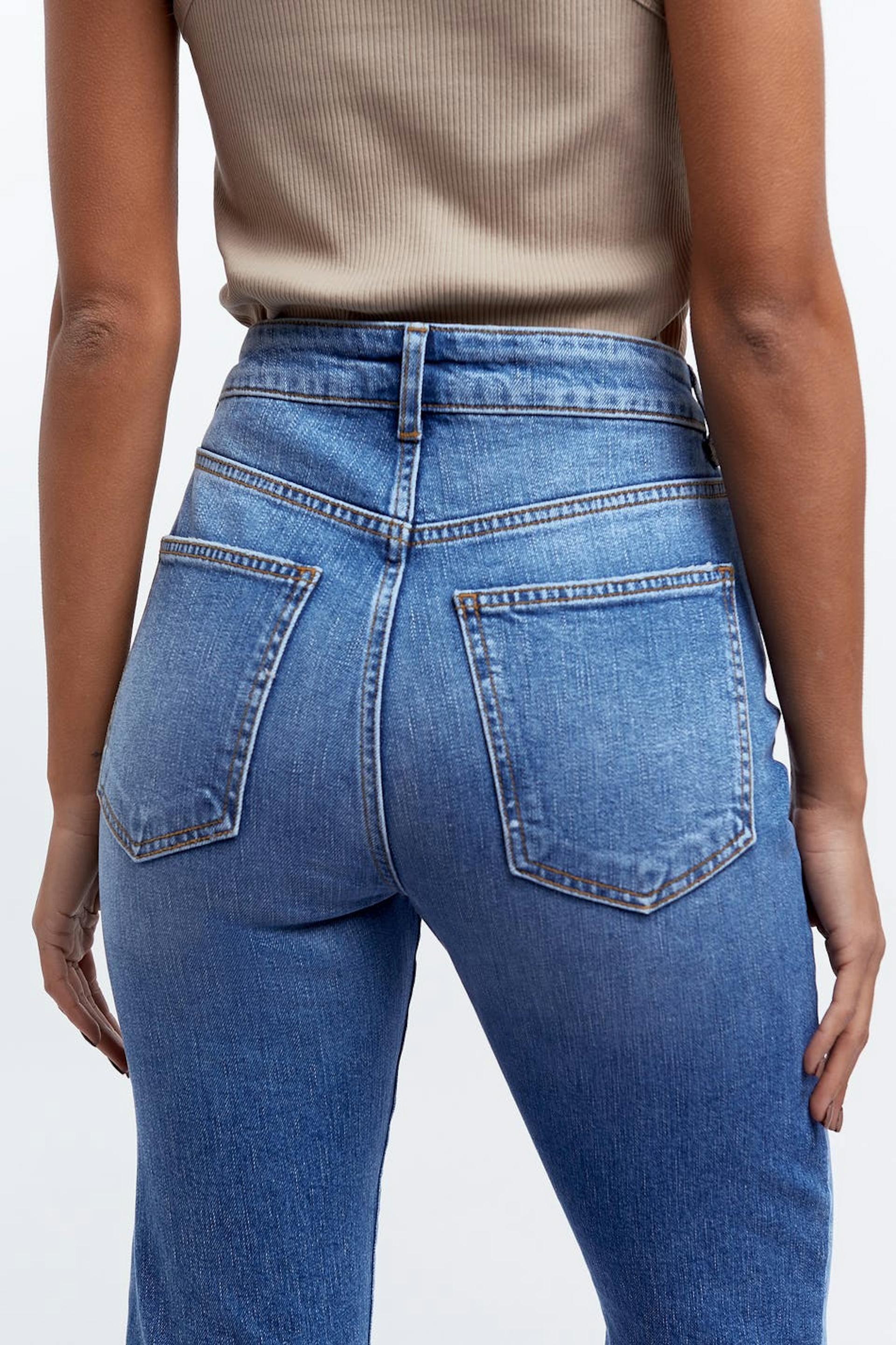 Petite jeans with a fitted fit. The jeans are blue and have a mid waist. They have short legs with a flare detail. Perfect for those who are 160 cm (5 ft 3 in.) or shorter.