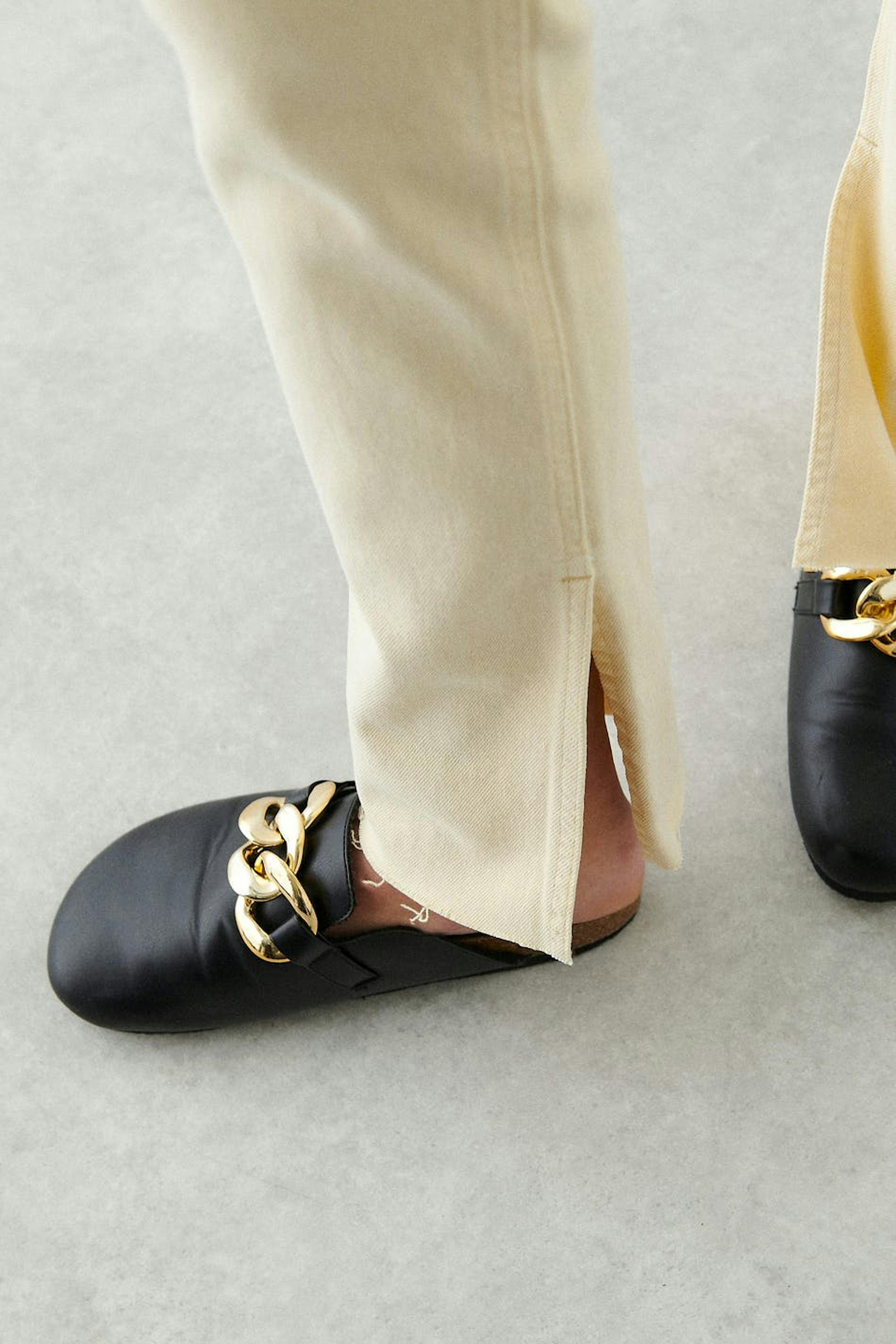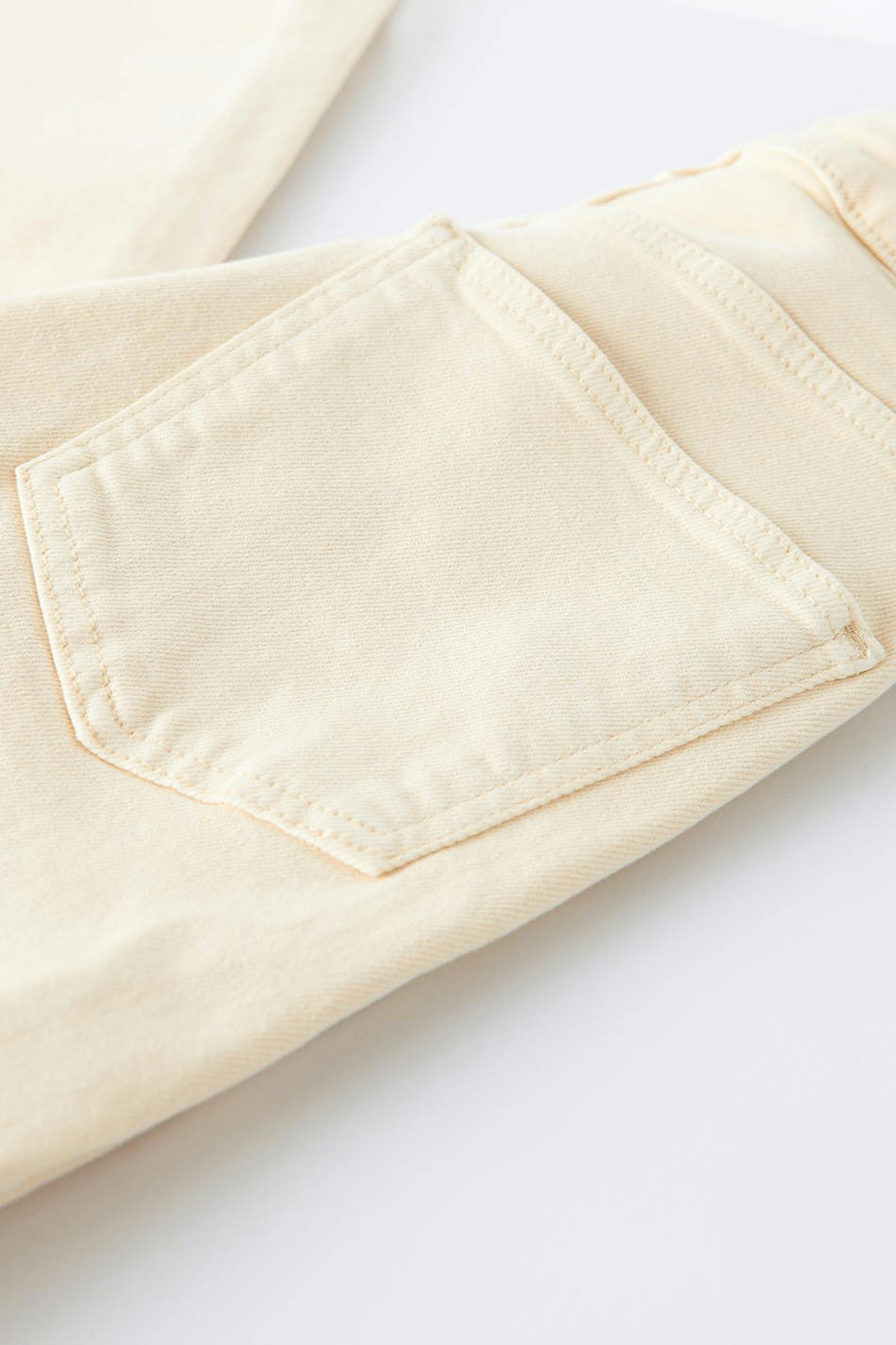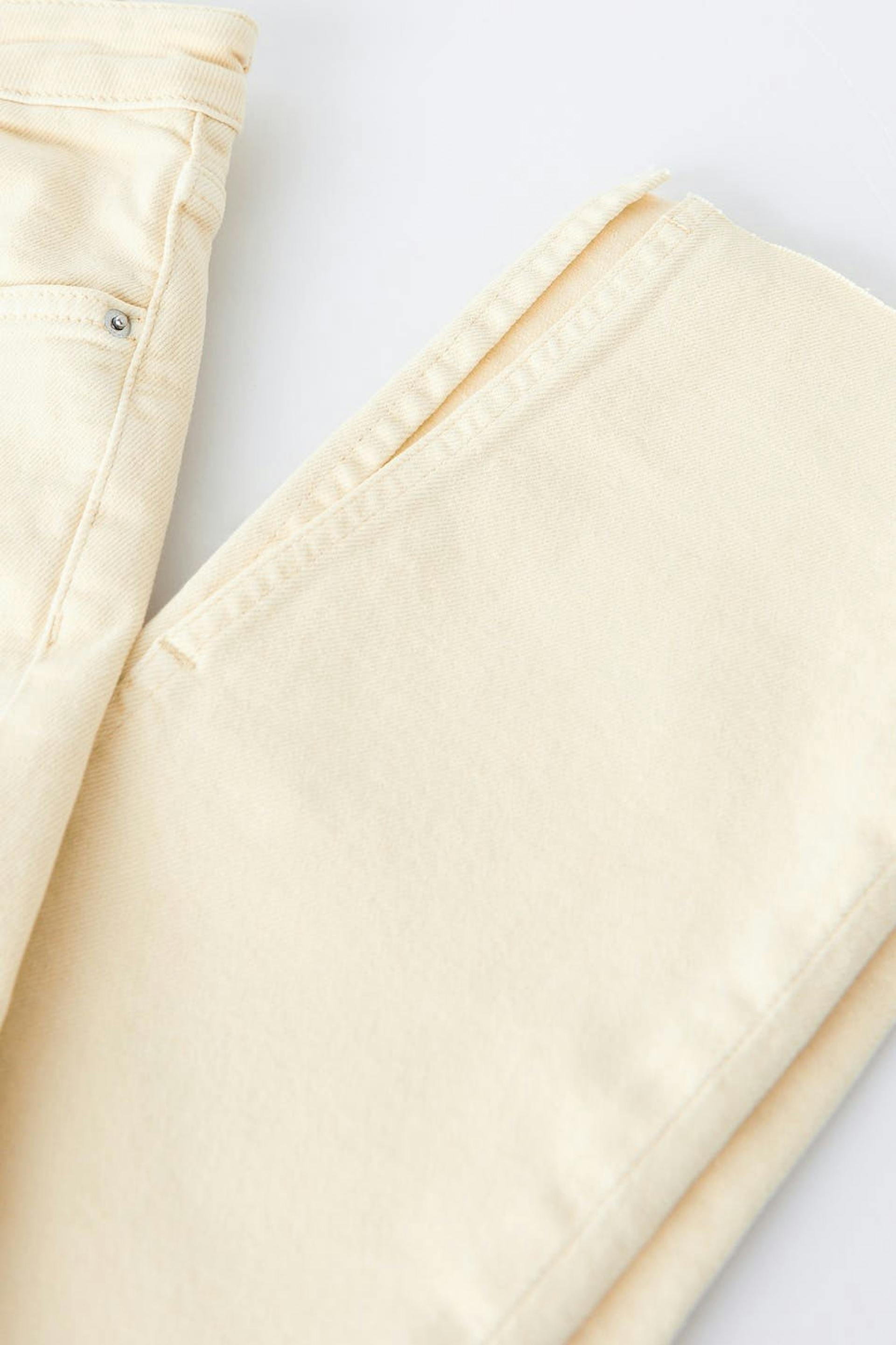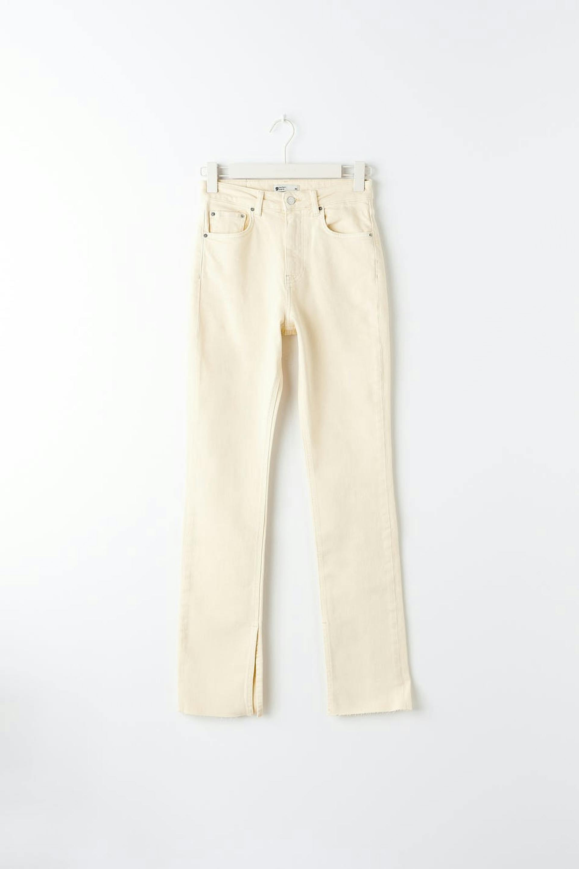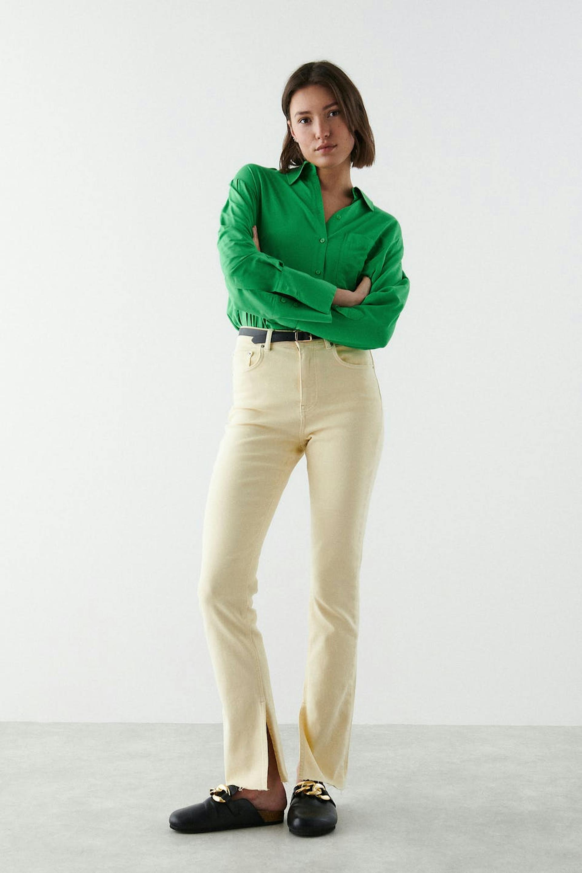 Slim jeans with high waist in low stretch denim. The jeans are yellow and have straight legs with full length. They have slit at the end of the legs, zip fly and pockets at the front and back. Use our size guide to find your size.
