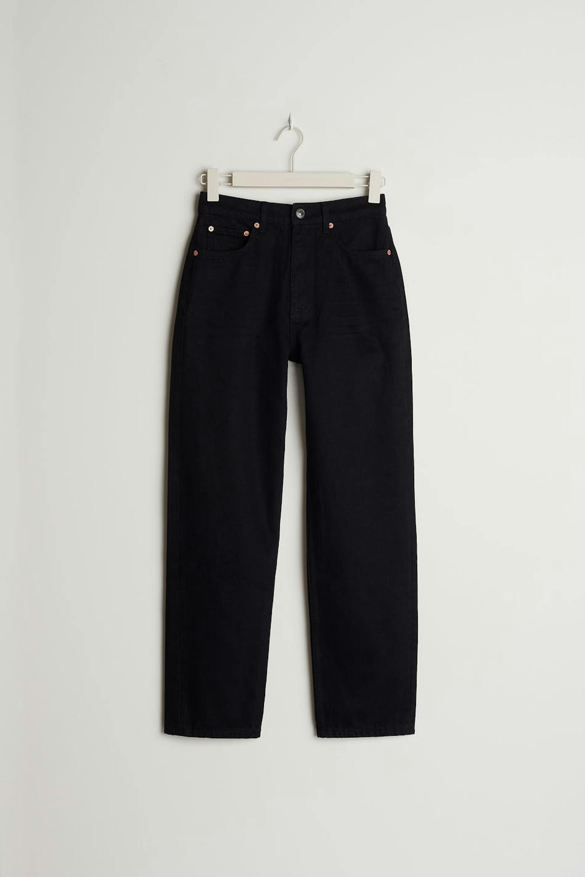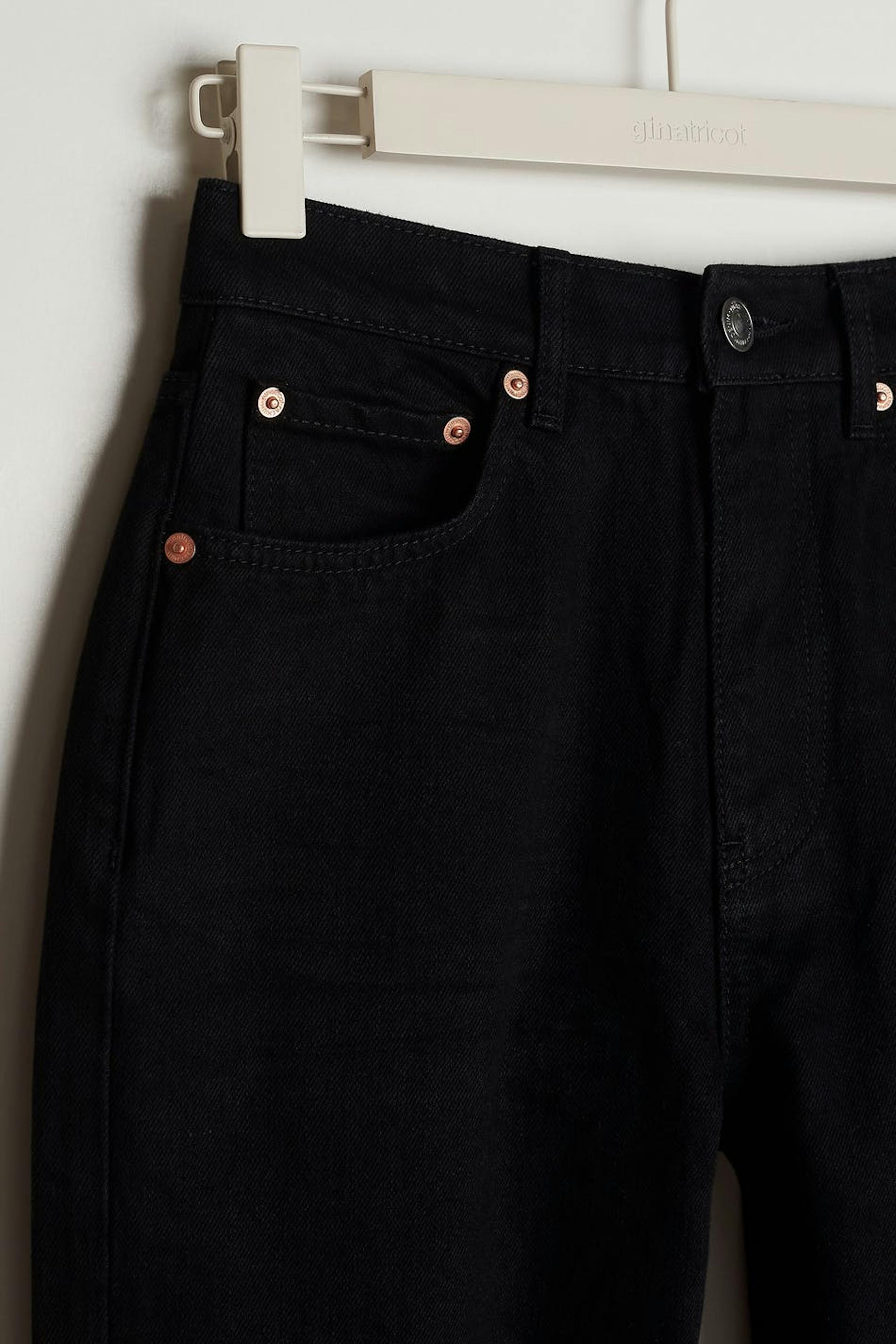 Petite highwaist jeans with a 90s inspired fit. The jeans is black and has pockets at the front and back. It has straight trouser legs with shorter leg length. Perfect for those who are 160 cm (5 ft 3 in.) or shorter.