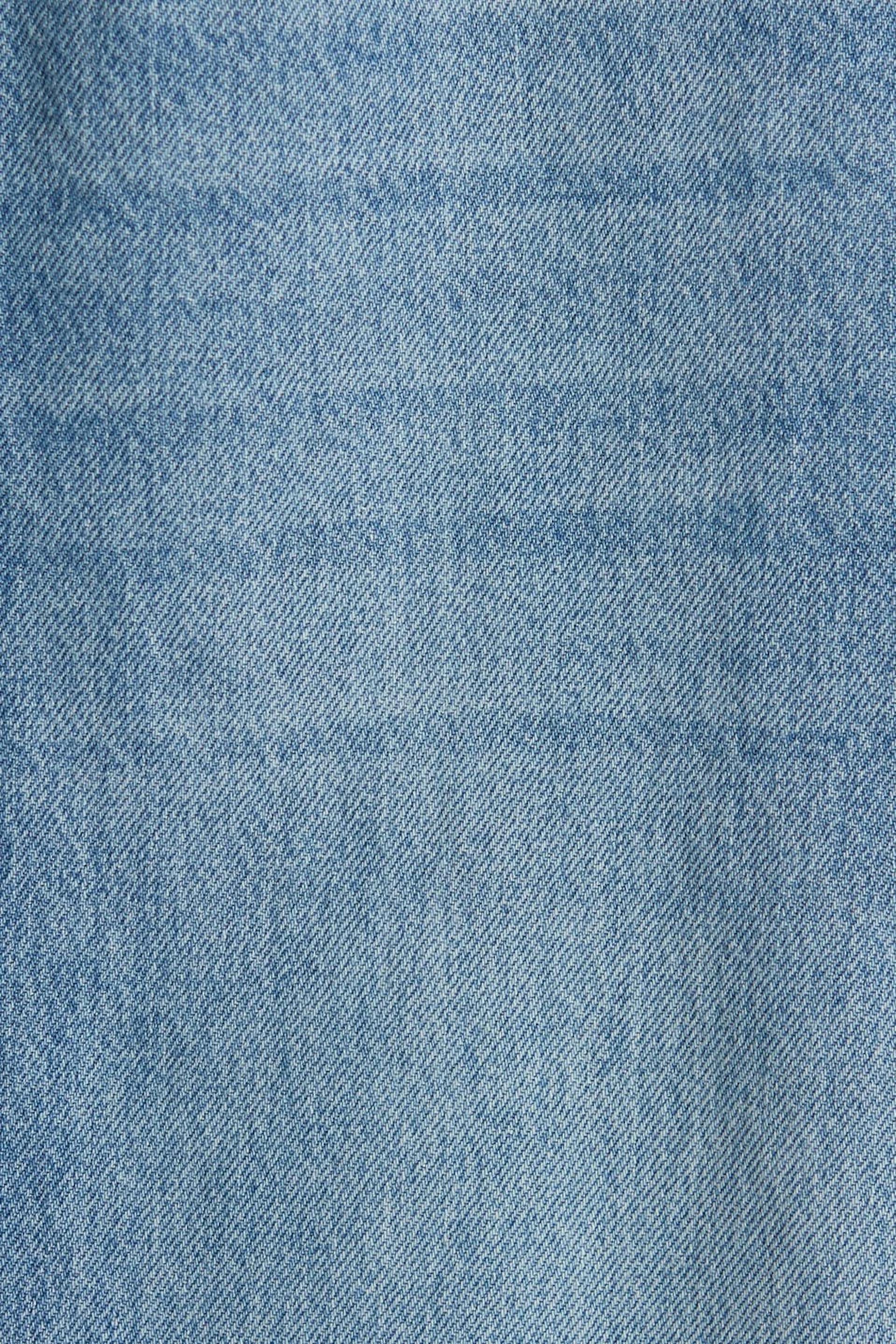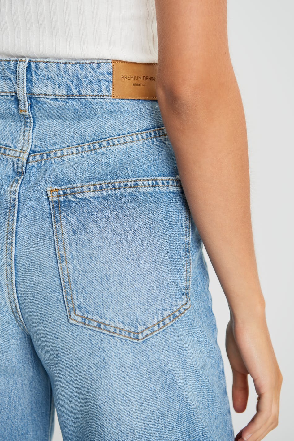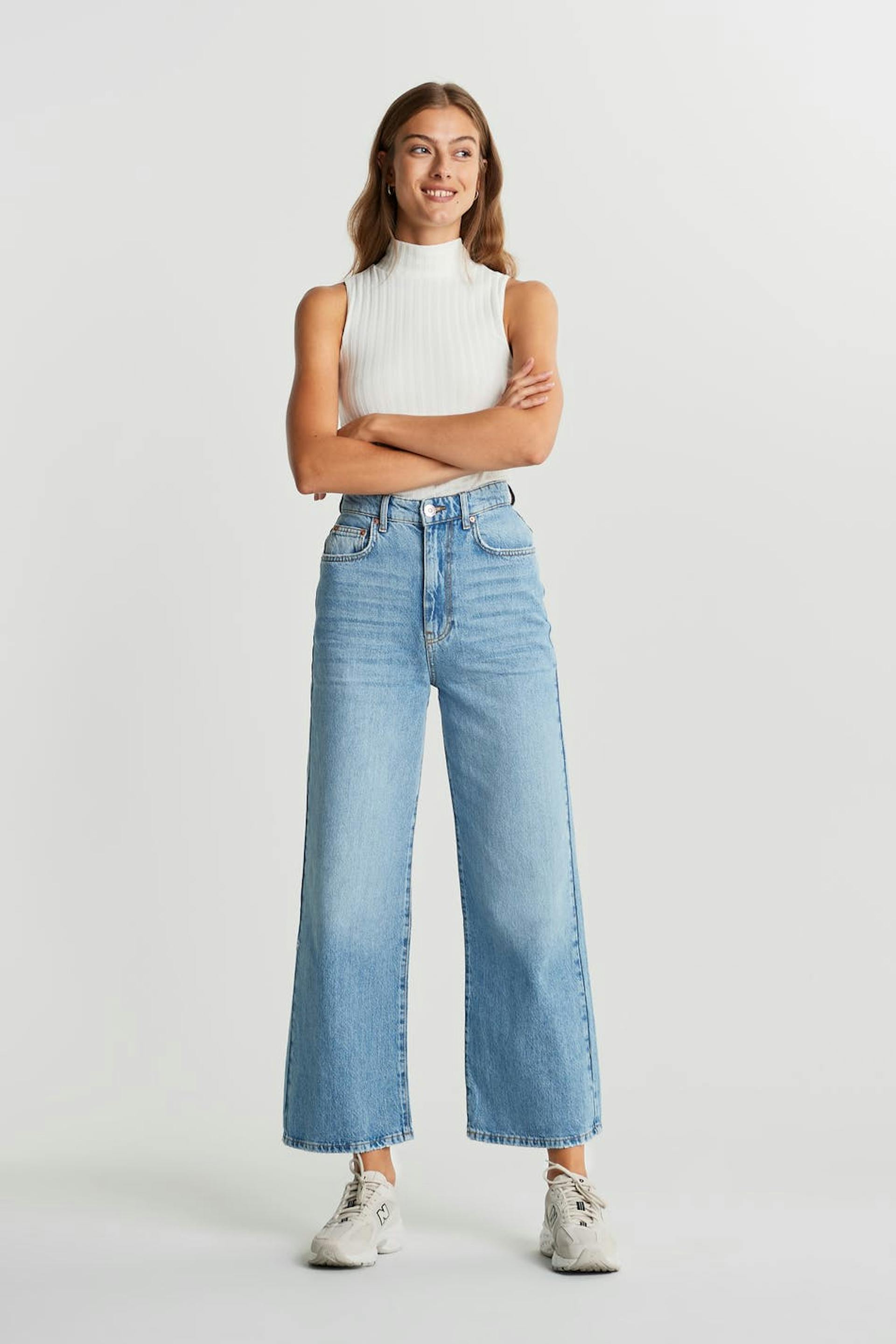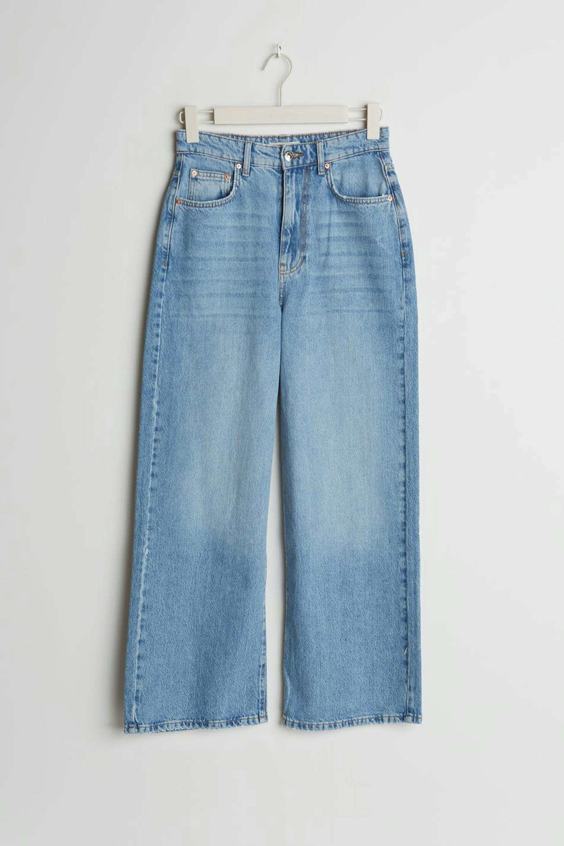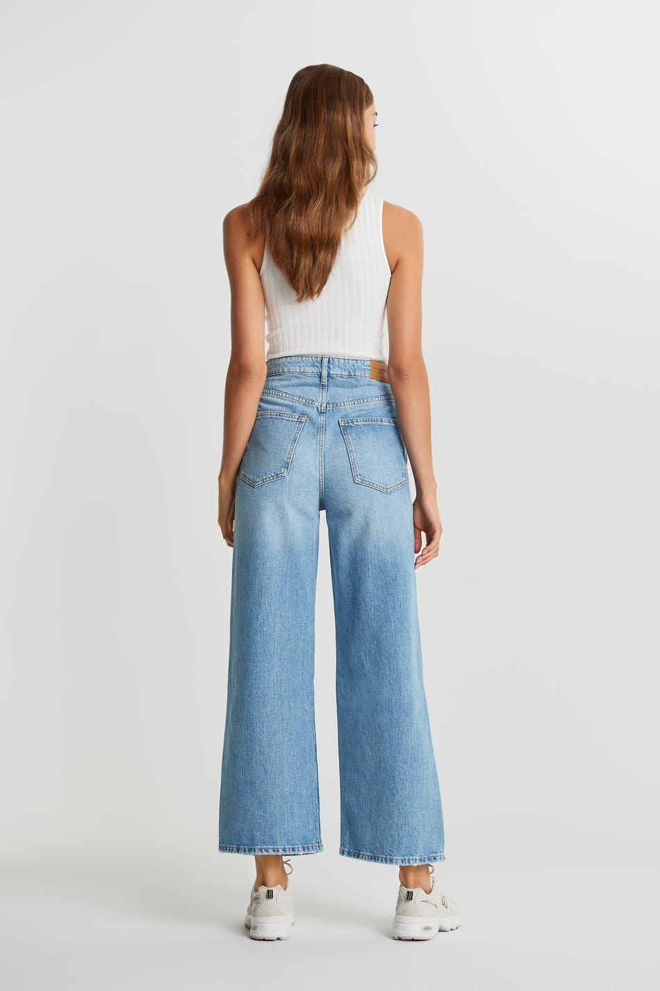 Wide jeans with a regular fit. The jeans are blue and nonstretch and have a high waist. They are made of denim and have cropped leg length.
