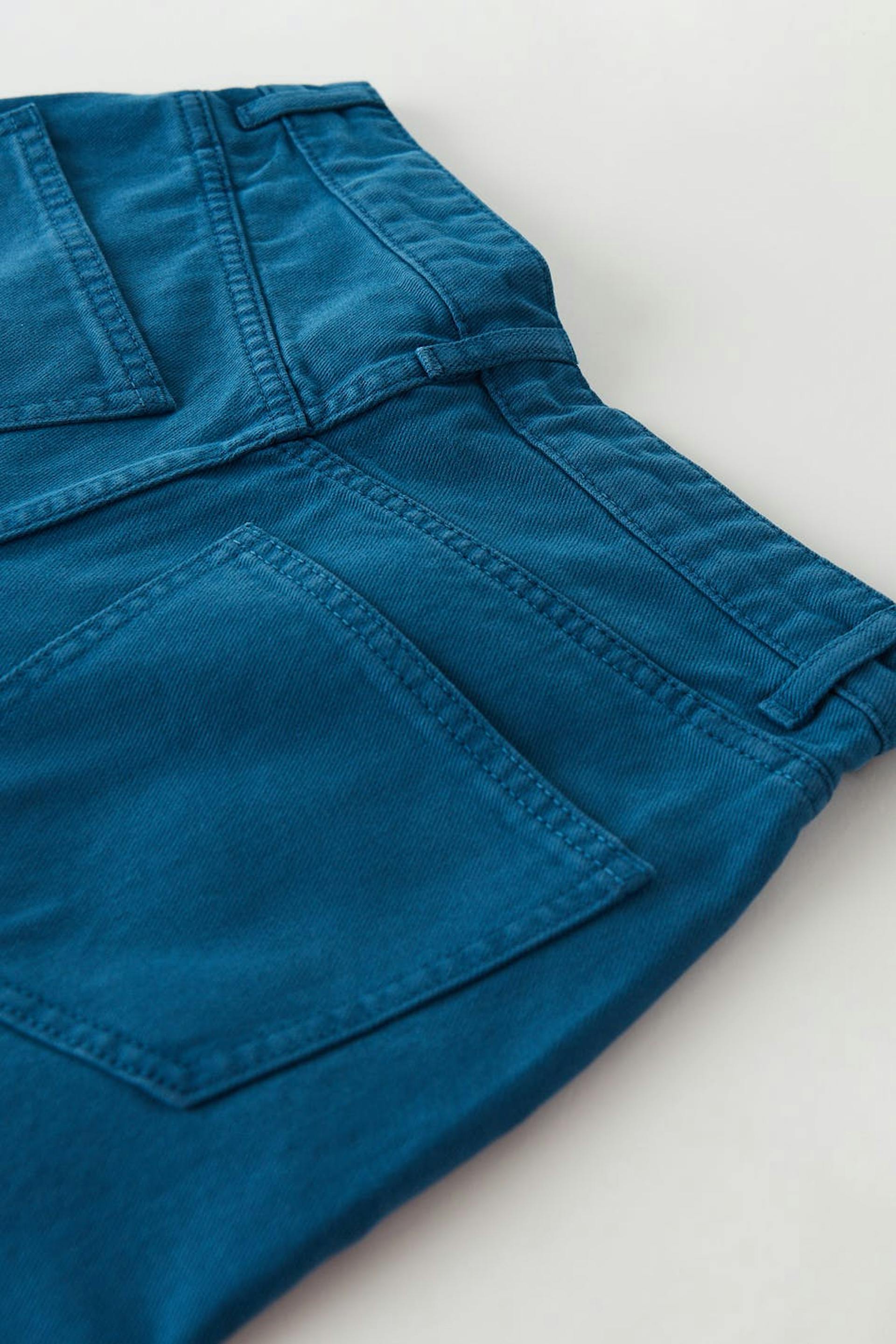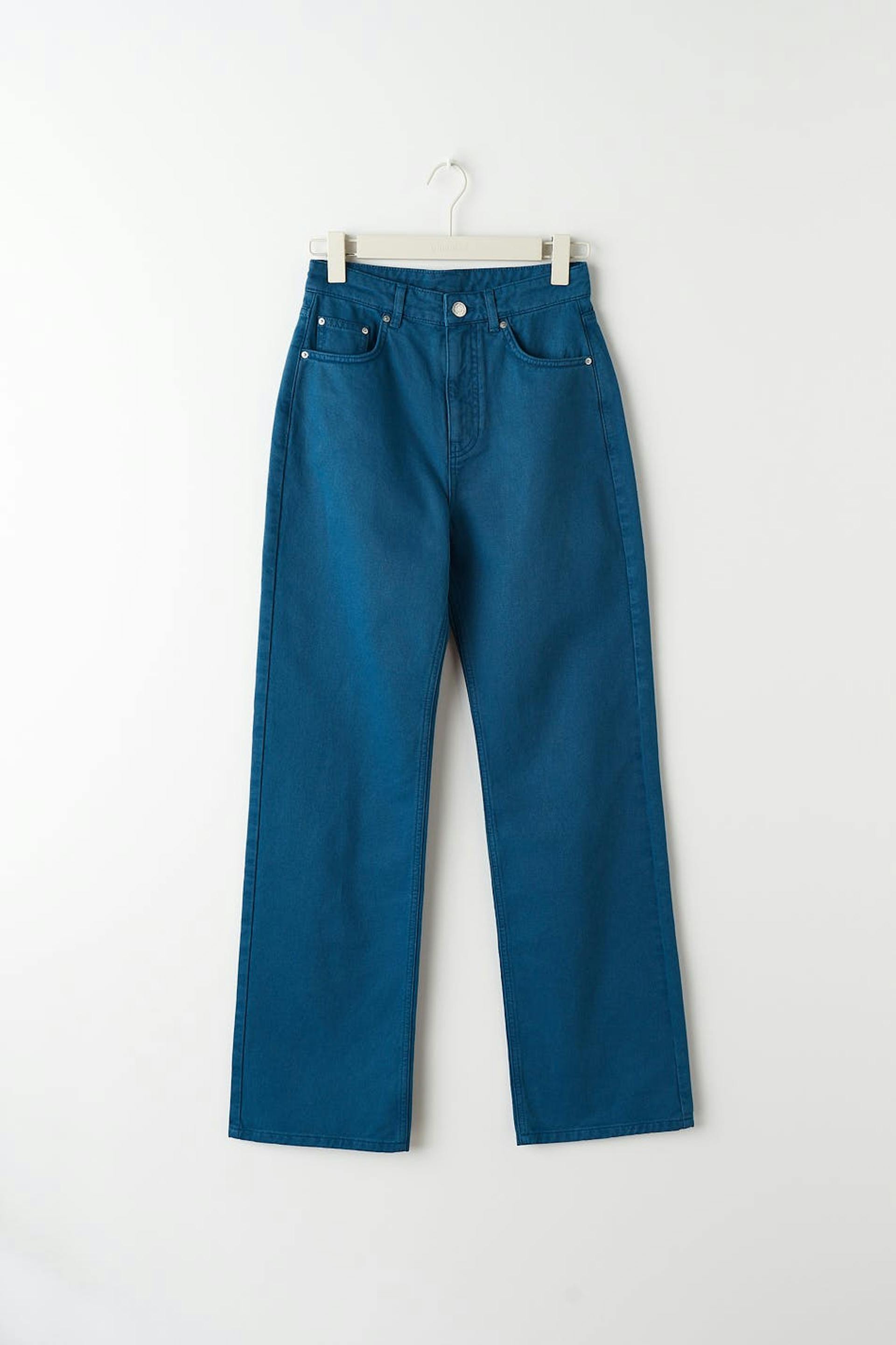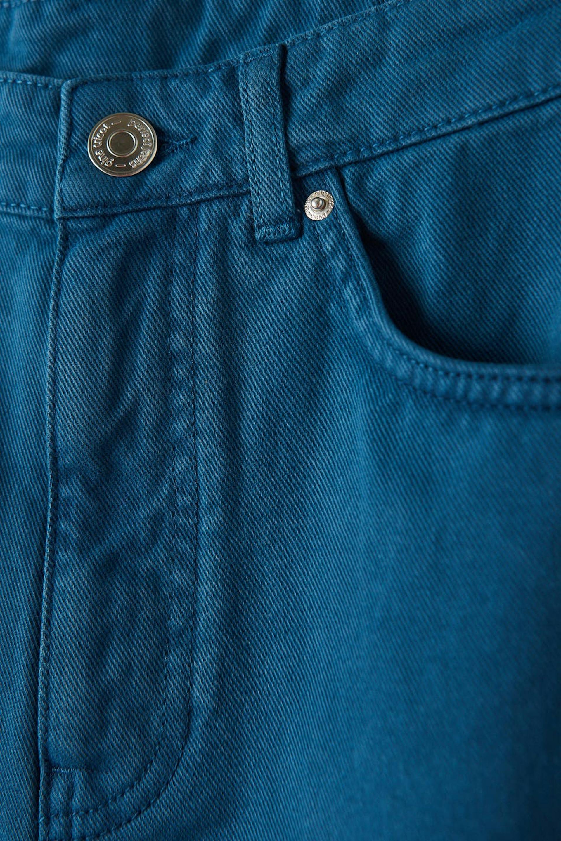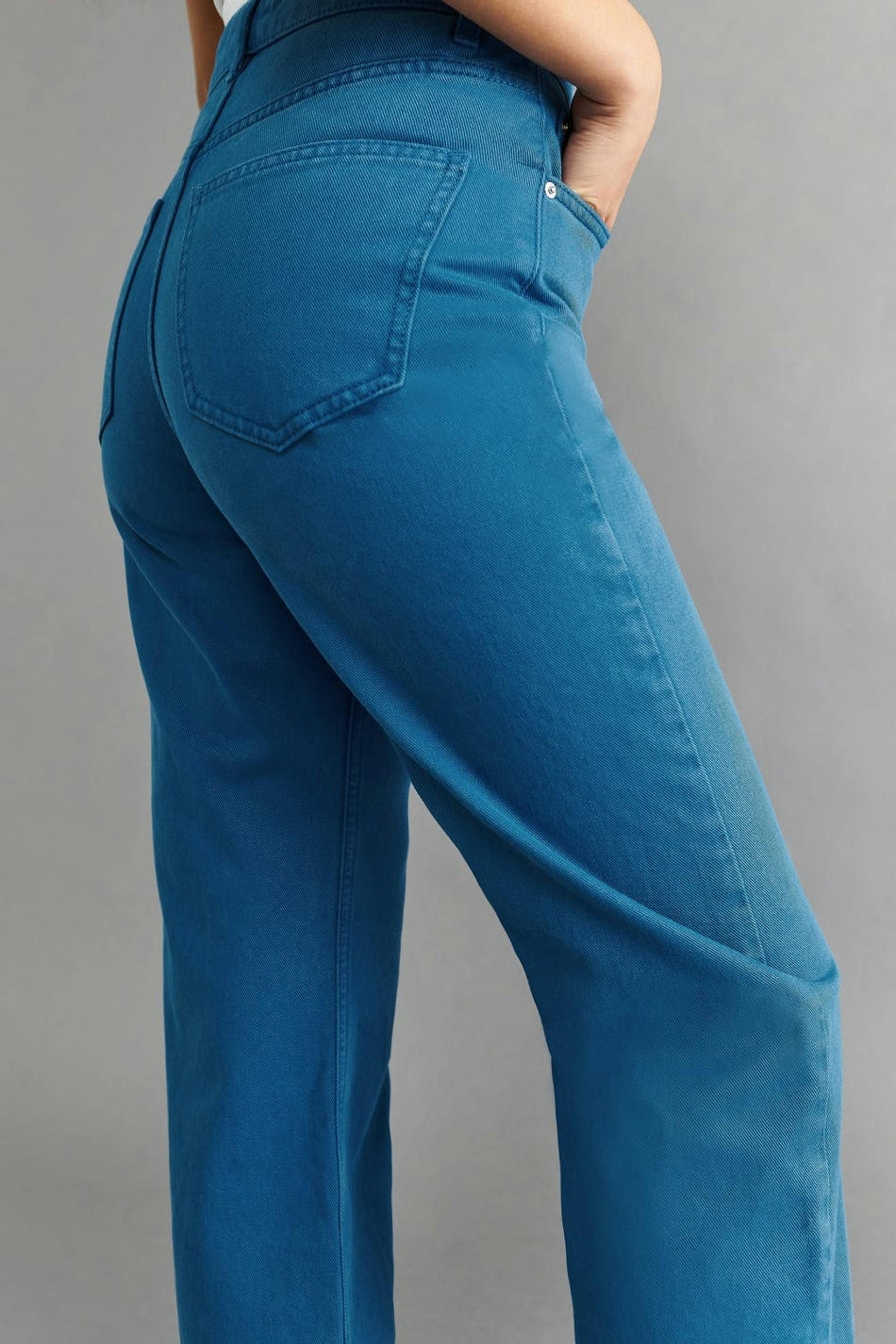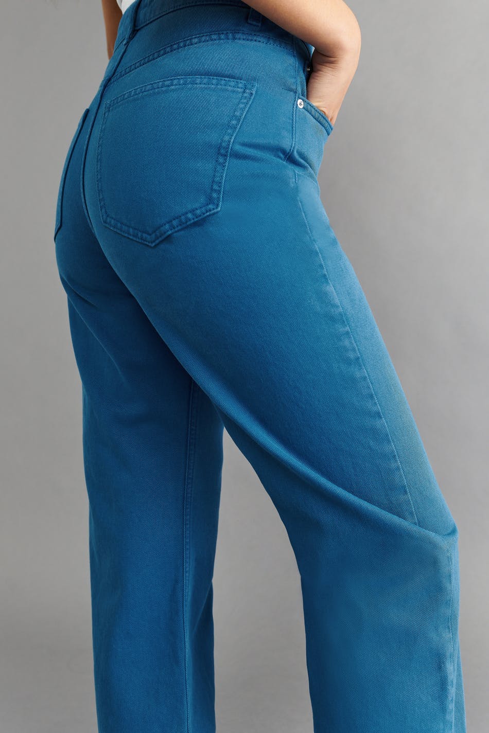 Non-stretch straight jeans with super high waist. The jeans are blue and have straight, wide legs with full length. They have zip fly and raw edge at the end of the legs. Use our size guide to find your size.
