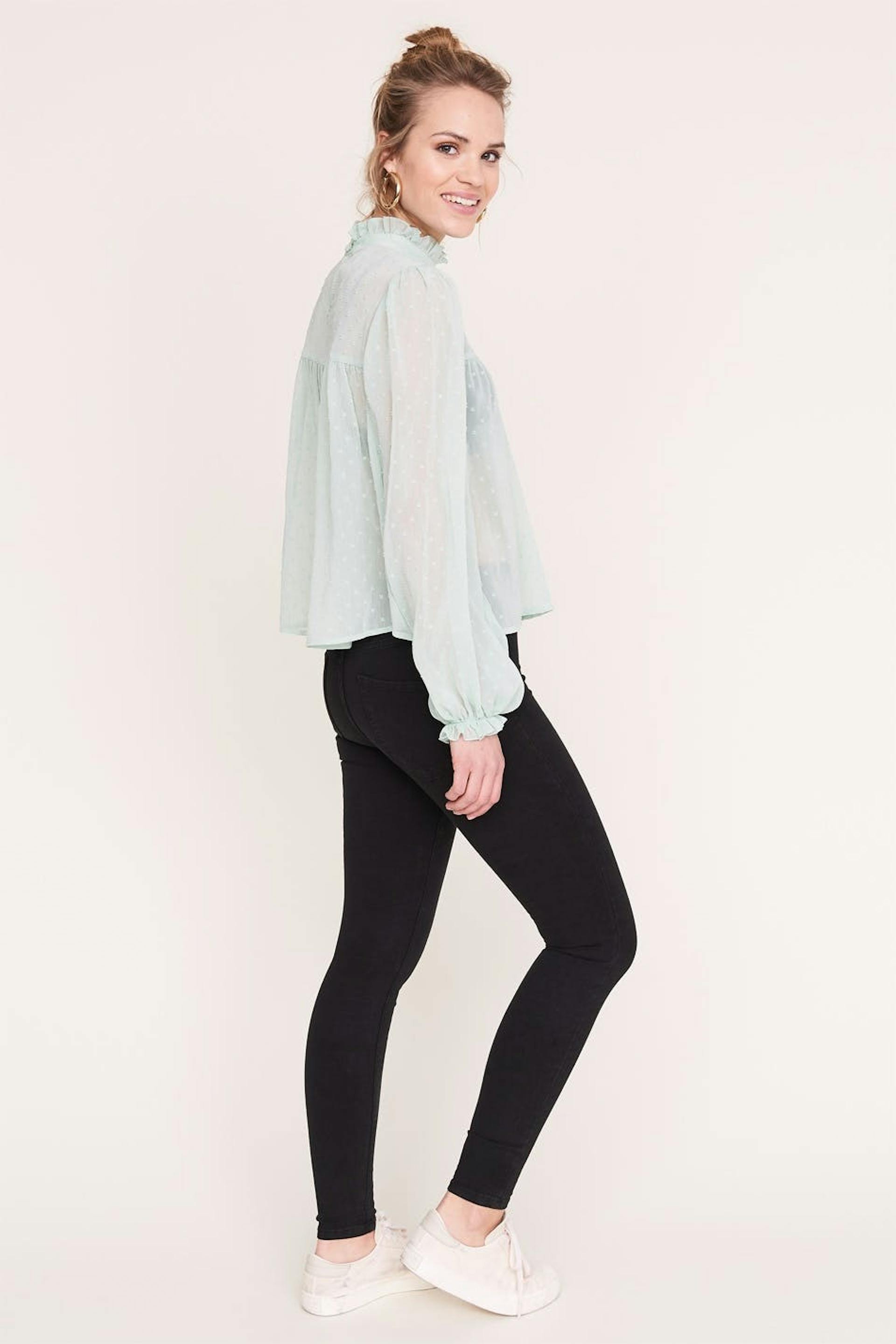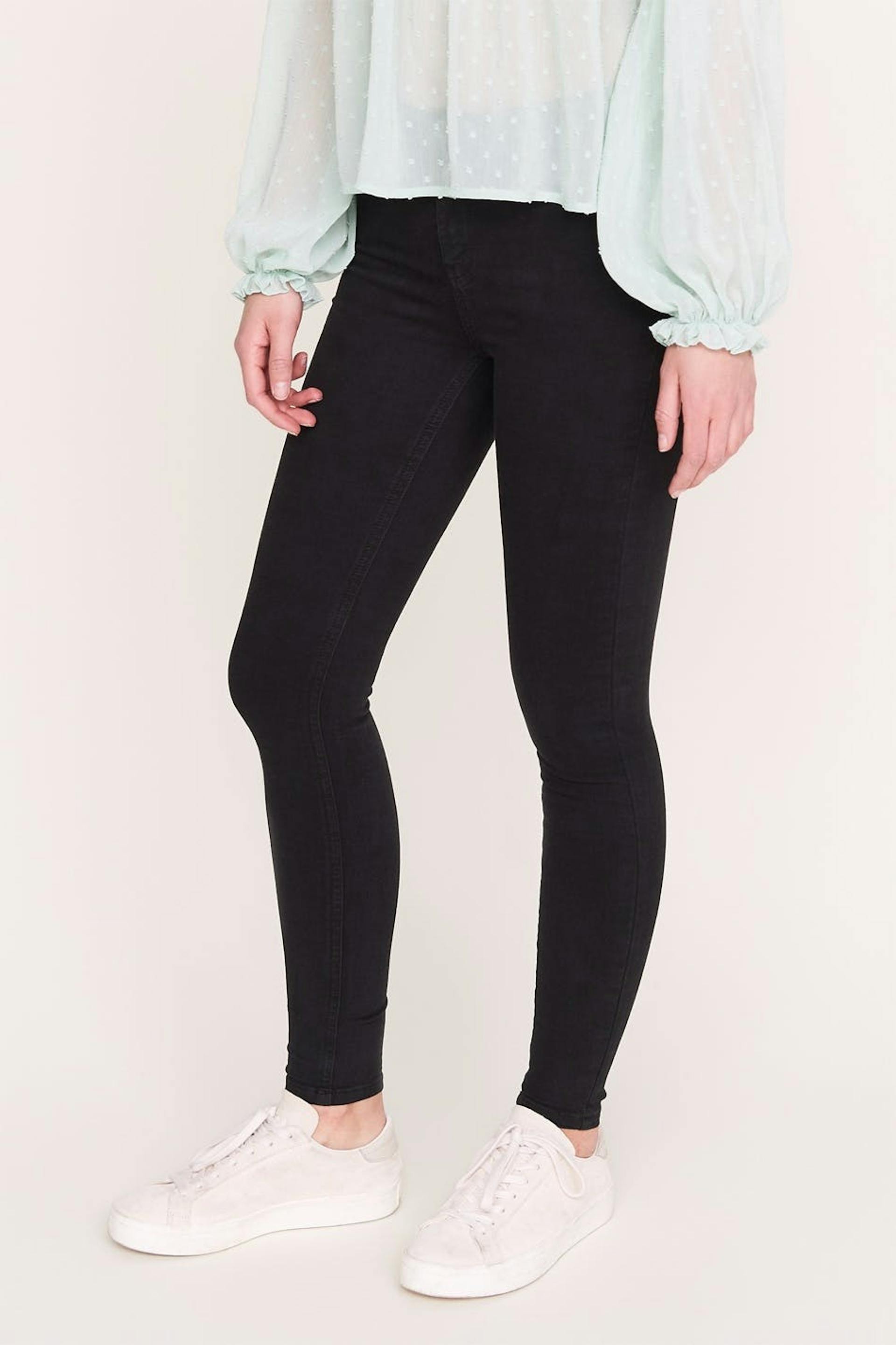 Jeans with superstretch and a high waist. The jeans is black, soft and comfortable. It has a skinny fit, fake pockets at the front and back pockets.