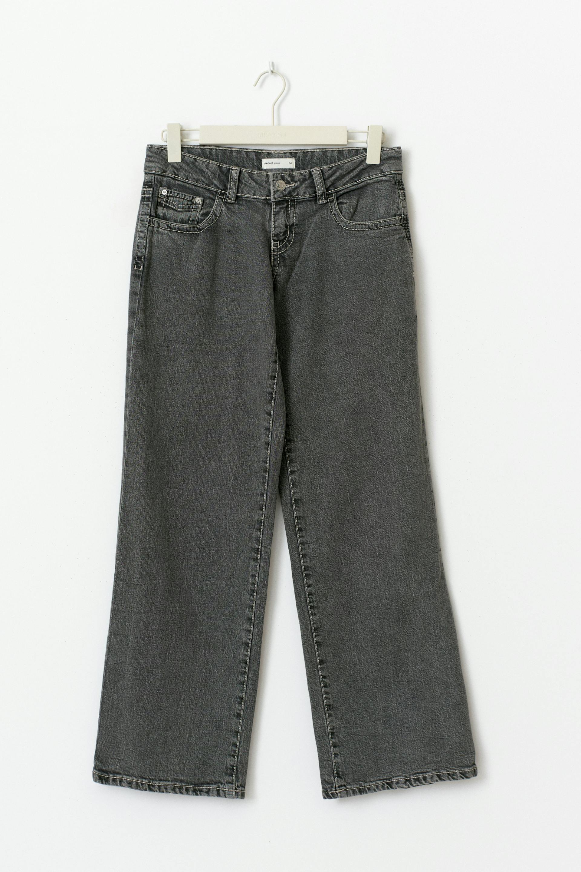 Tall jeans with low waist. The jeans are grey and have wide legs with full length. They have comfort stretch, regular fit, zip fly, waistband with belt loops, front pockets and back pockets with seam details. Perfect for those who are 175 cm (5 ft 9 in.) or taller.