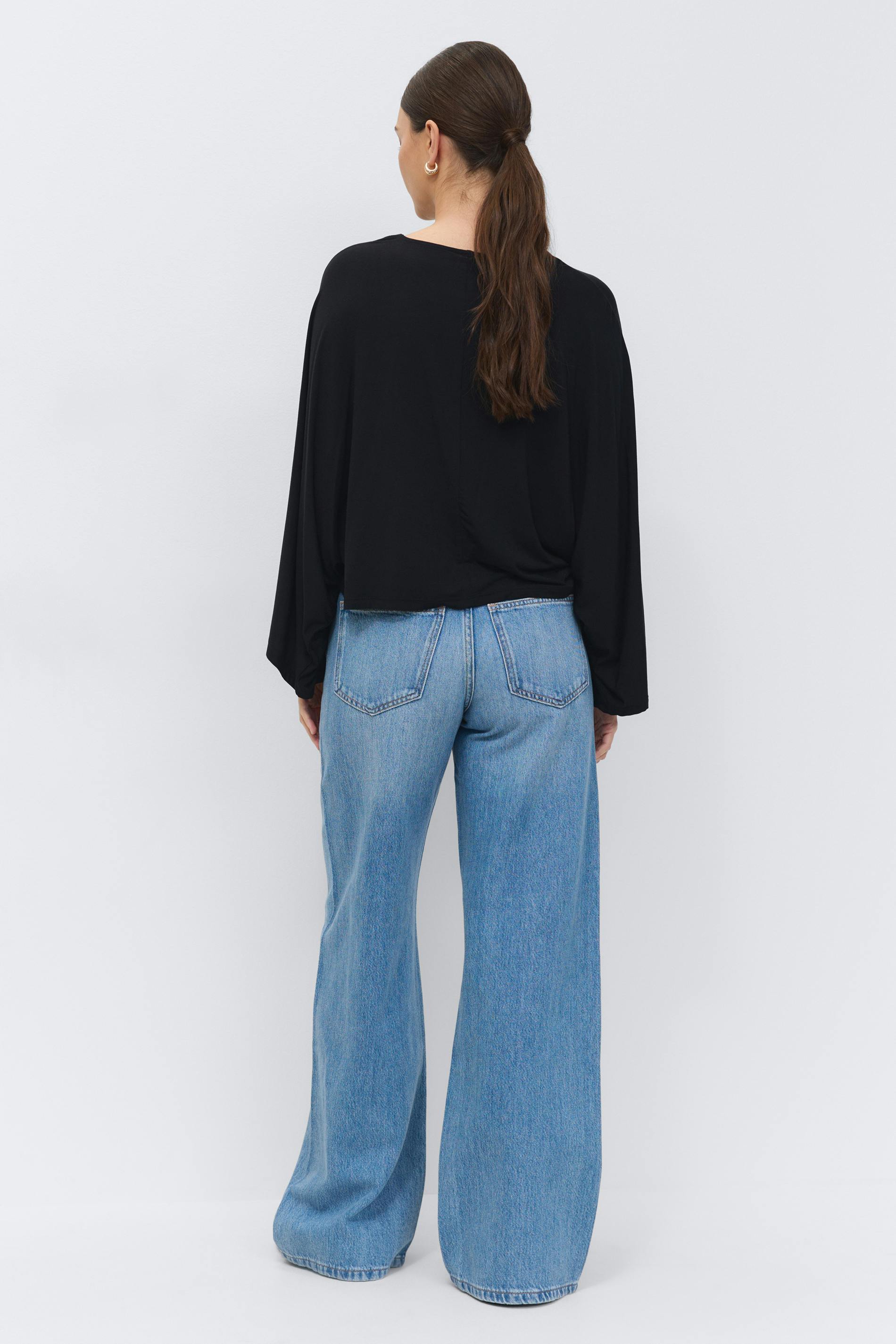 Wide jeans with low waist. The jeans are blue and have a wide leg with full length. They have regular fit, belt loops, zip fly and pockets at the front and back. Use our size guide to find your size.