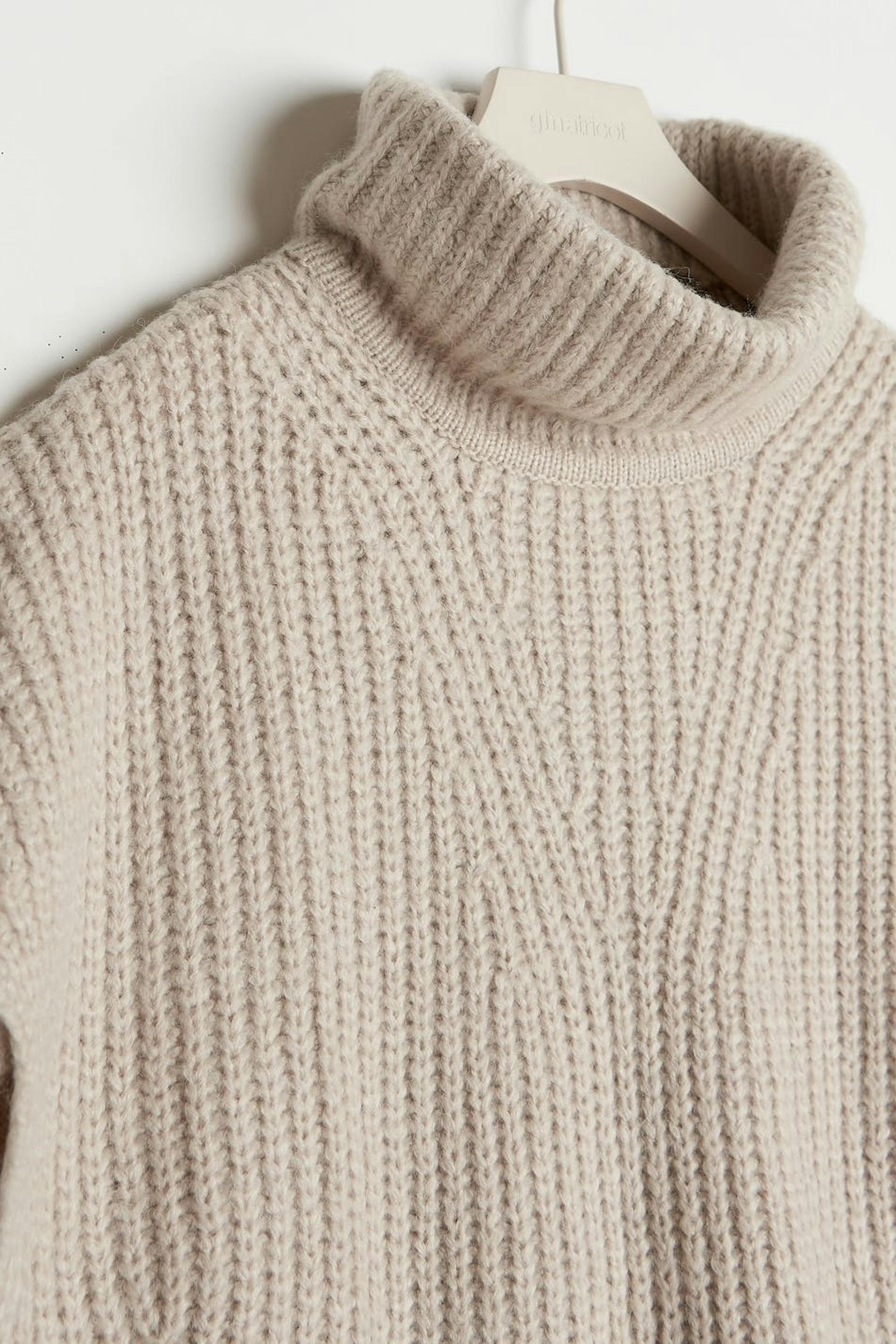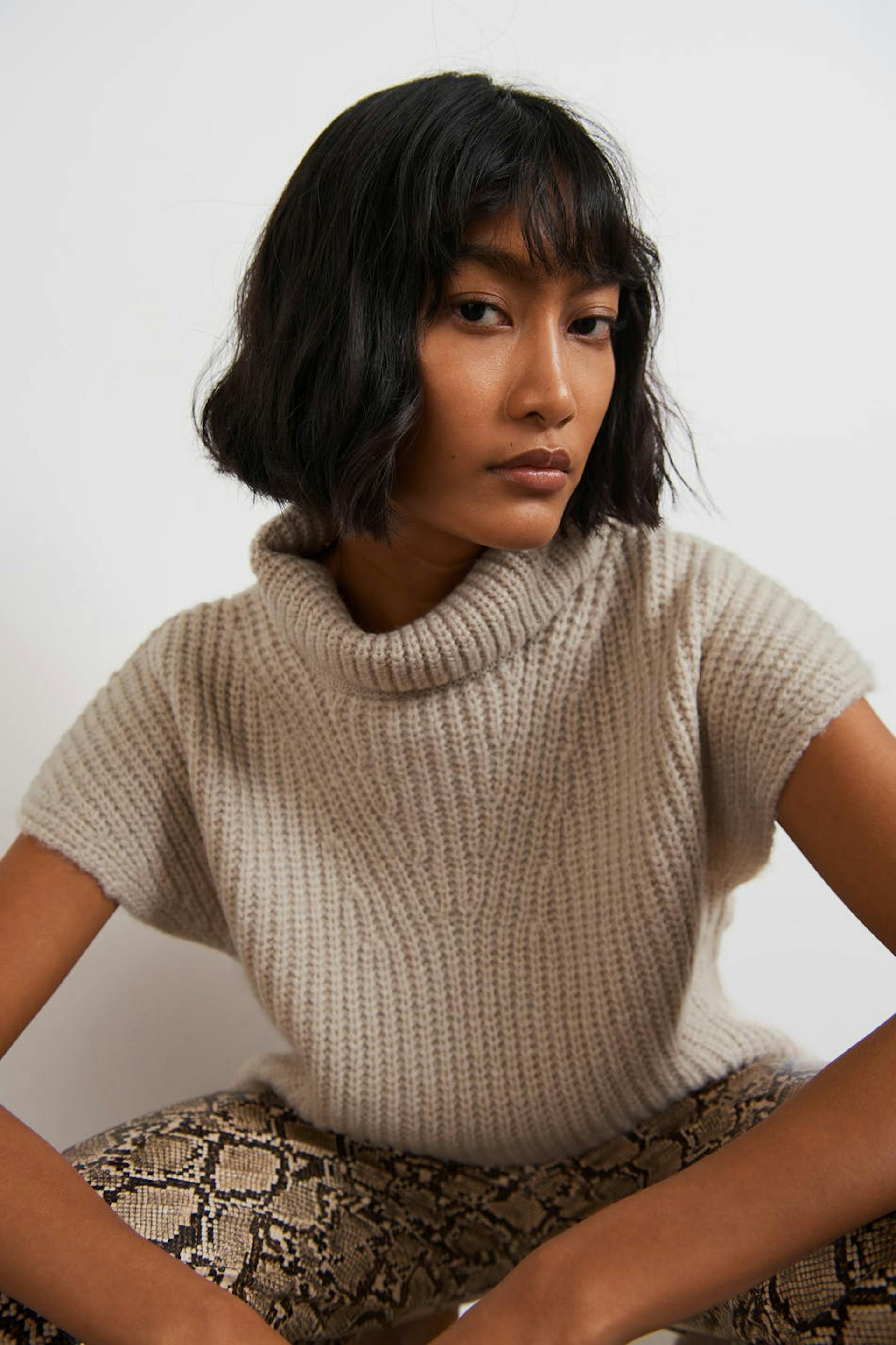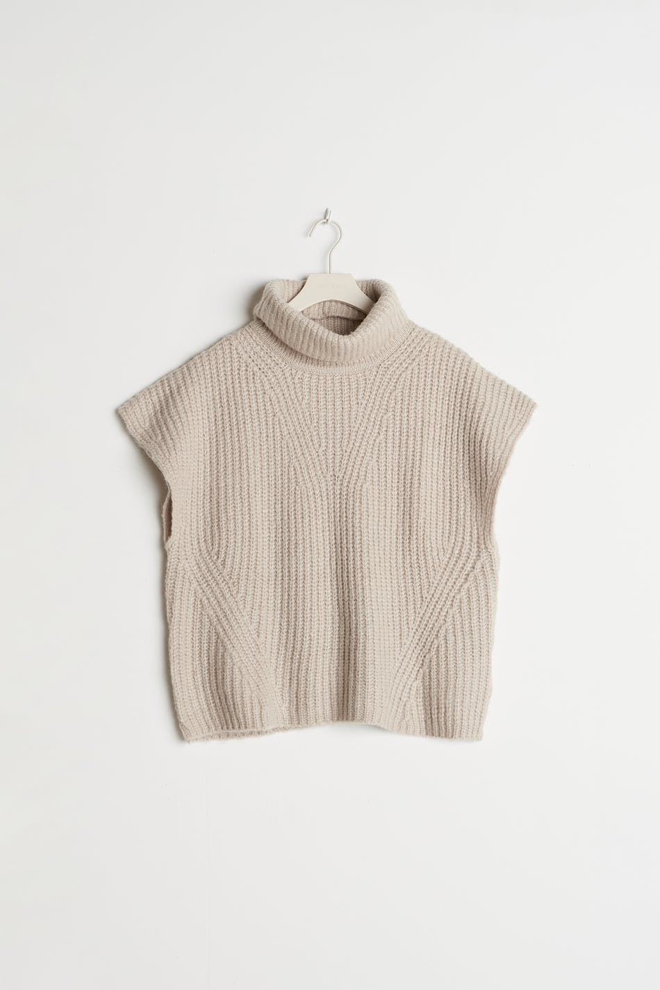 Knitted waistcoat with turtleneck. The waistcoat is beige and has a boxy fit.