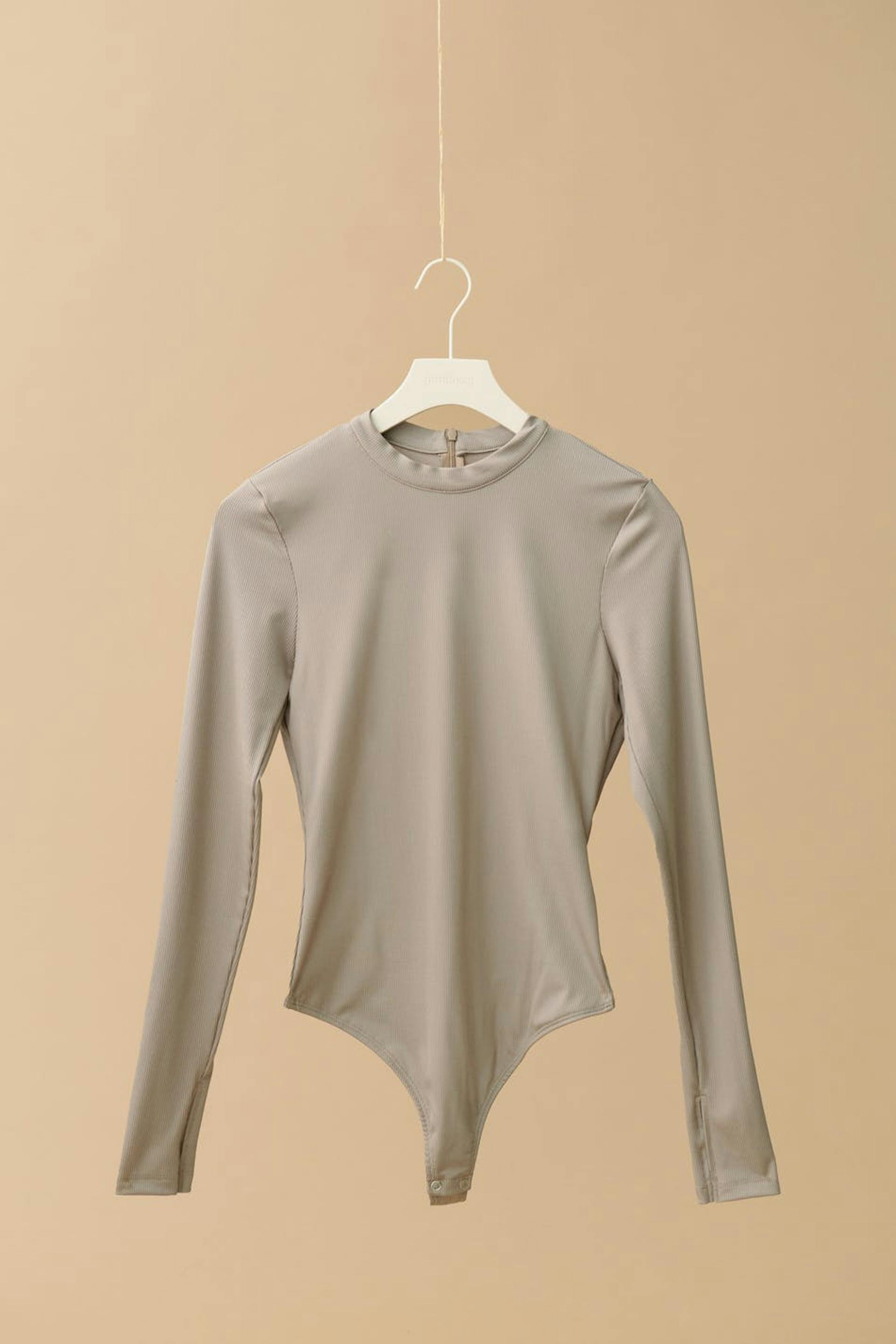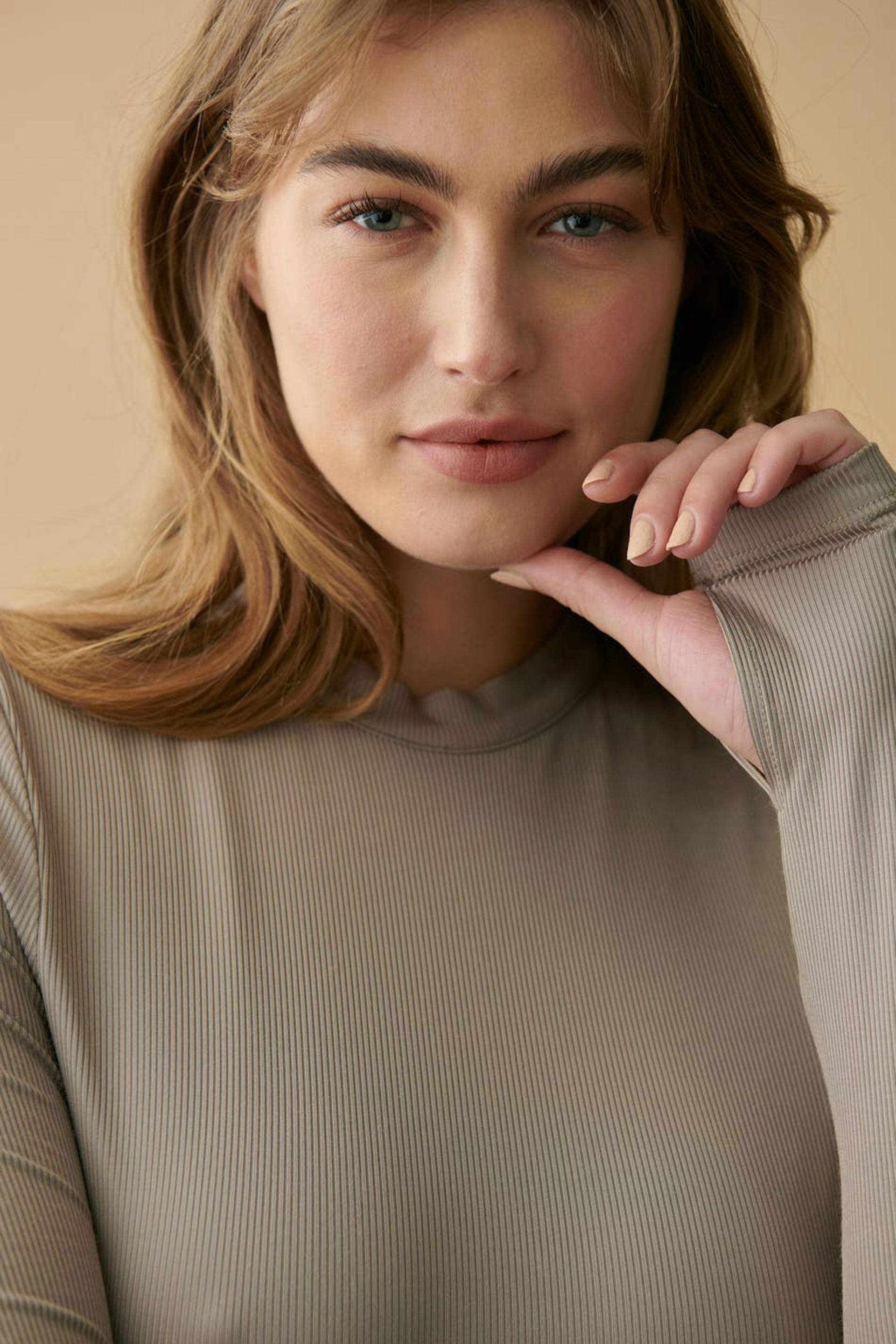 Allvar X Gina Tricot. Long-sleeved bodysuit with string at the back. The bodysuit is beige and has figure-hugging fit. It has ribbed quality, high neckline, thumbholes on the sleeve ends and button placket at the crotch. All garments in the collection are locally produced in Borås, Sweden and created of wood fibres from Swedish forests.