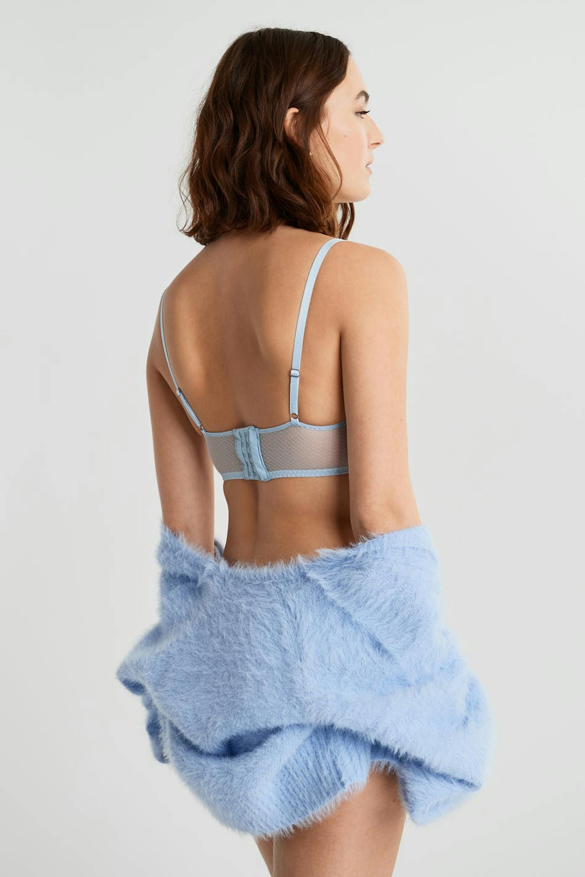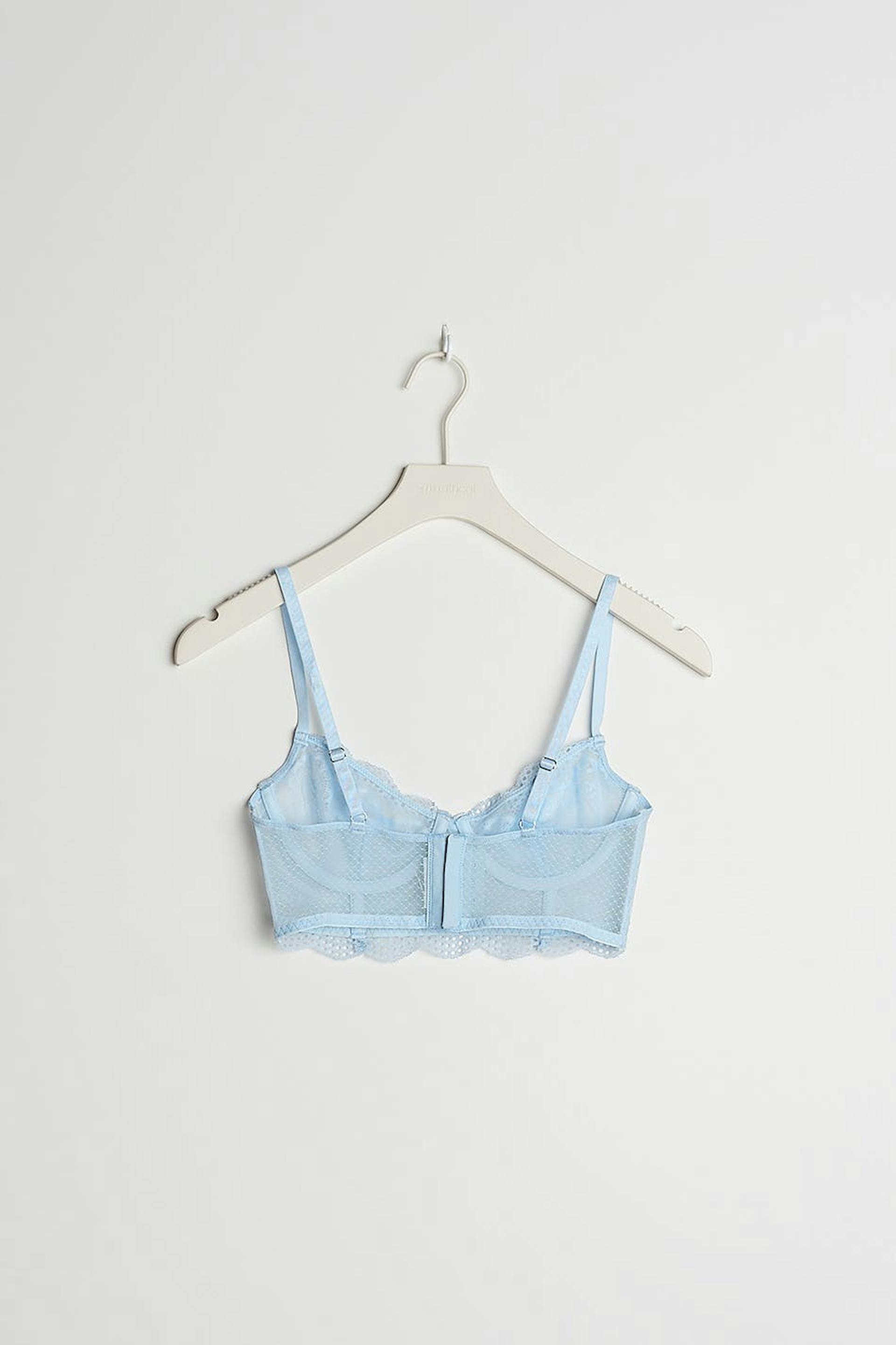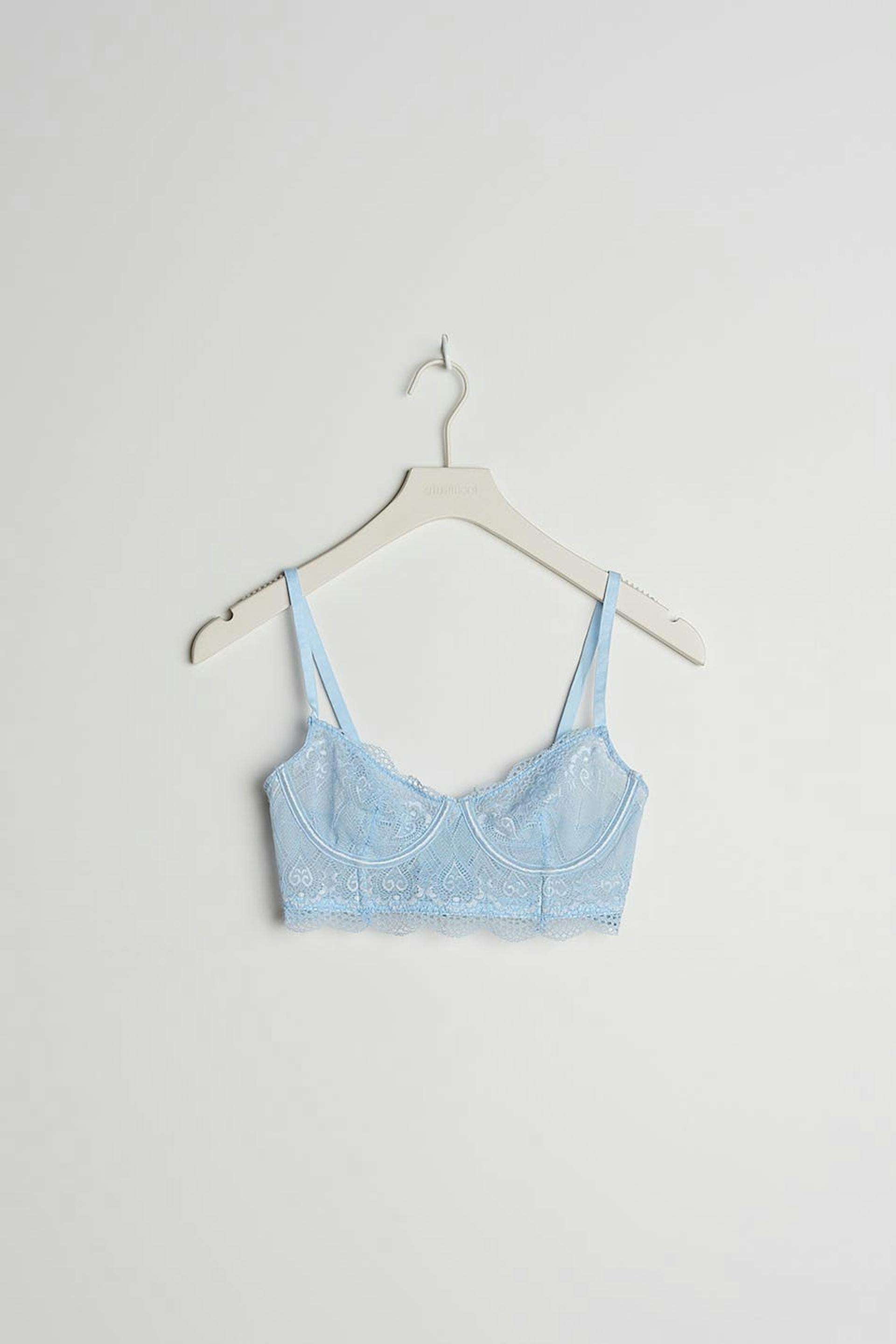 Bra with unpadded cups with an underwiring below the bust. The bra is light-blue and has thin, adjustable shoulder straps. It is made of lace and has a clasp in the back and a detail in lace at the hem.
