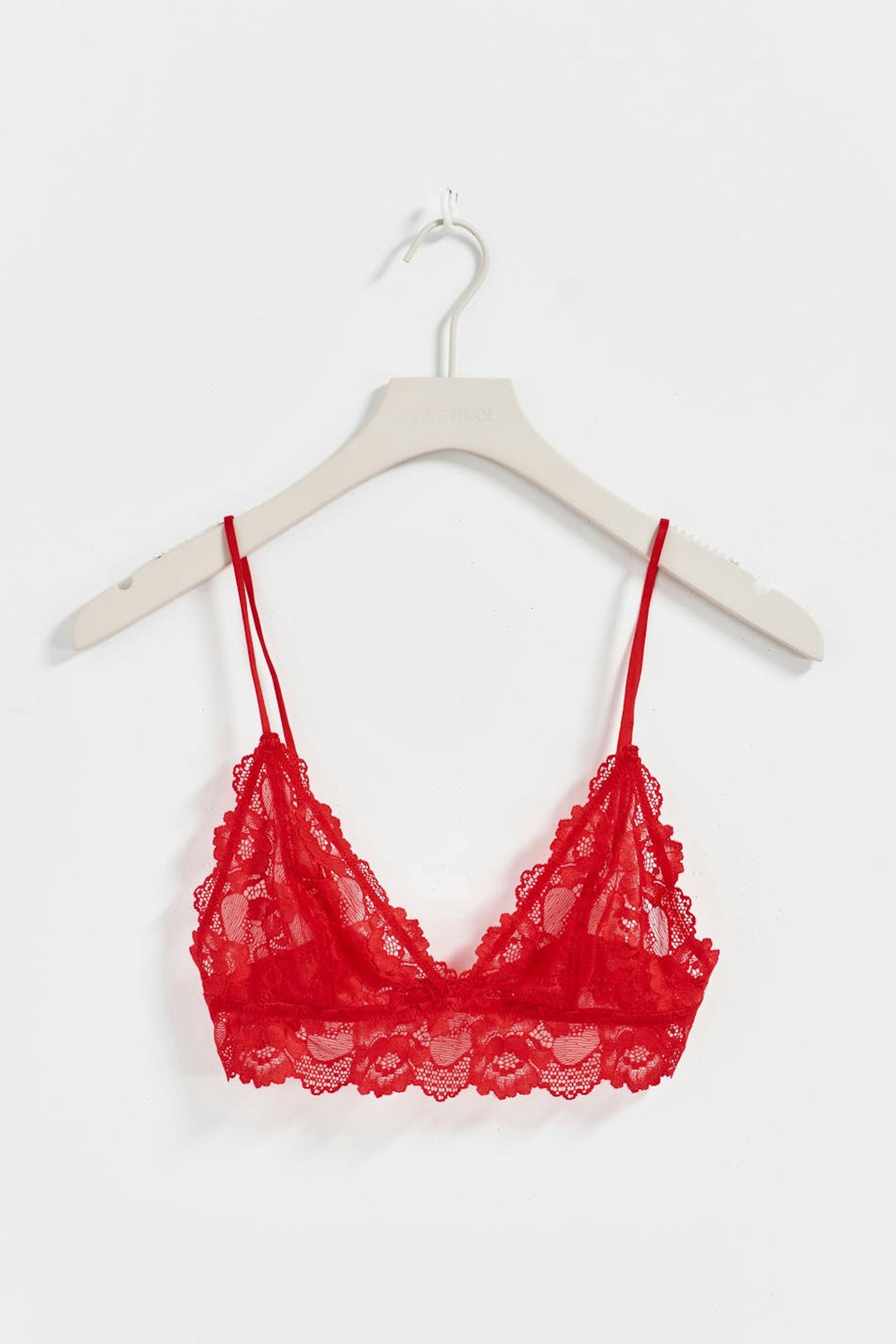 Bralette in lace with adjustable shoulder straps. The bralette is red and has mesh lining. It has hook-and-eye closure at the back.