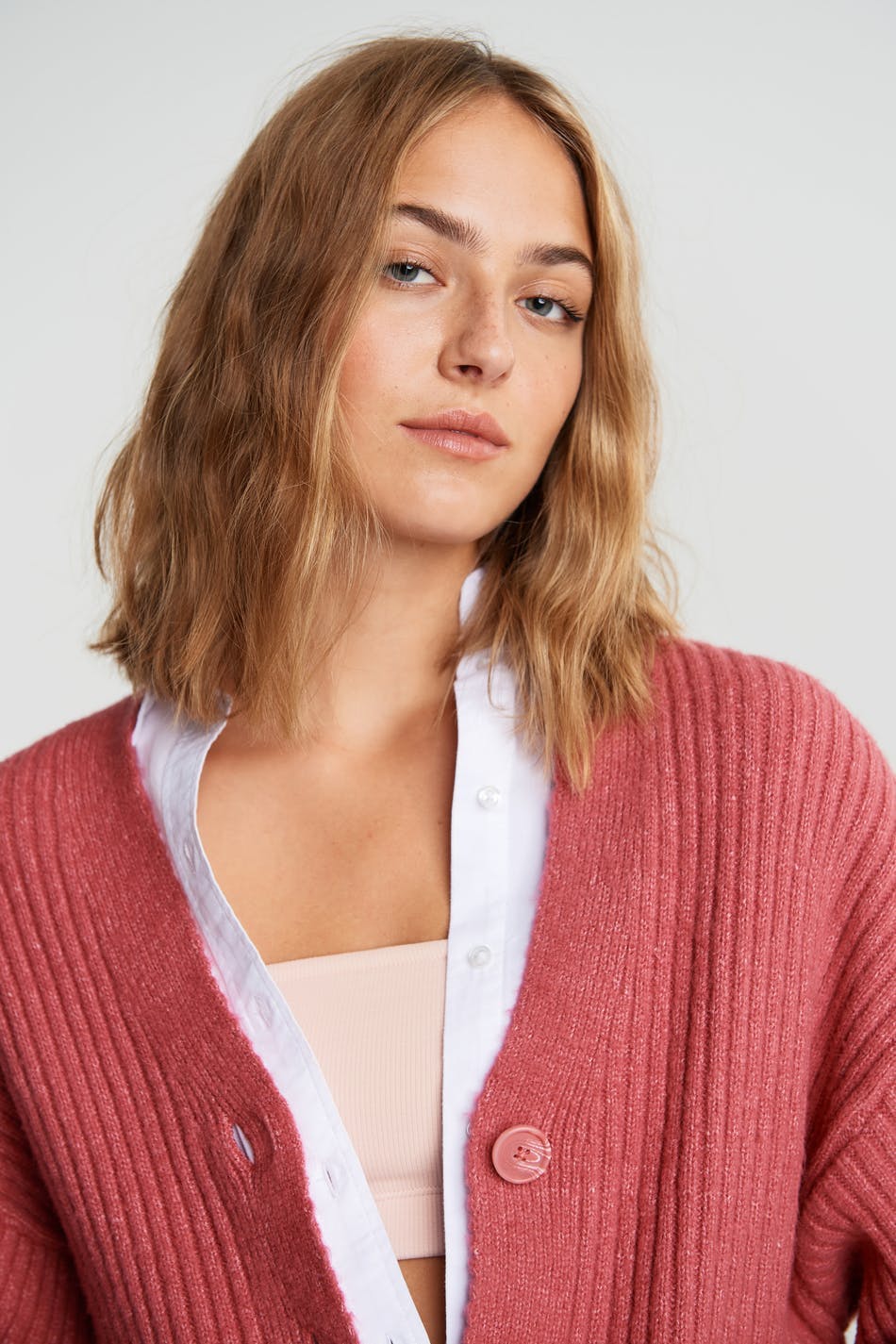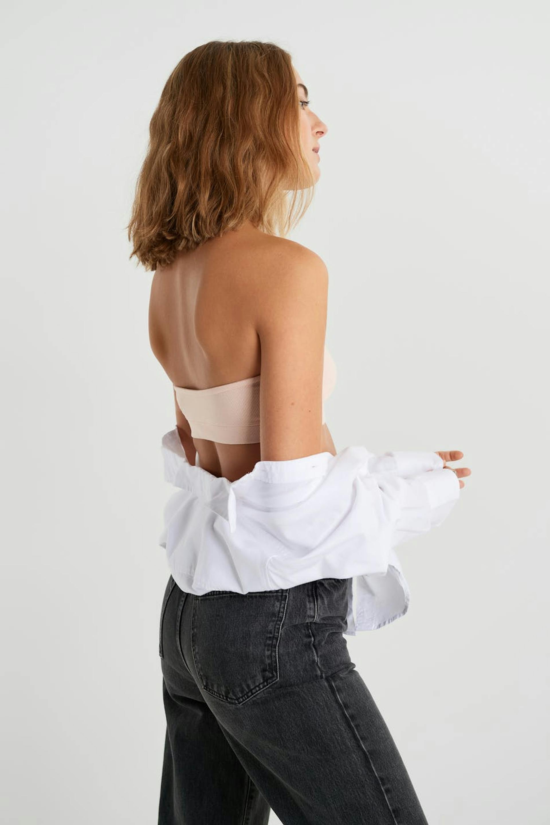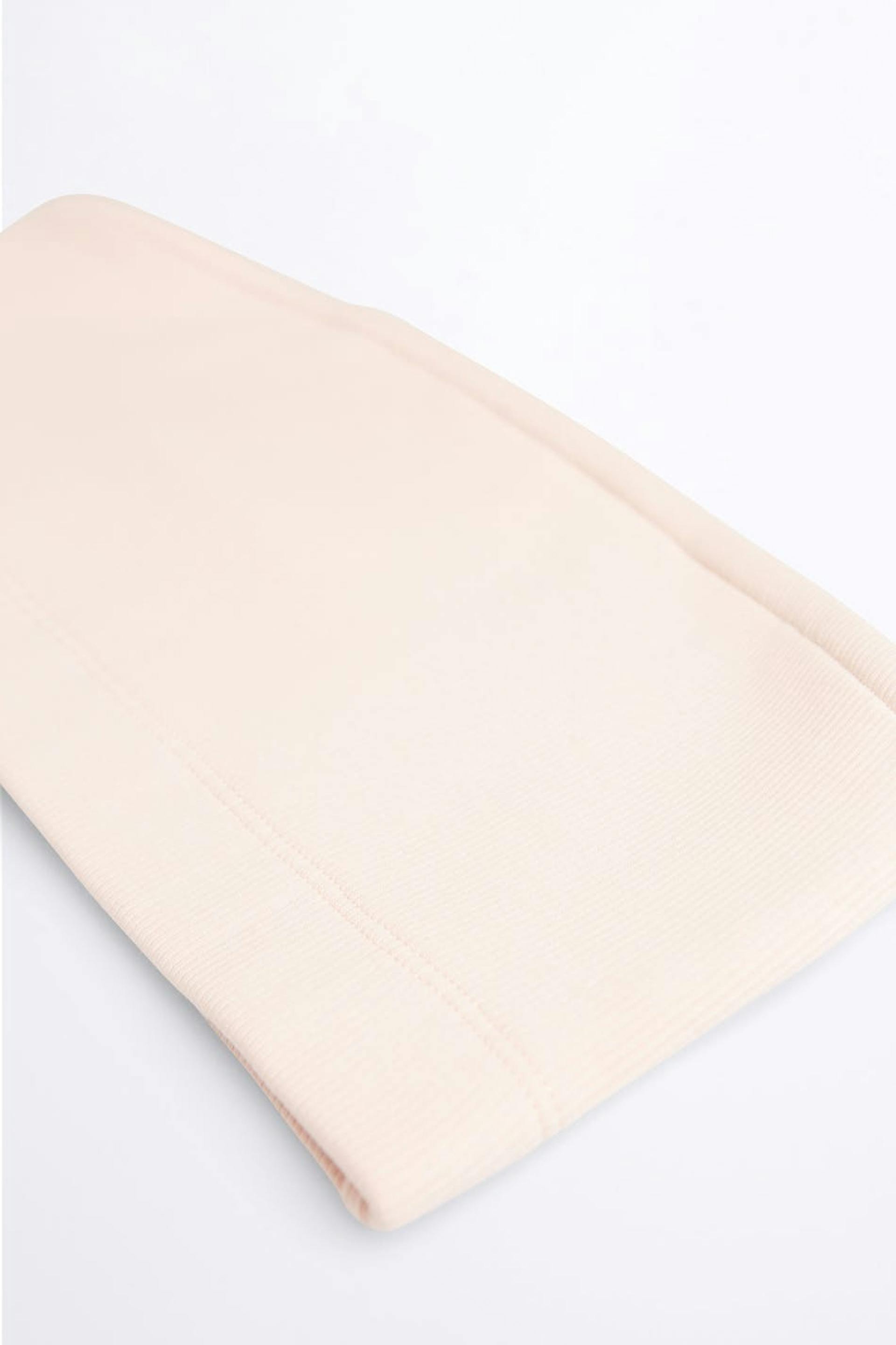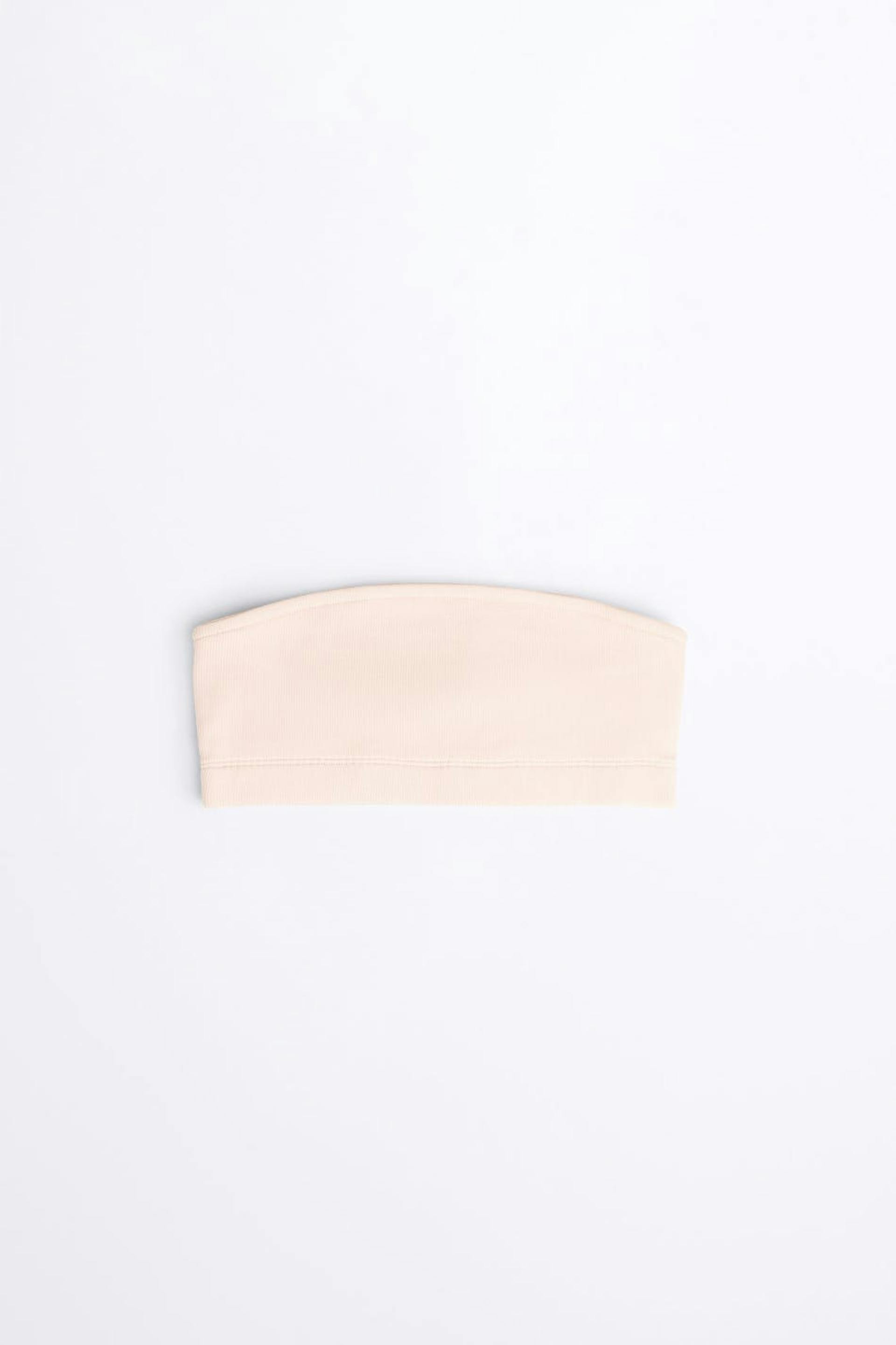 Ribbed bandeau bra. The bra is light pink. It is made of cotton.