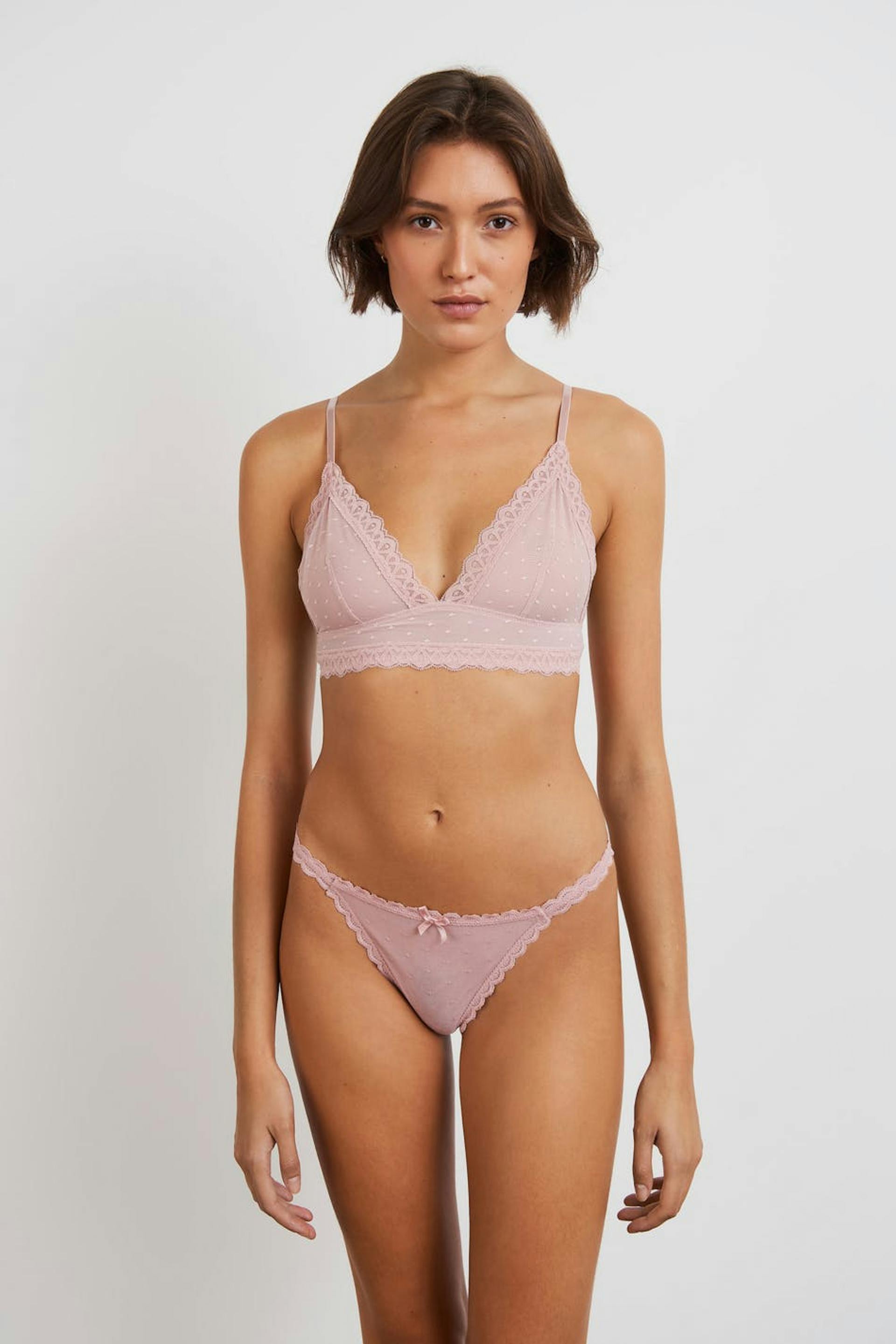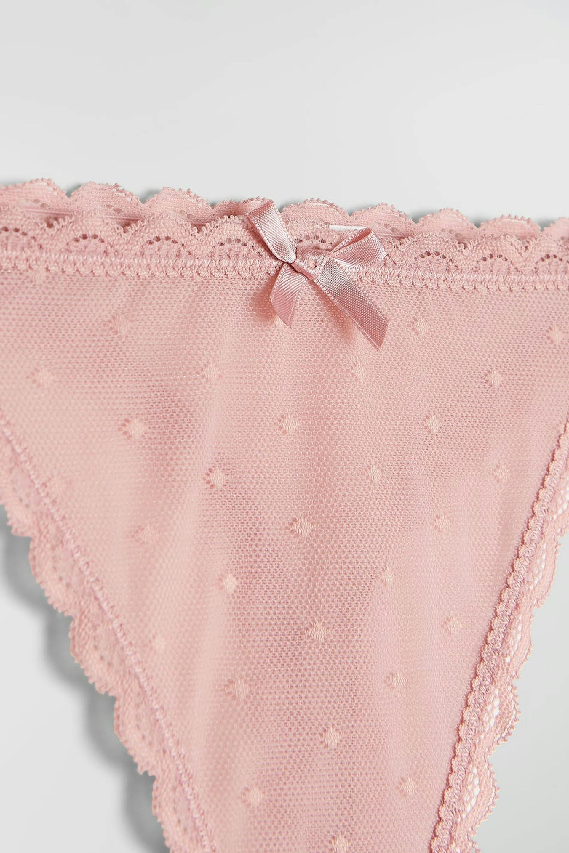 Thongs with a soft lining between the legs. The thongs are pink and have thin bands in lace. They have a detail at the front with a ribbon.