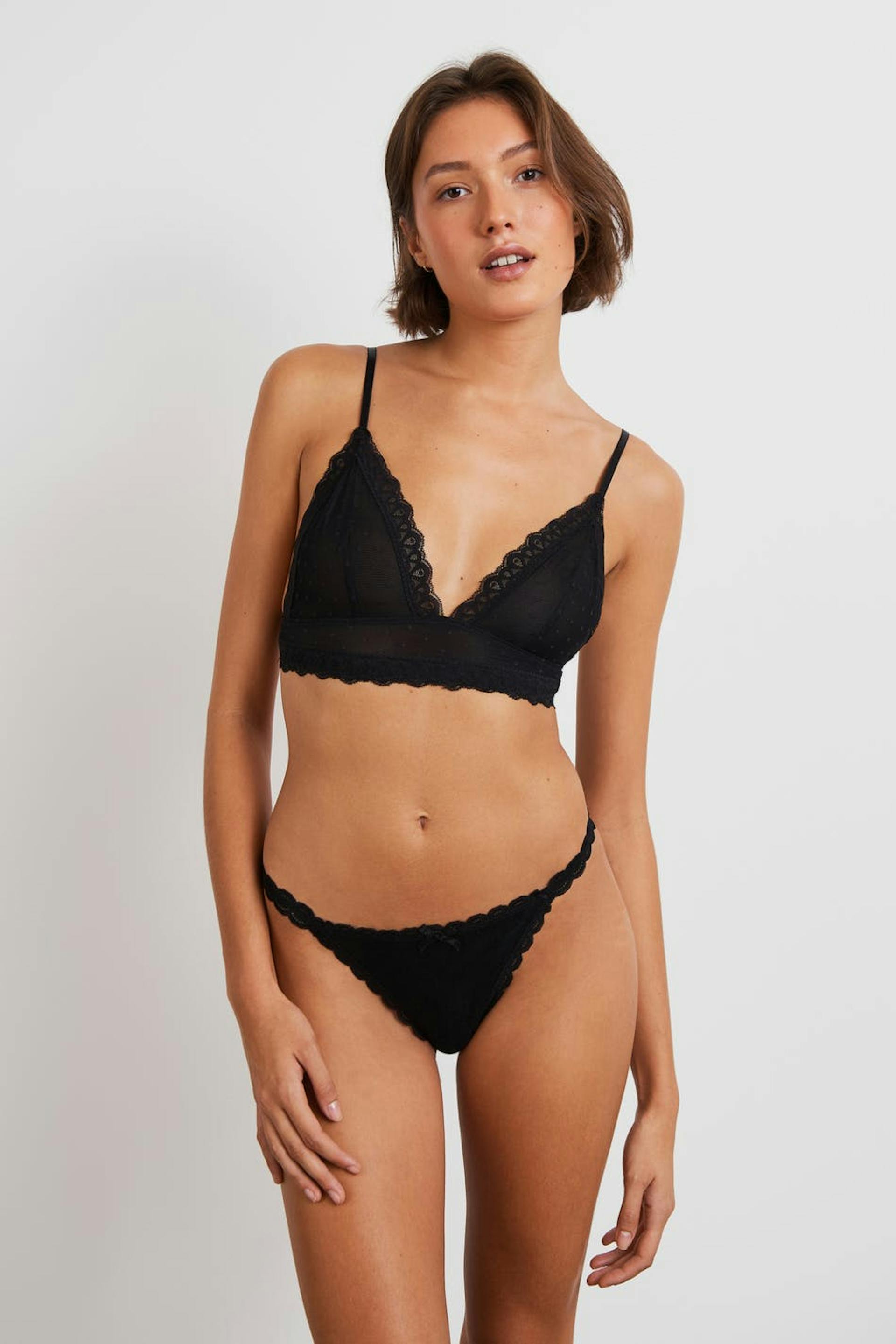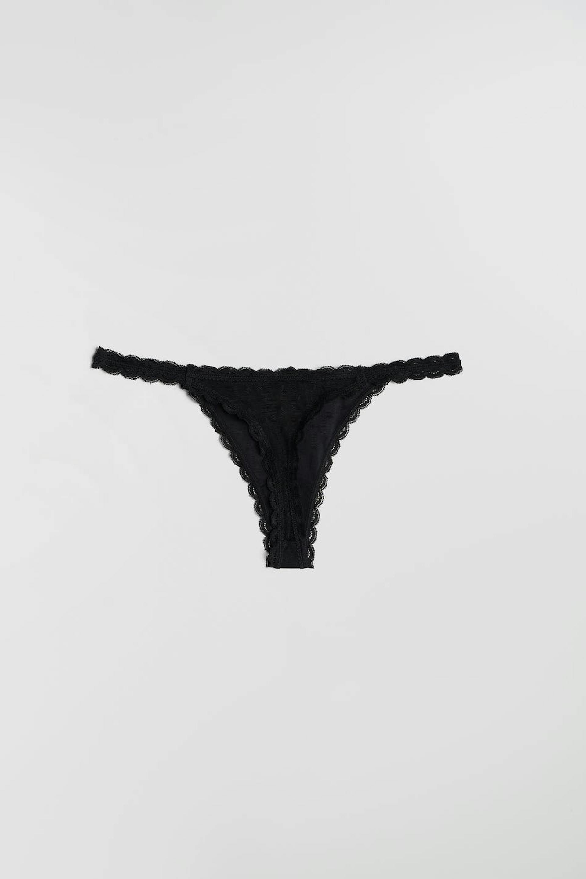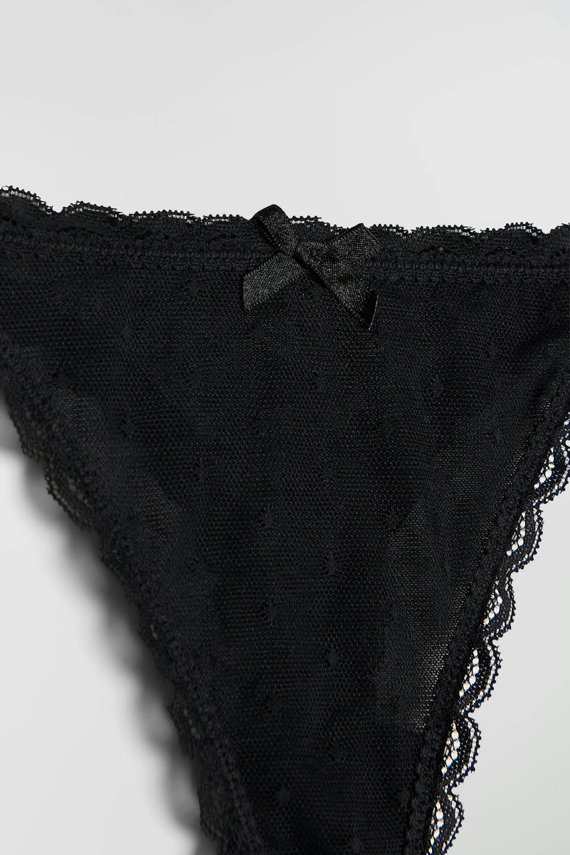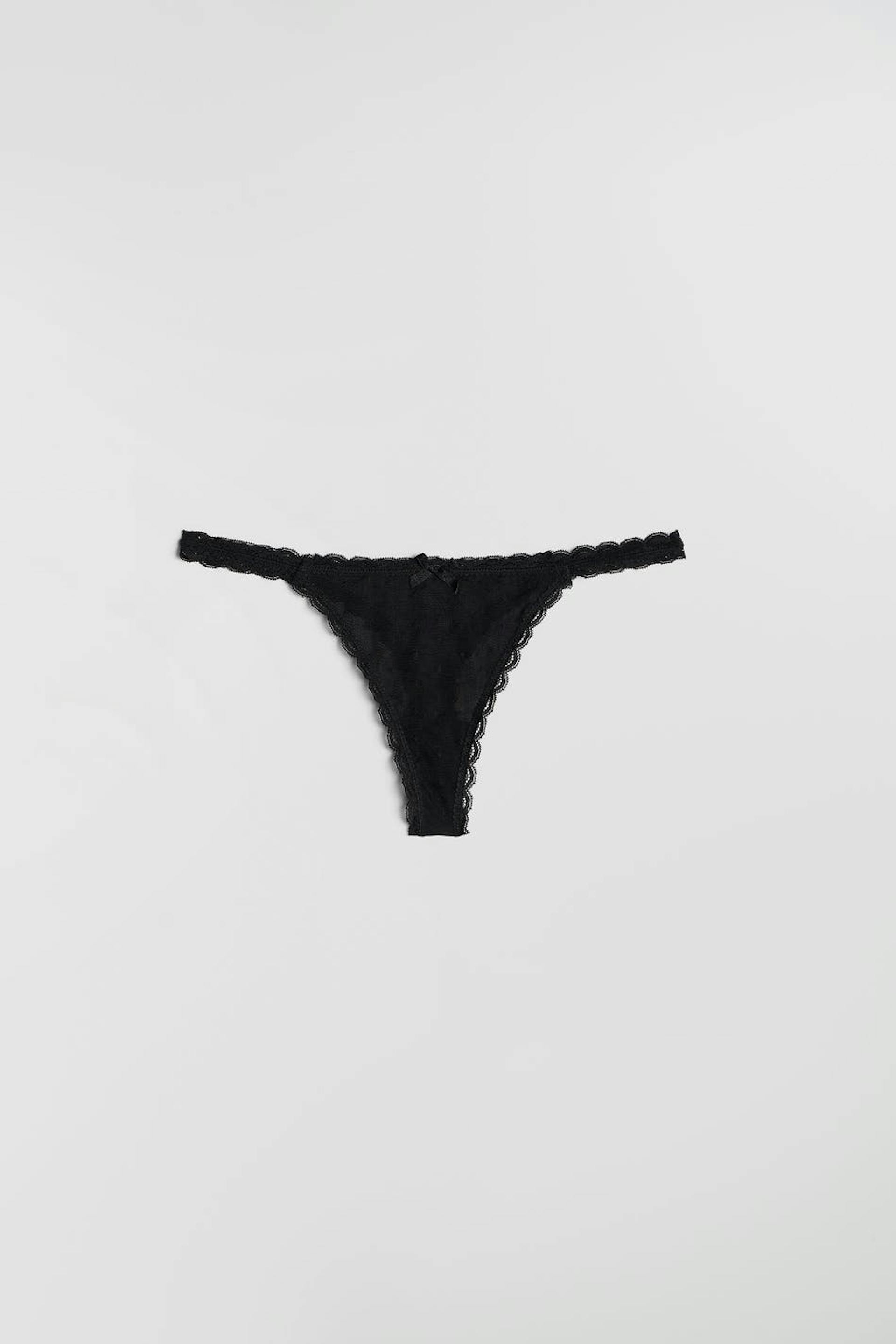 Thongs with a soft lining between the legs. The thongs are black and have thin bands in lace. They have a detail at the front with a ribbon.