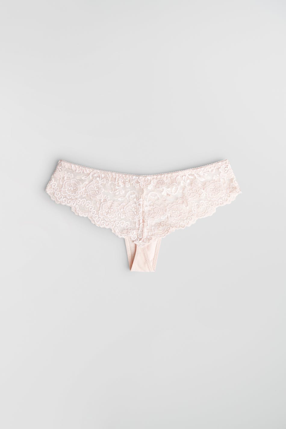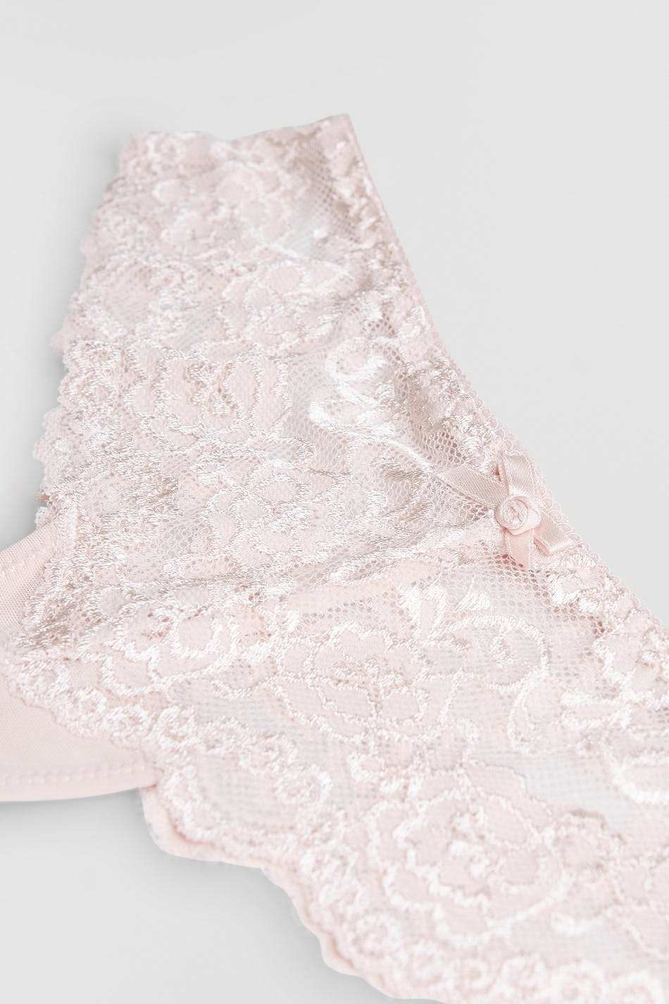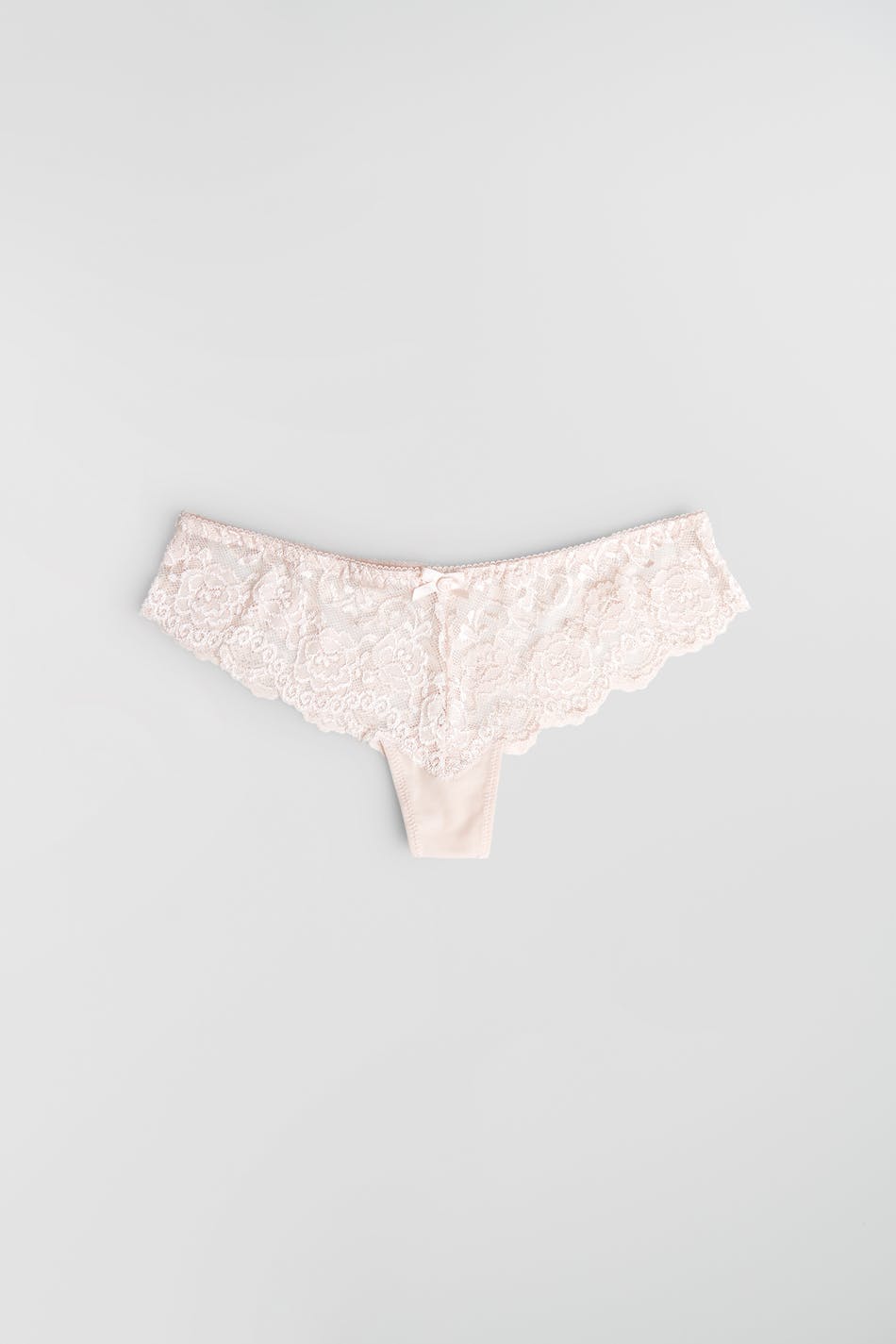 Floral thong with a lining in cotton between the legs. The thong is light pink. It is made of lace.