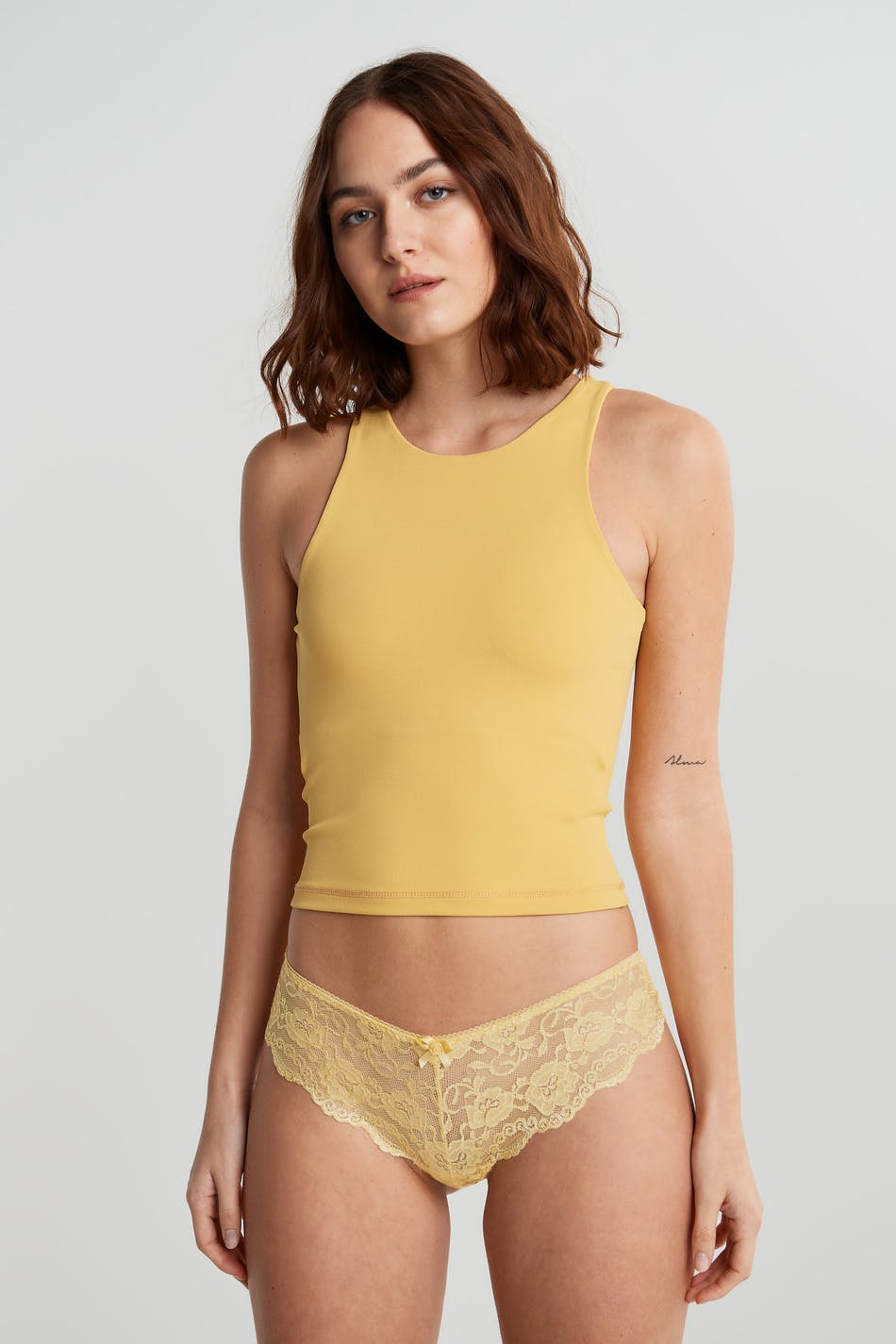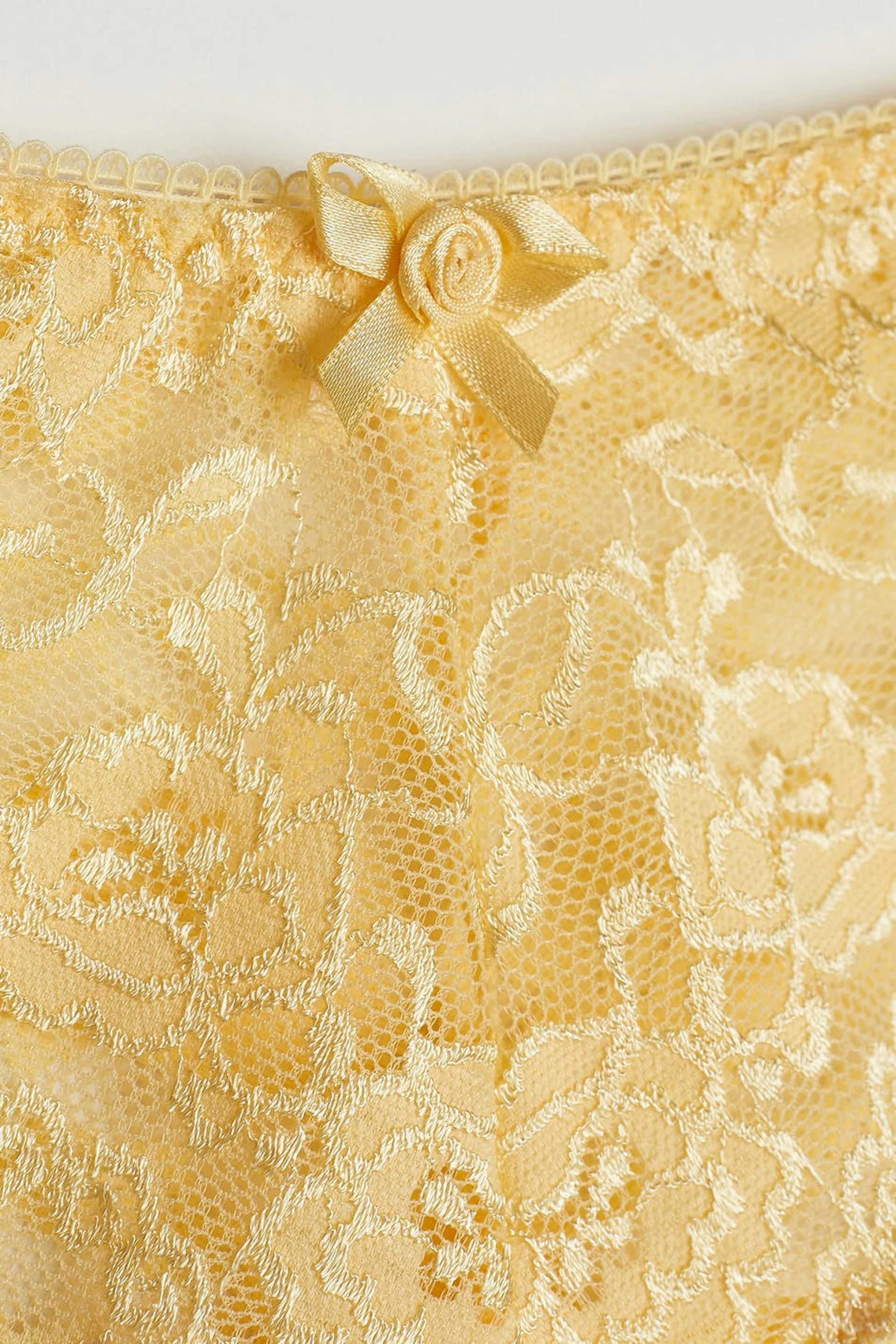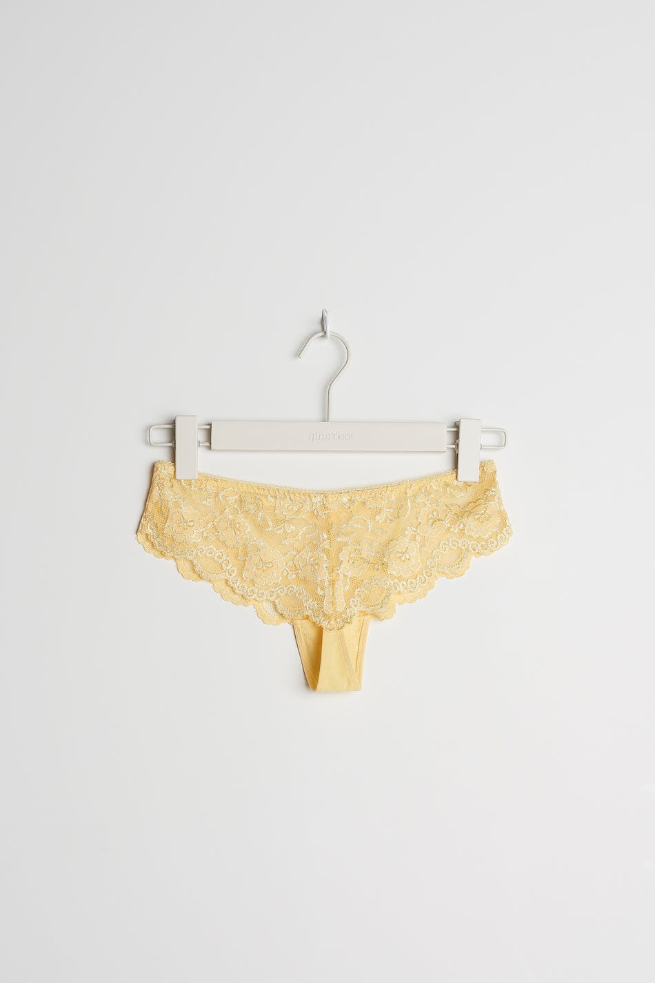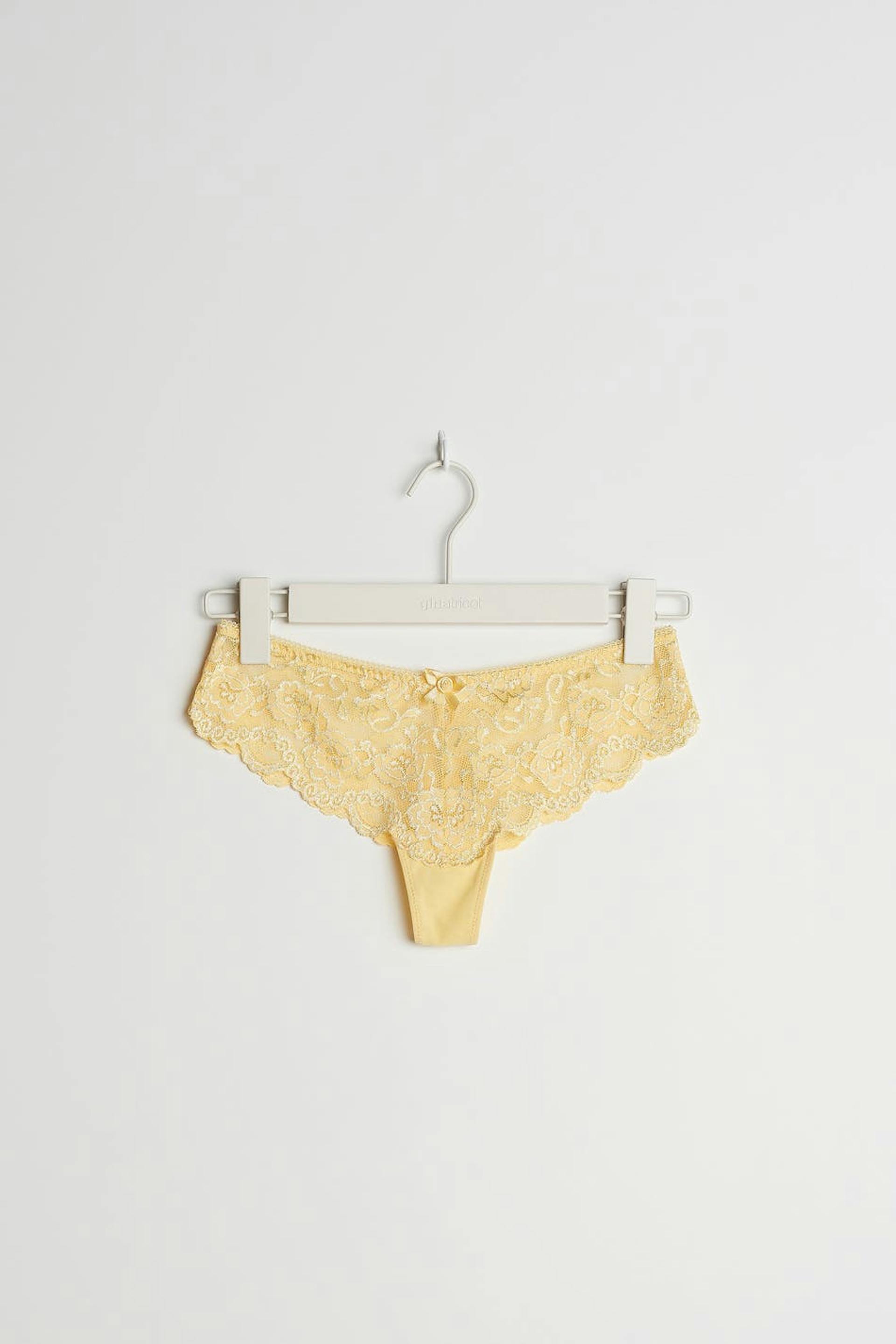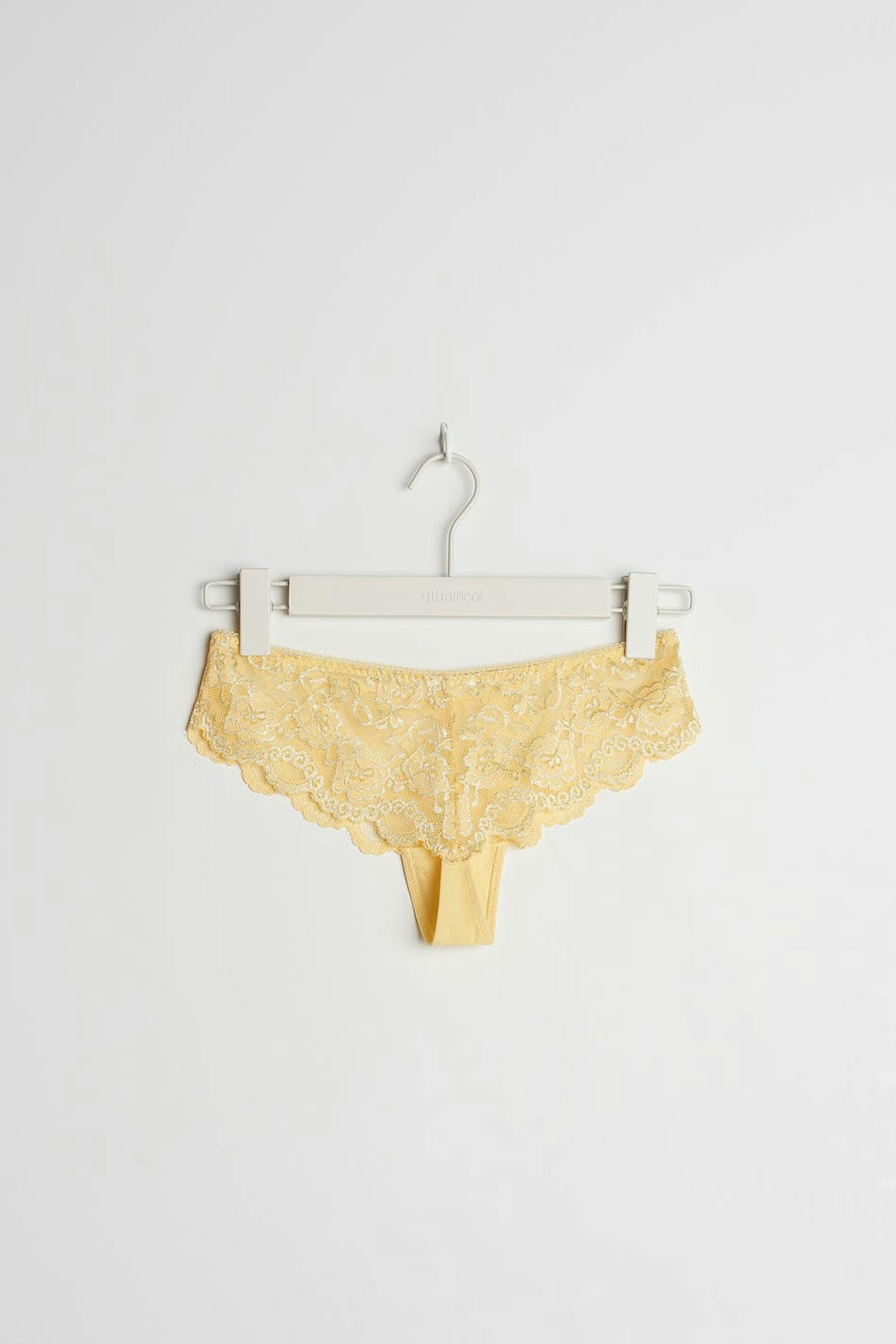 Panties with a lining in cotton between the legs. The panties are yellow. They are made of lace.