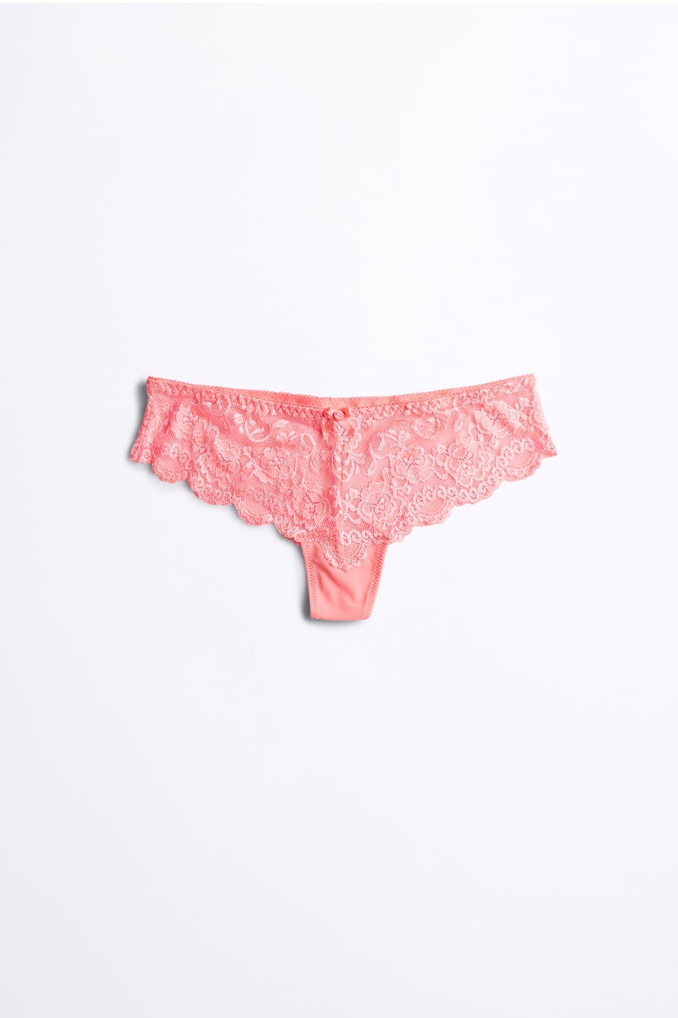 Thong with a lining in cotton between the legs. The thong is pink. It is made of lace.
