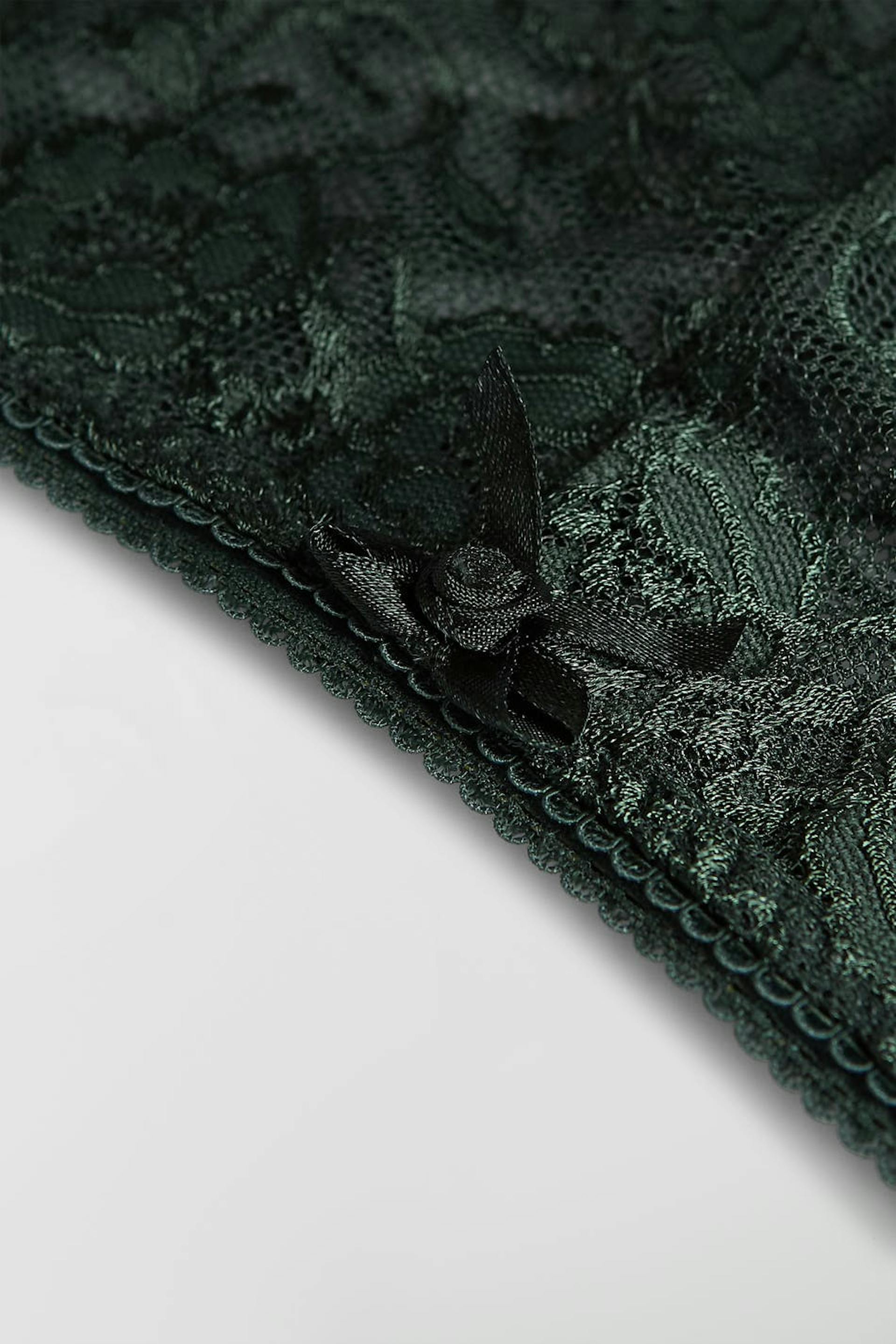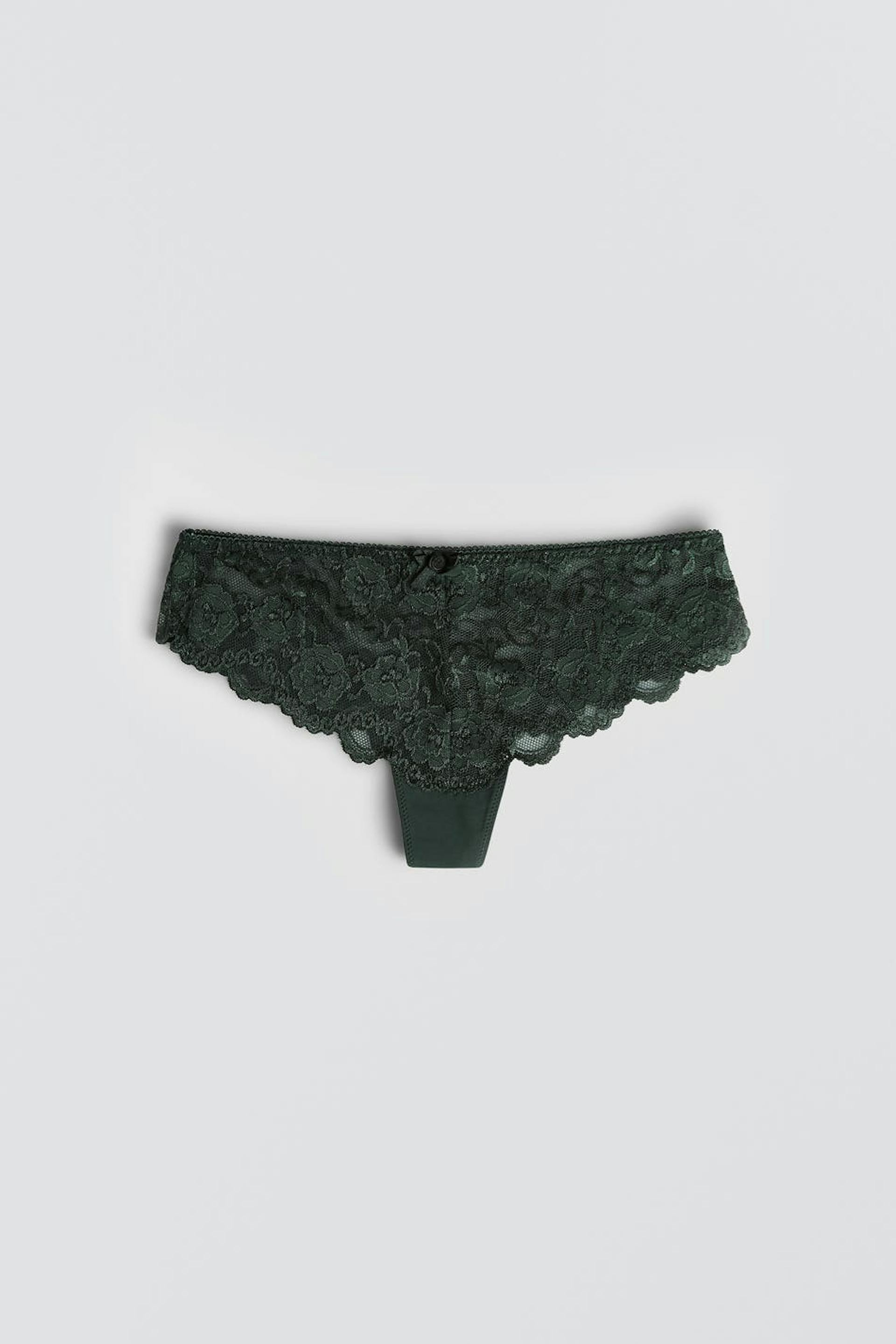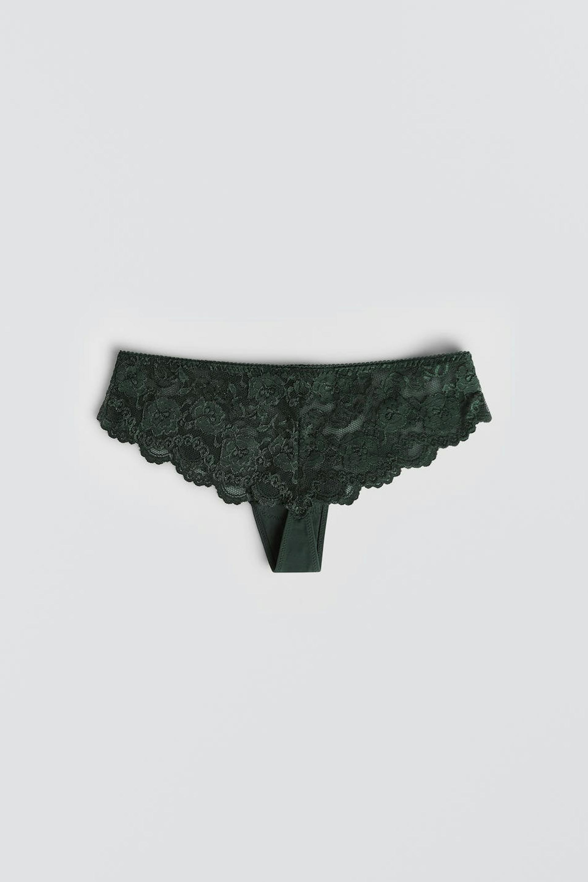 Pantie with a lining in cotton between the legs. The pantie is green. It is made of lace.