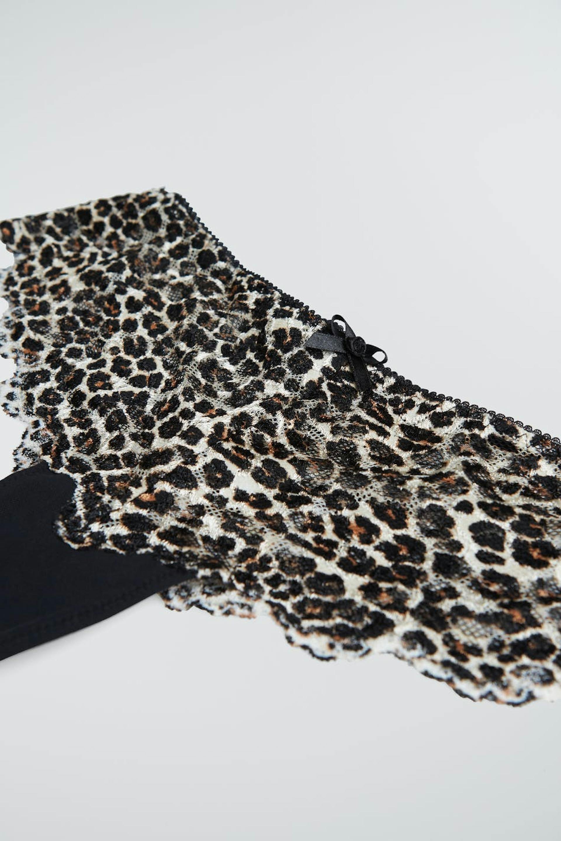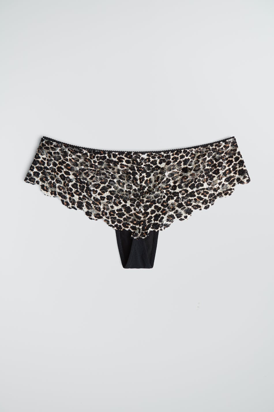 Pantie with a lining in cotton between the legs. The pantie is leopard. It is made of lace.