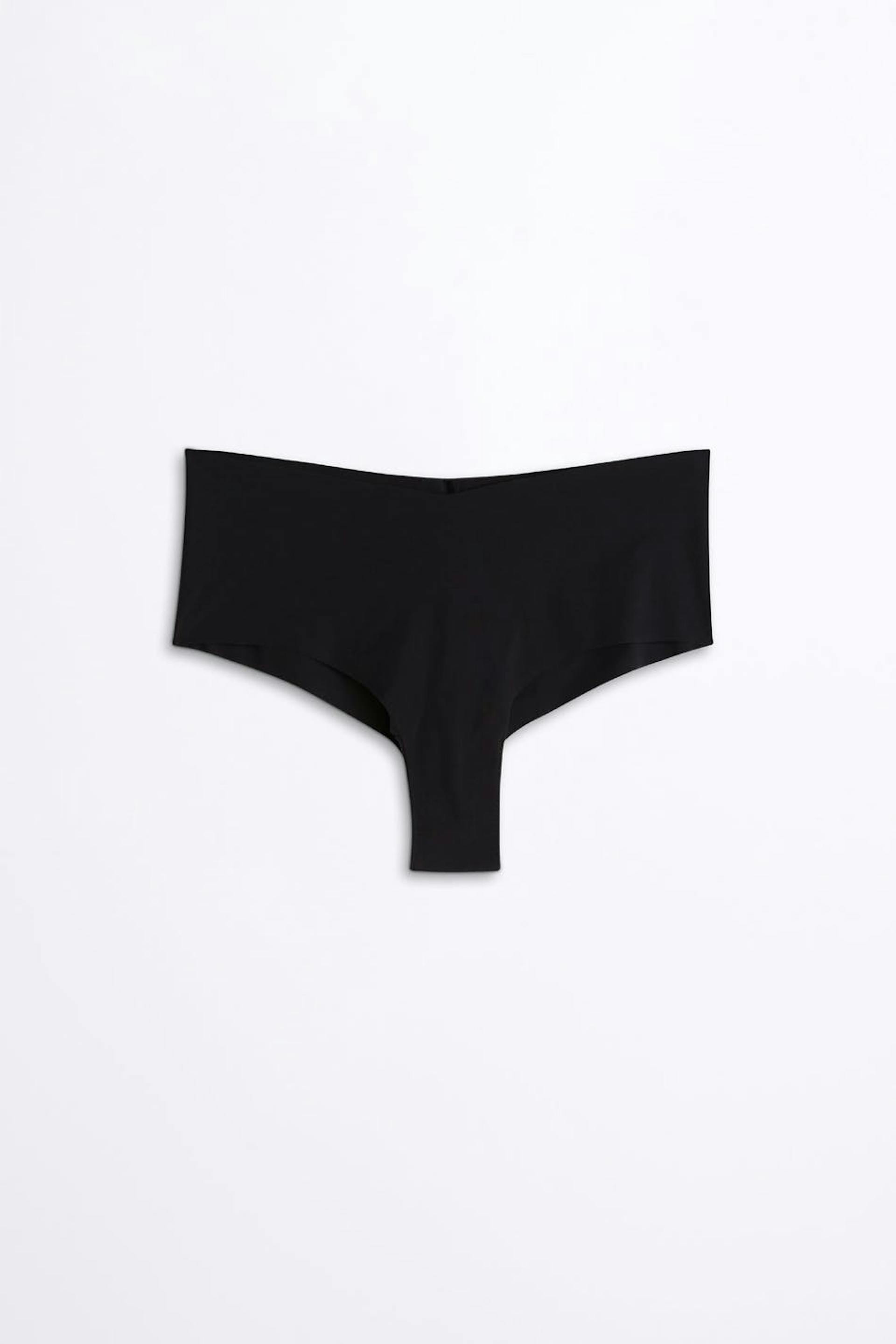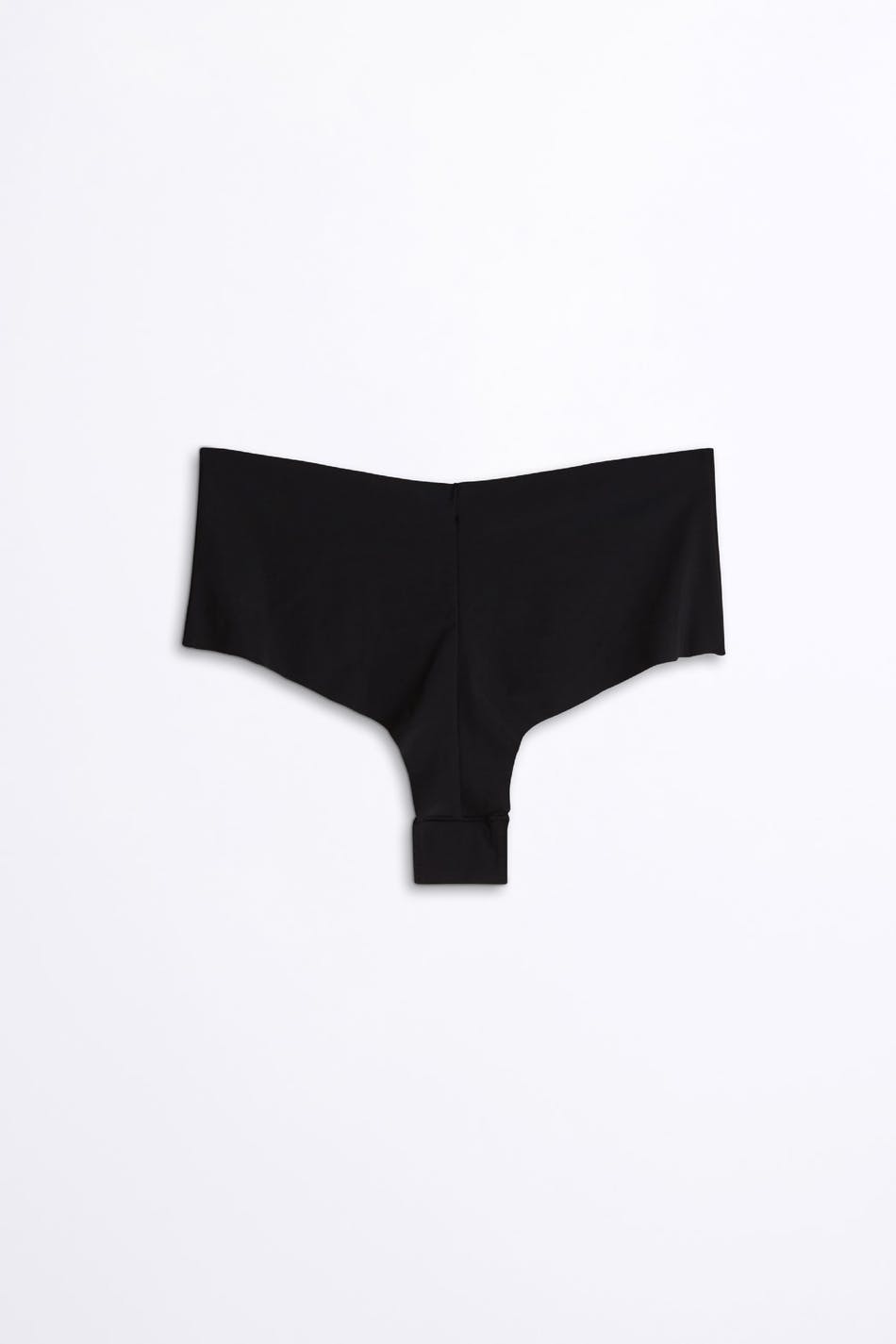 Brazilian pantie with a lining in cotton between the legs. The pantie is black. It is made of microfiber.