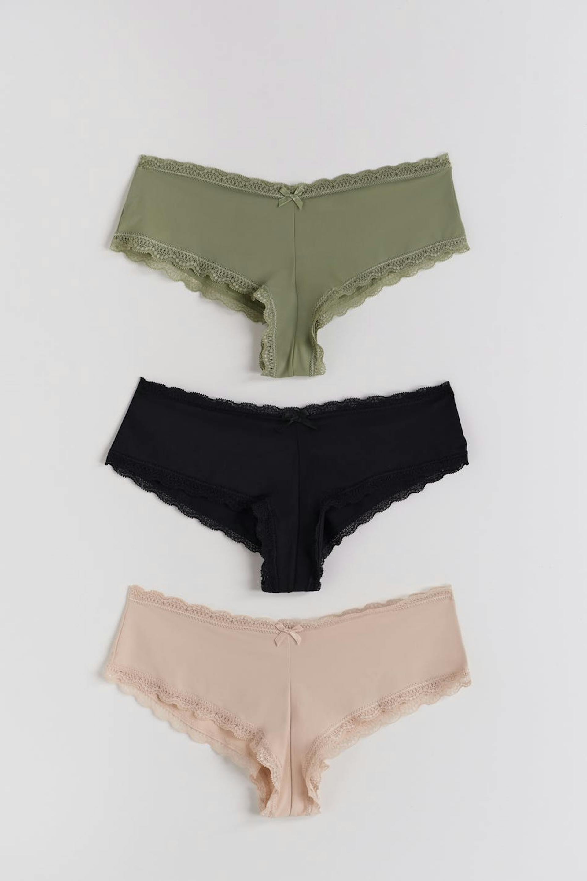 3-pack Brazilian panties with lace edges. The Brazilian panties are black.