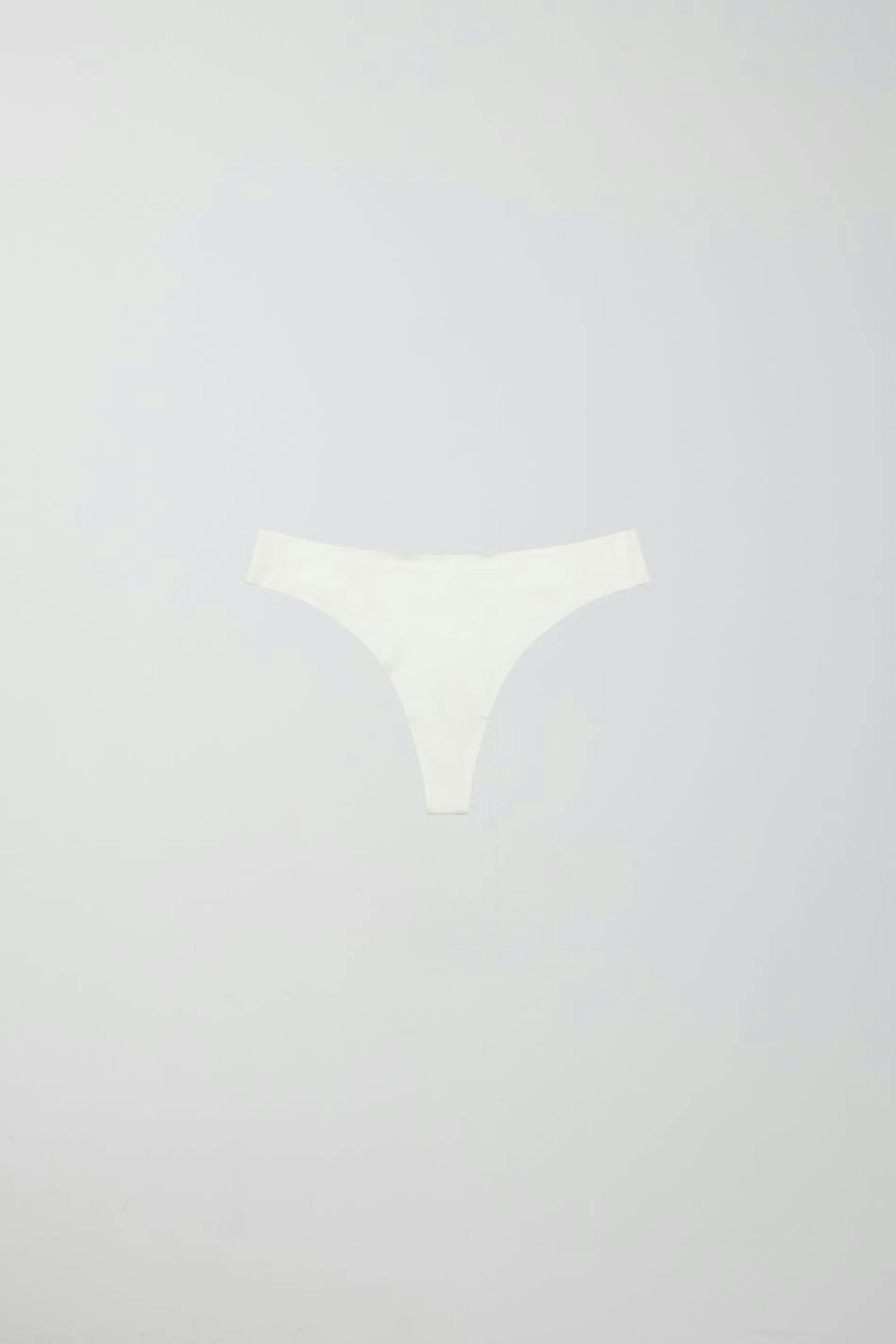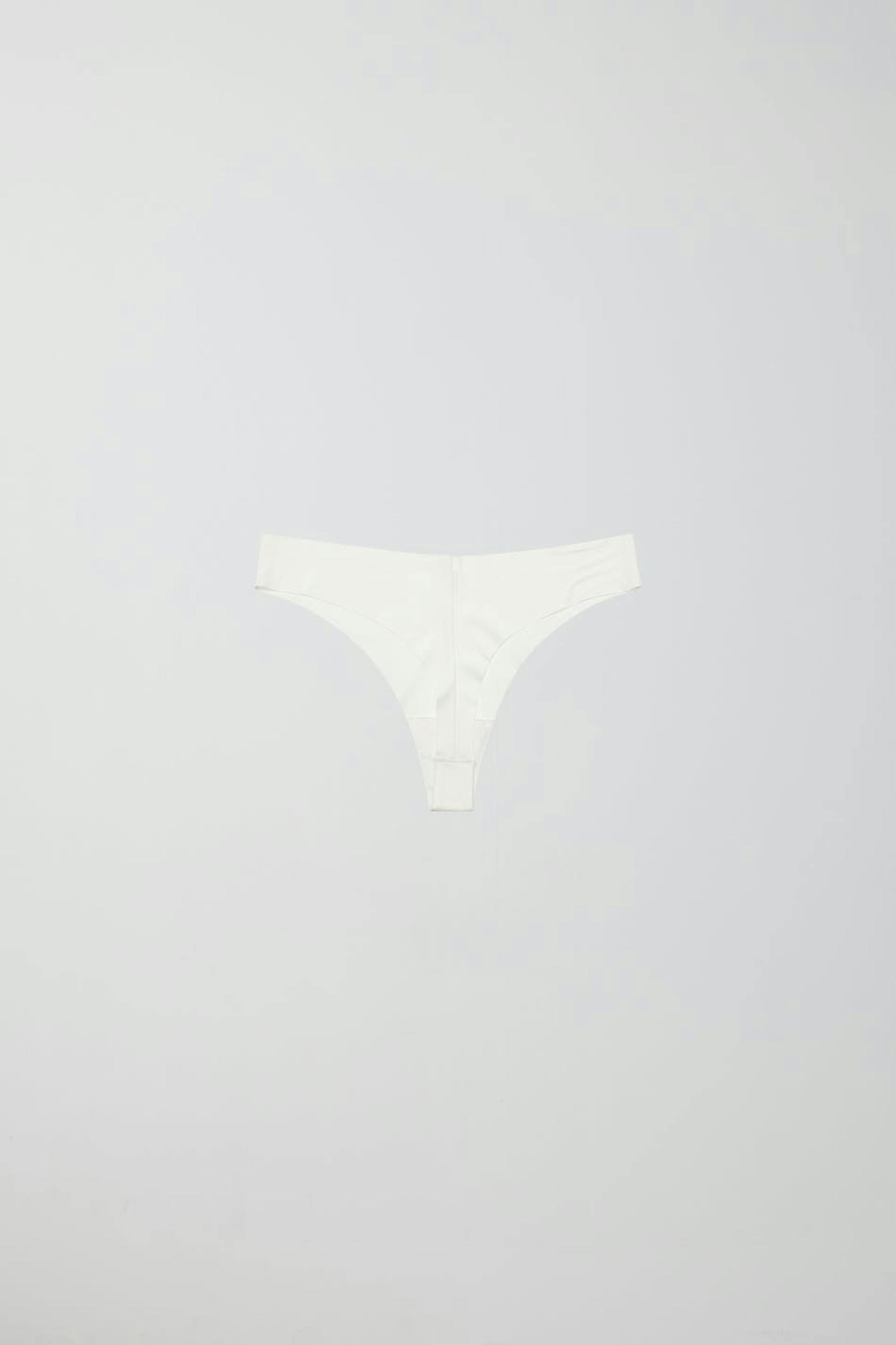 Thongs in microfiber with raw edges. The thongs are white and have crotch lining in cotton.