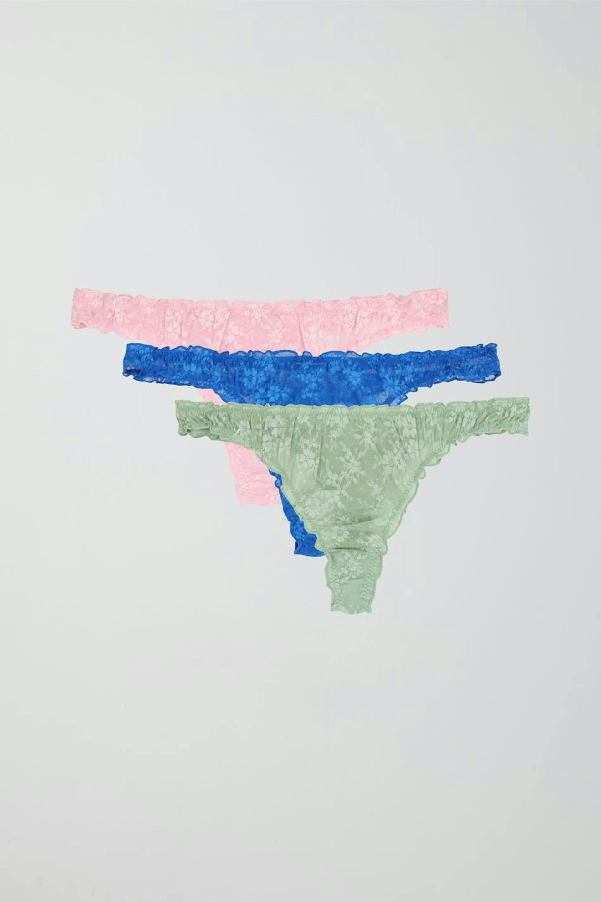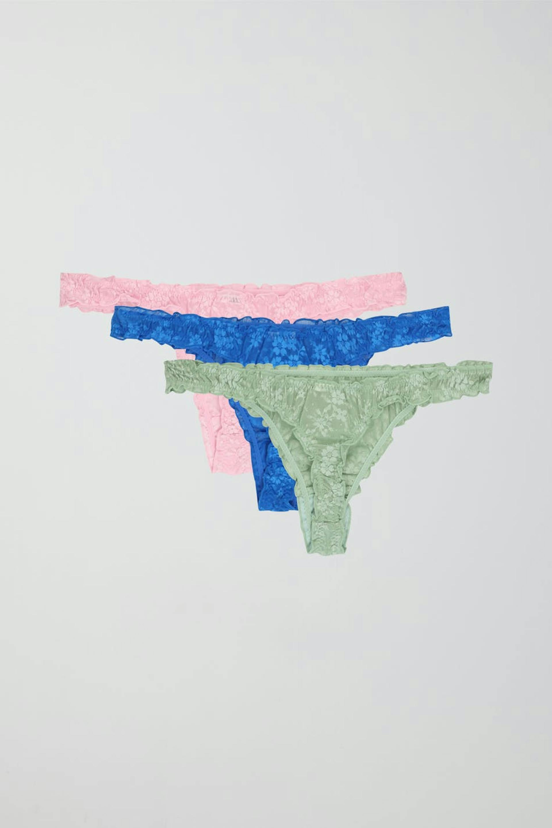 3-pack thong with a ruffled edge. The thong is pink and has a crotch lining in cotton.