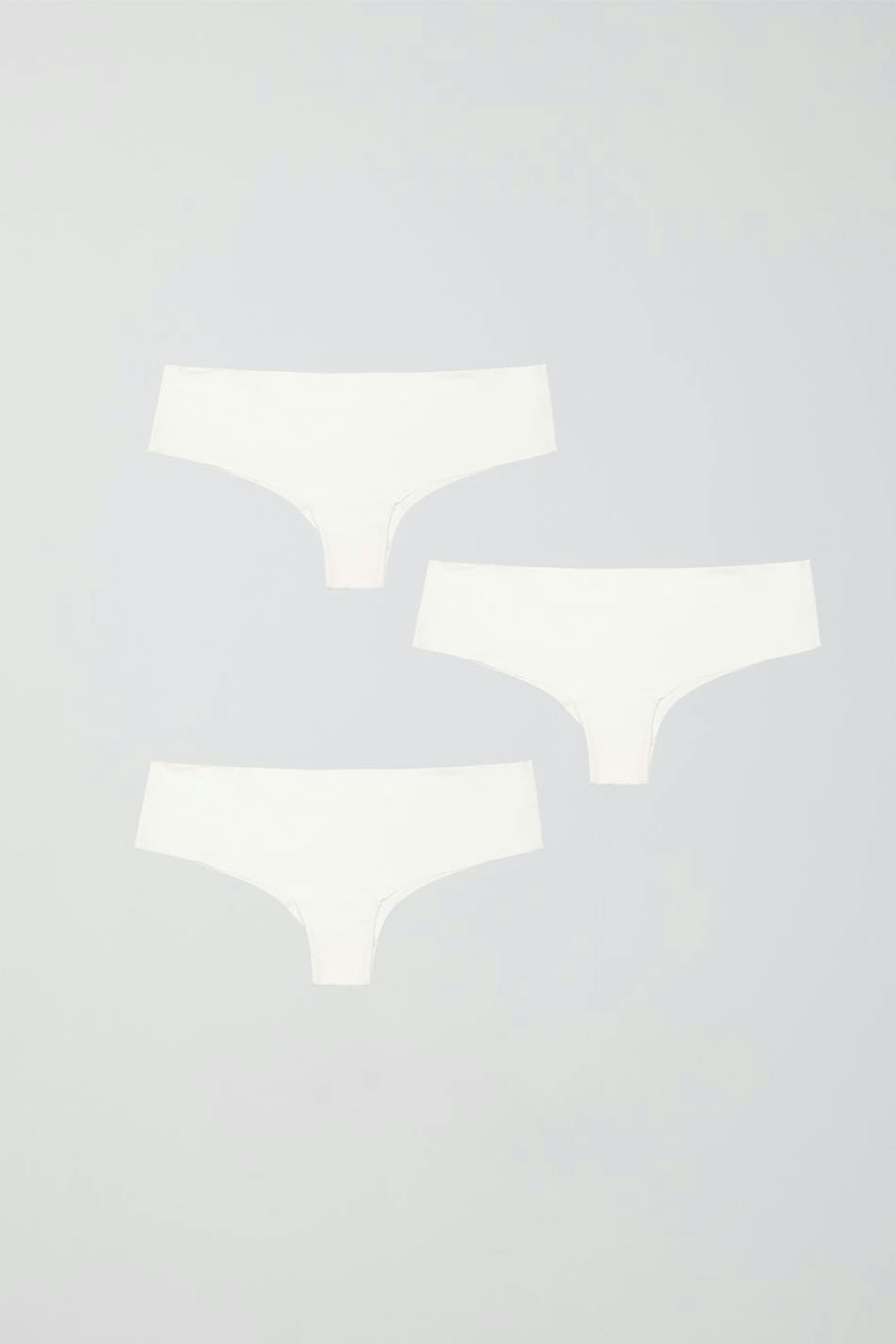 Brazilian panties in microfiber with raw edges. The Brazilian panties are white and have crotch lining.