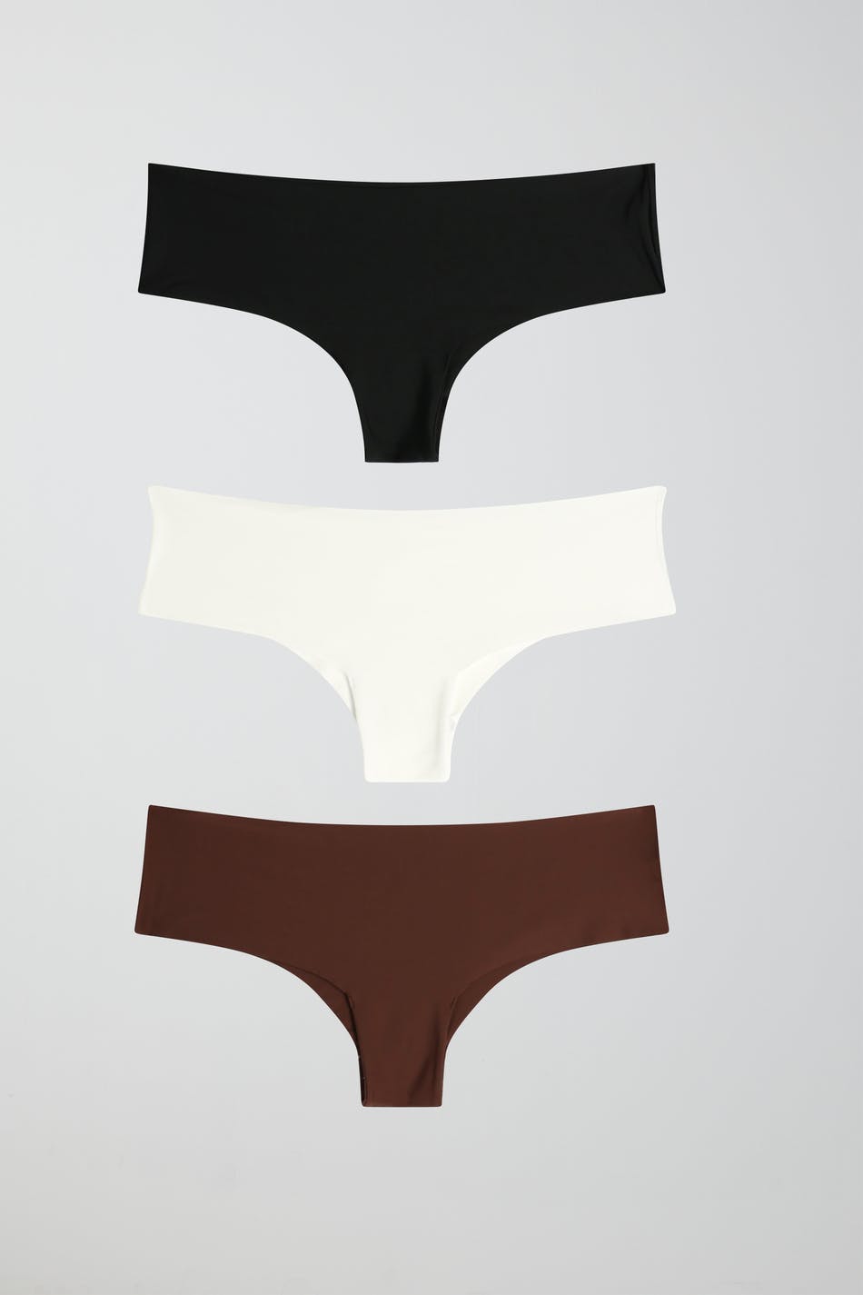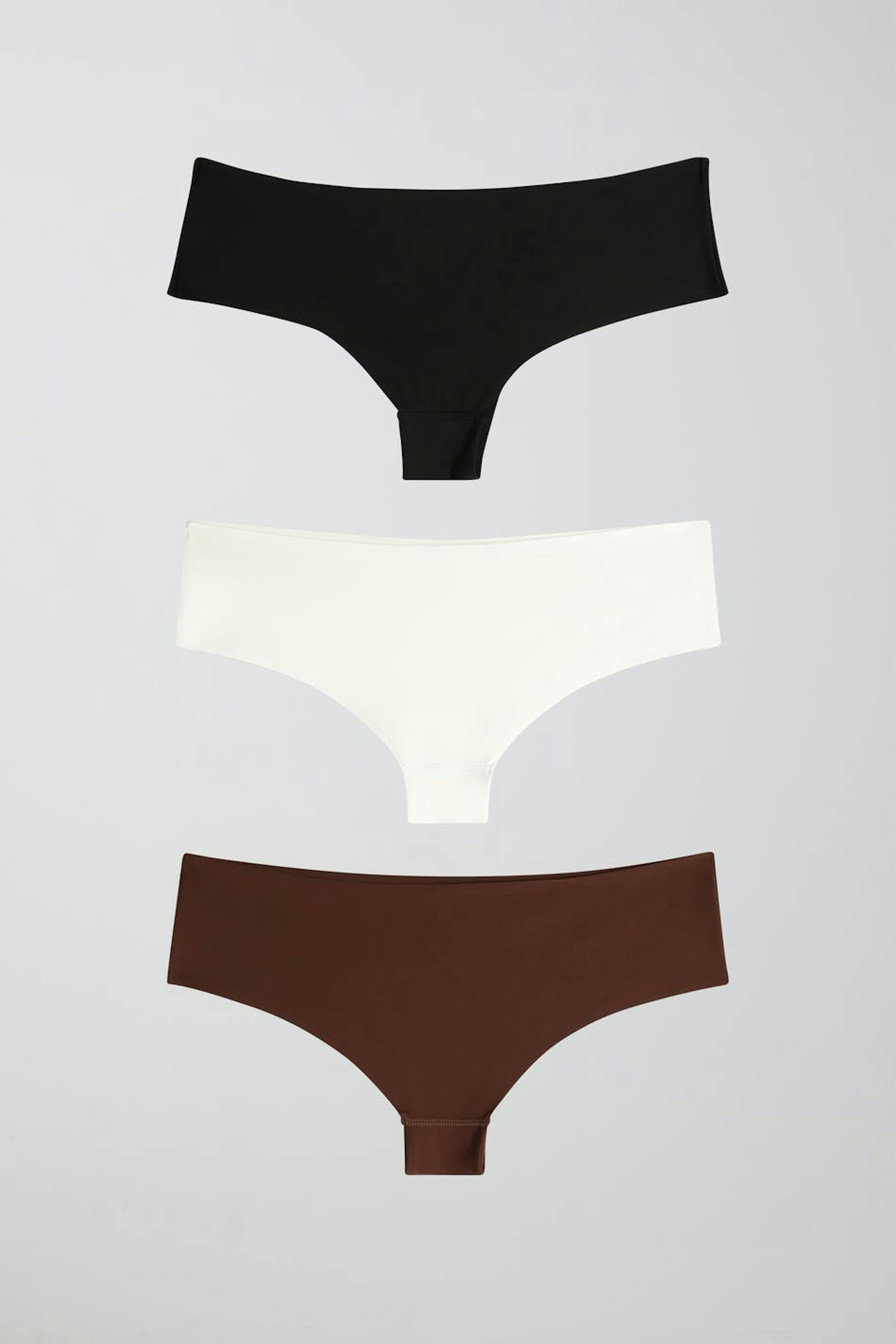 Brazilian panties in microfiber with raw edges. The Brazilian panties are white, black and brown. They have crotch lining.