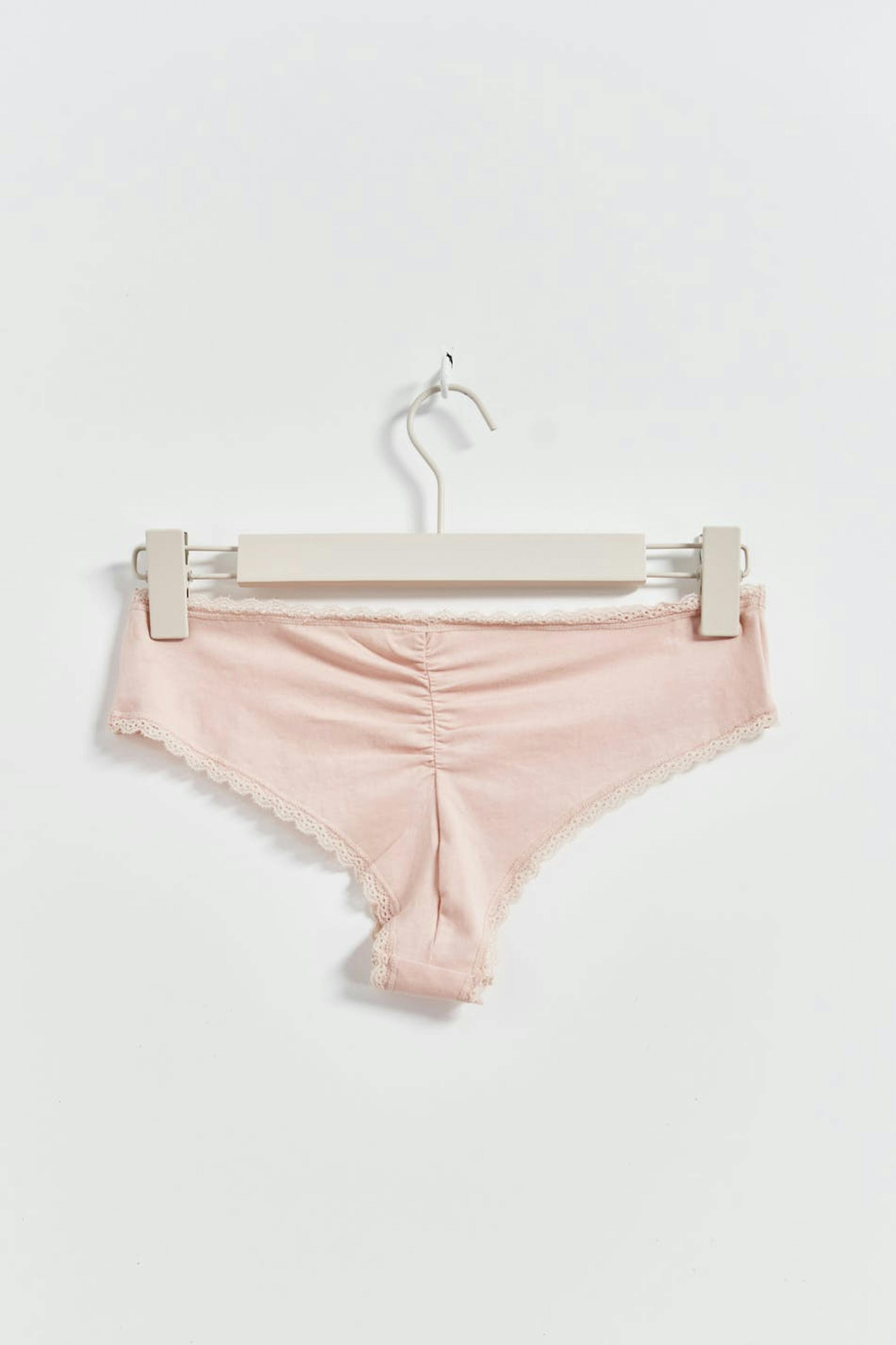 Waist Rise: Mid waist Fit: Figure hugging Detail: Ruched, Bow Additional Description: Picot edge, ruched on the back , bow on the front