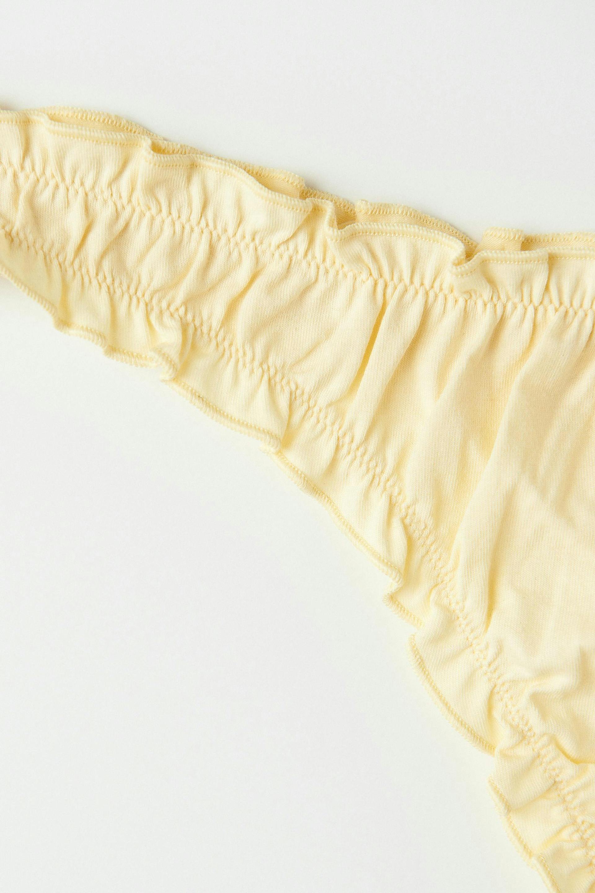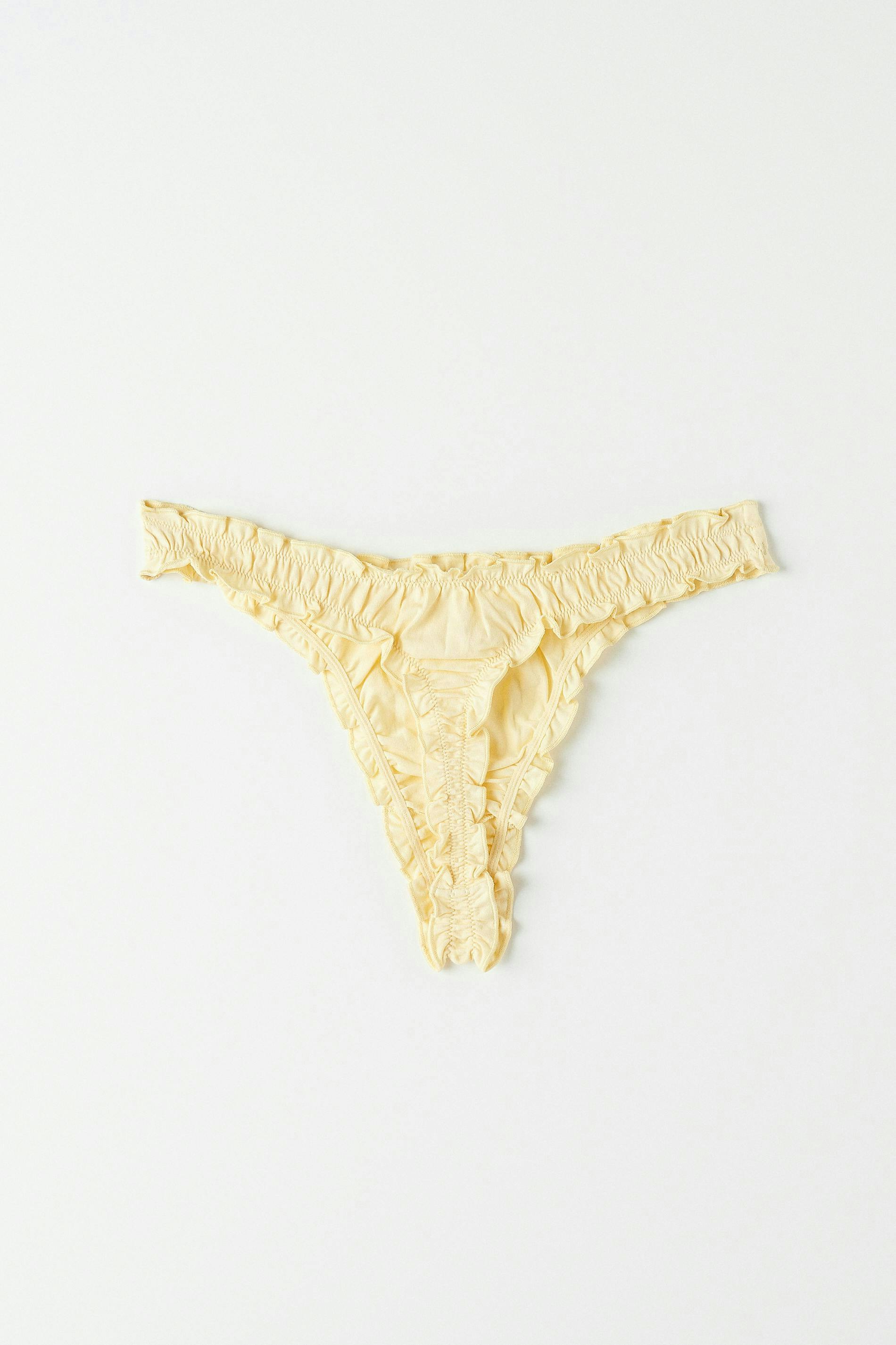 Thongs in cotton with ruffled edges. The thongs are yellow and have a lined crotch.