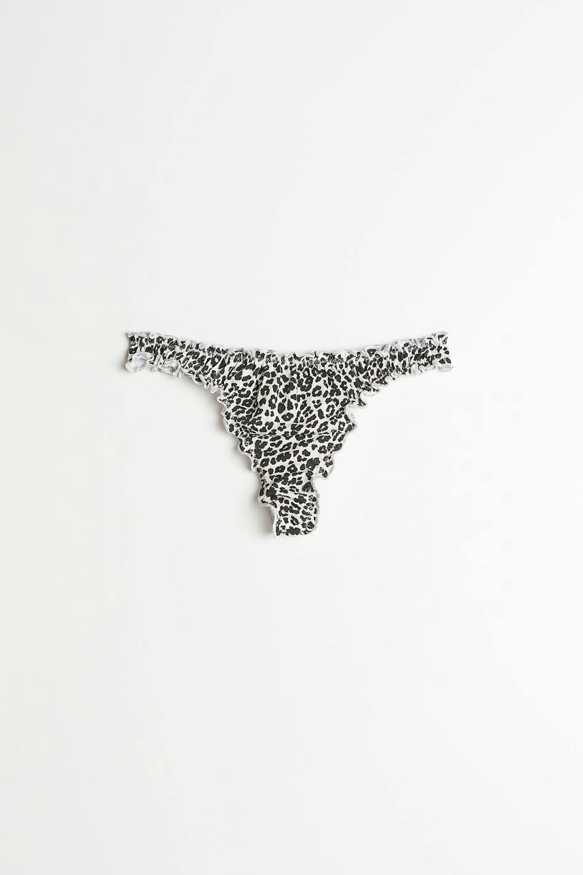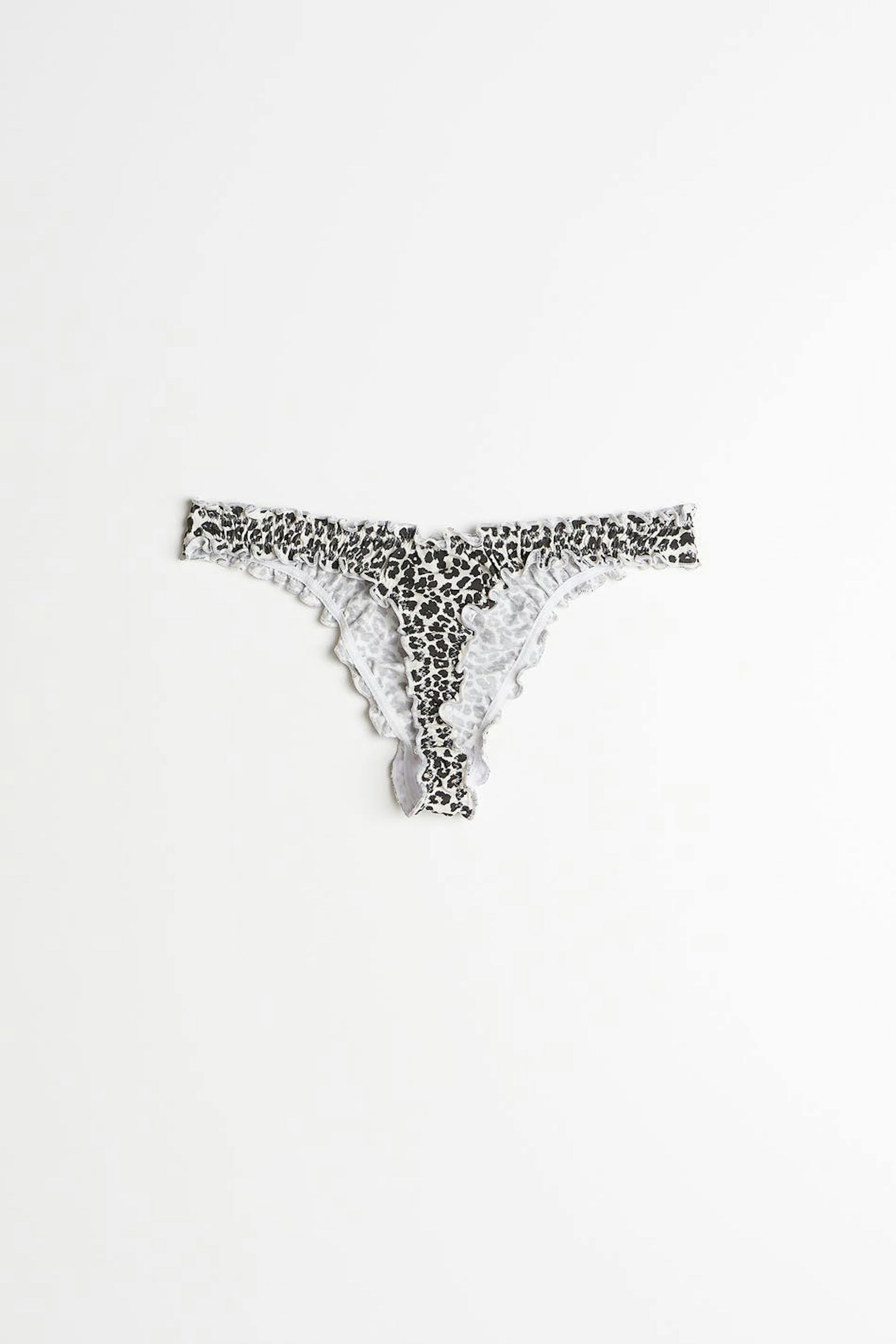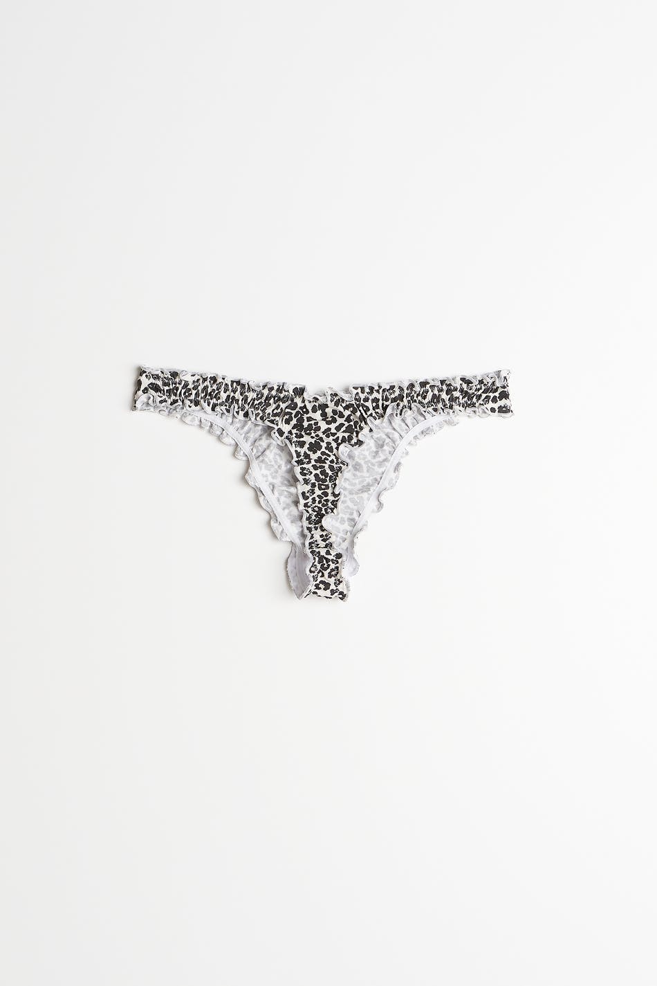 Leopard patterned thongs with frills. The thongs are brown and have a lined crotch in cotton.