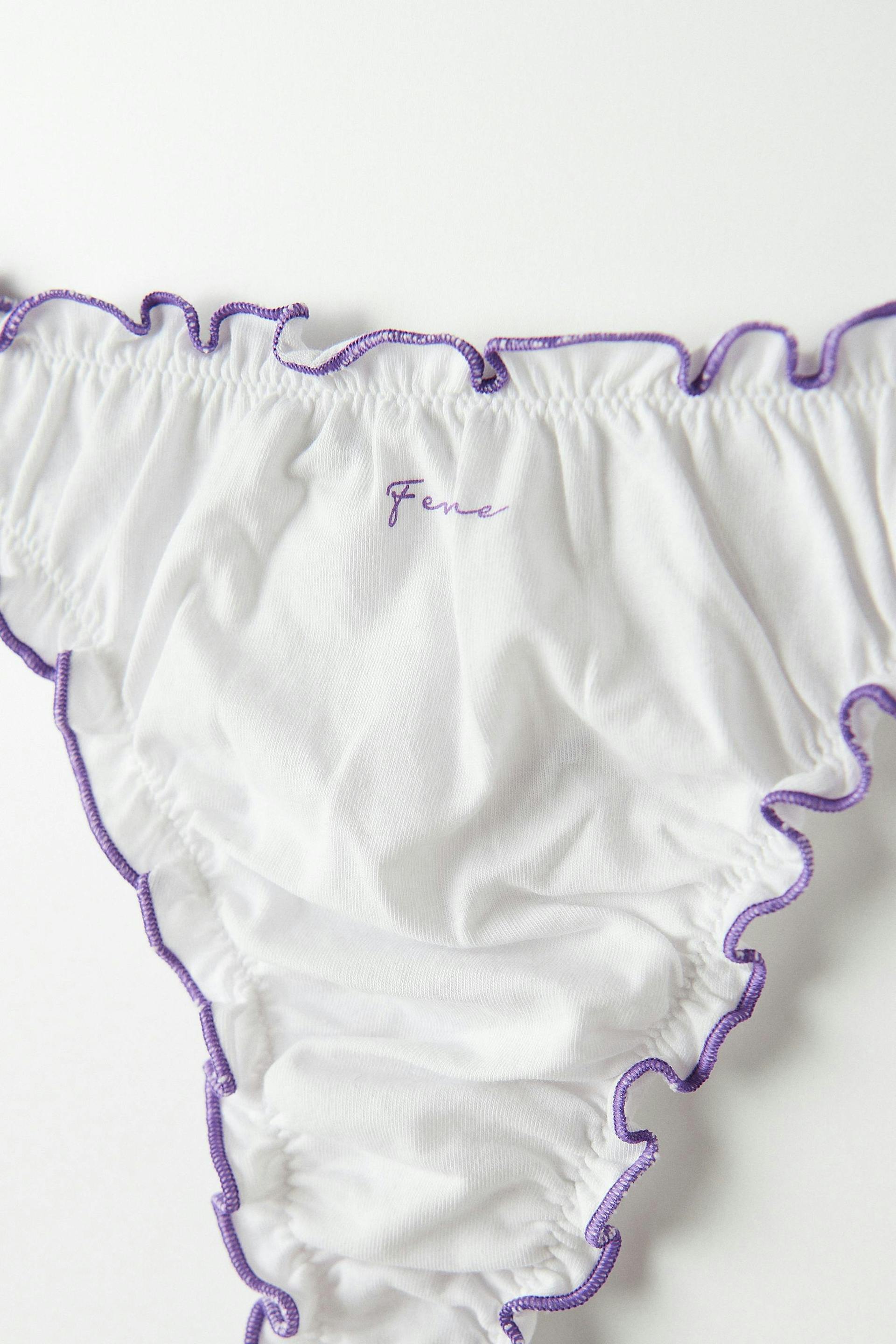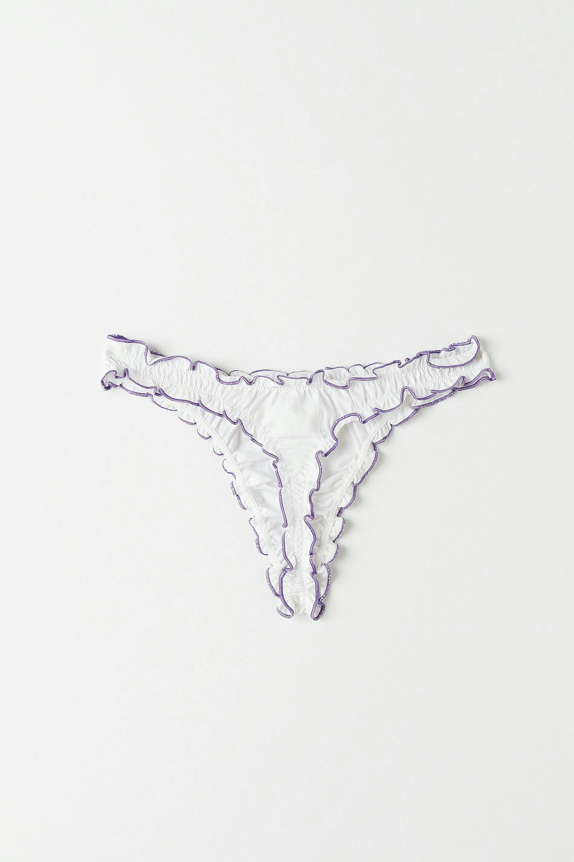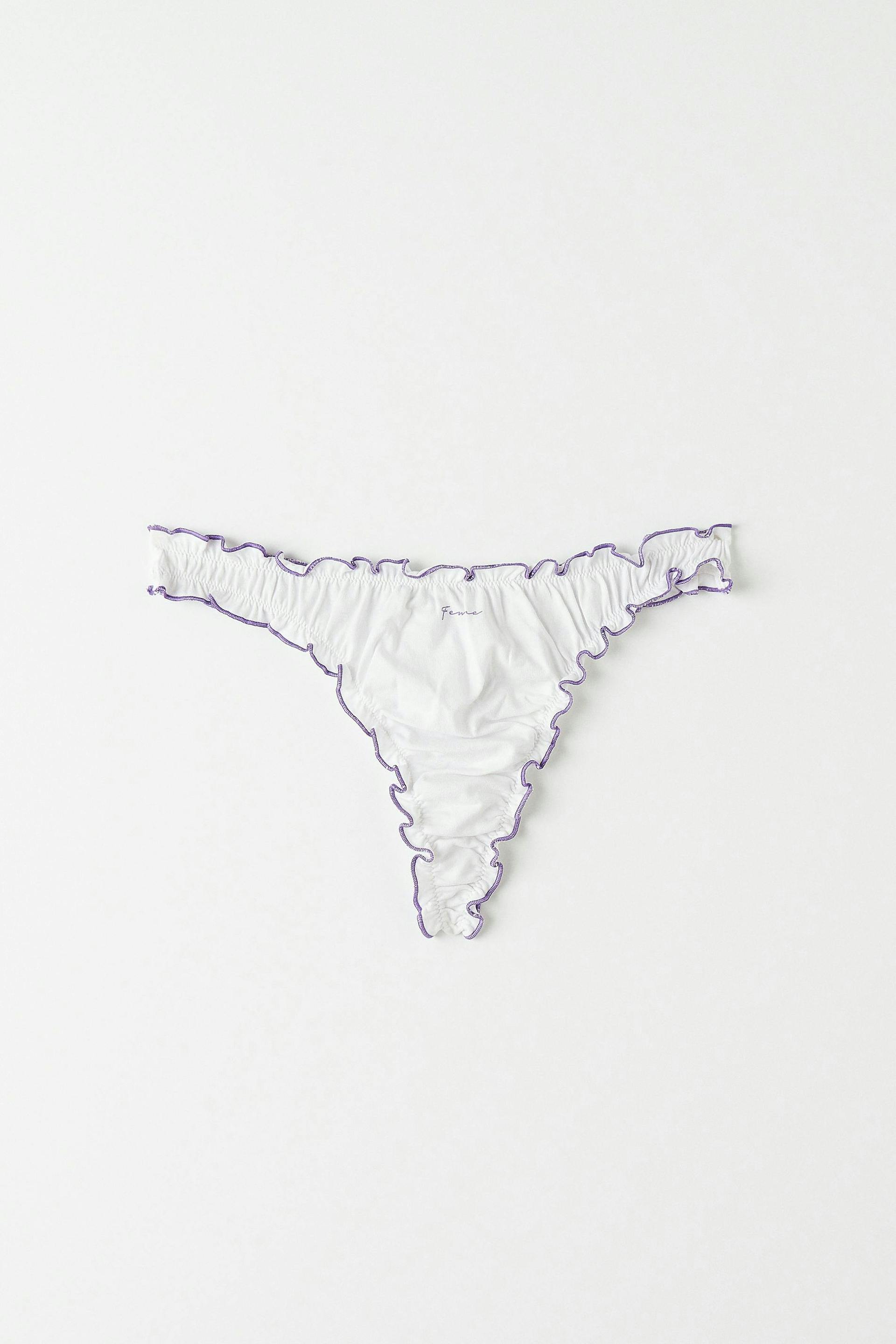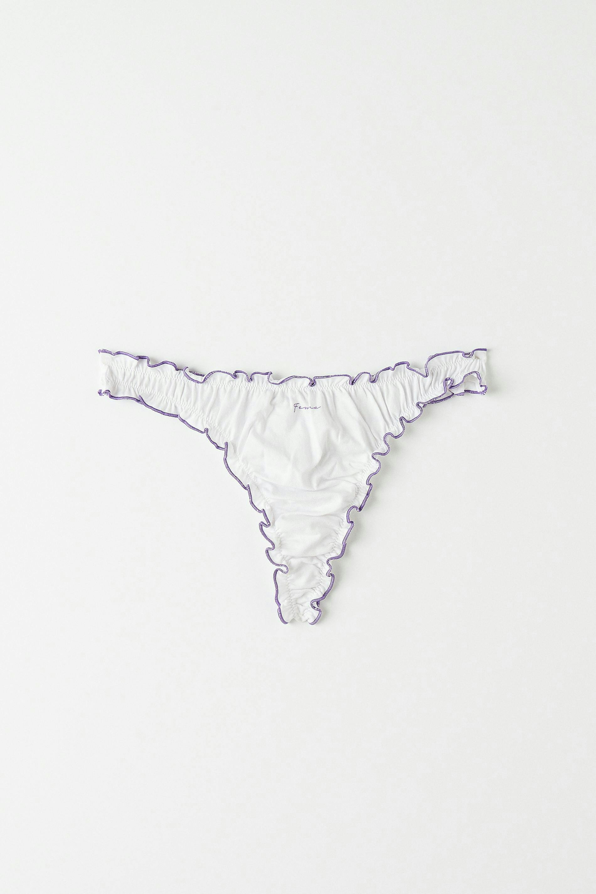 Thongs in cotton with ruffled edges. The thongs are purple and have a lined crotch.